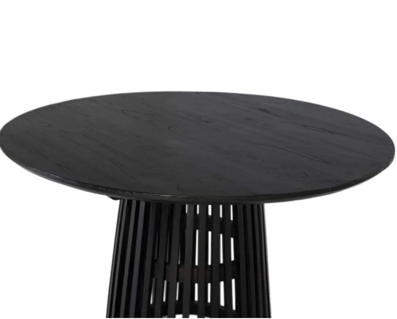 Con un diseño contemporáneo, esta mesa redonda de comedor está fabricada en madera maciza de mindi con acabado en color wengué, un tono oscuro que aporta estilo y personalidad a cualquier espacio. Su presencia añade un aire sofisticado y atemporal.