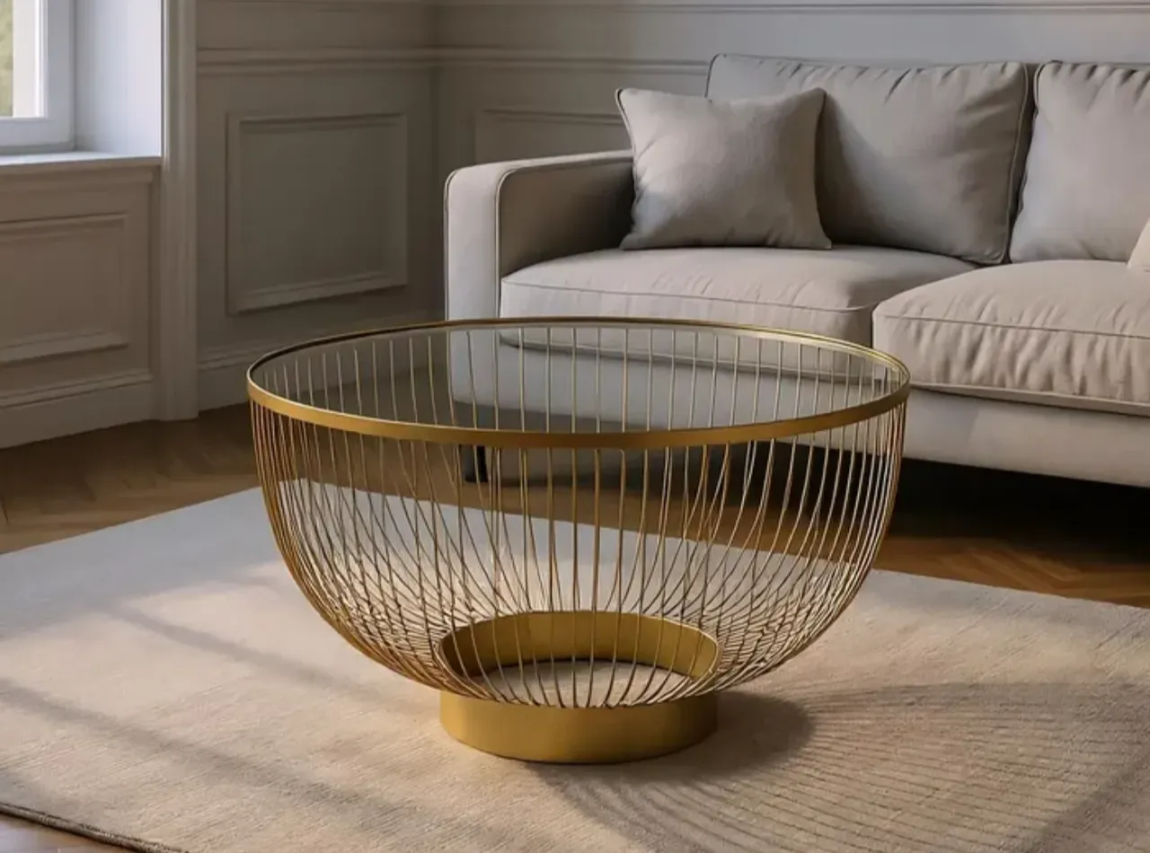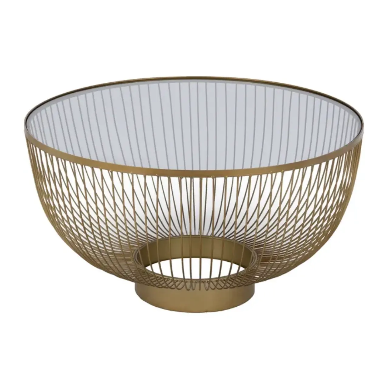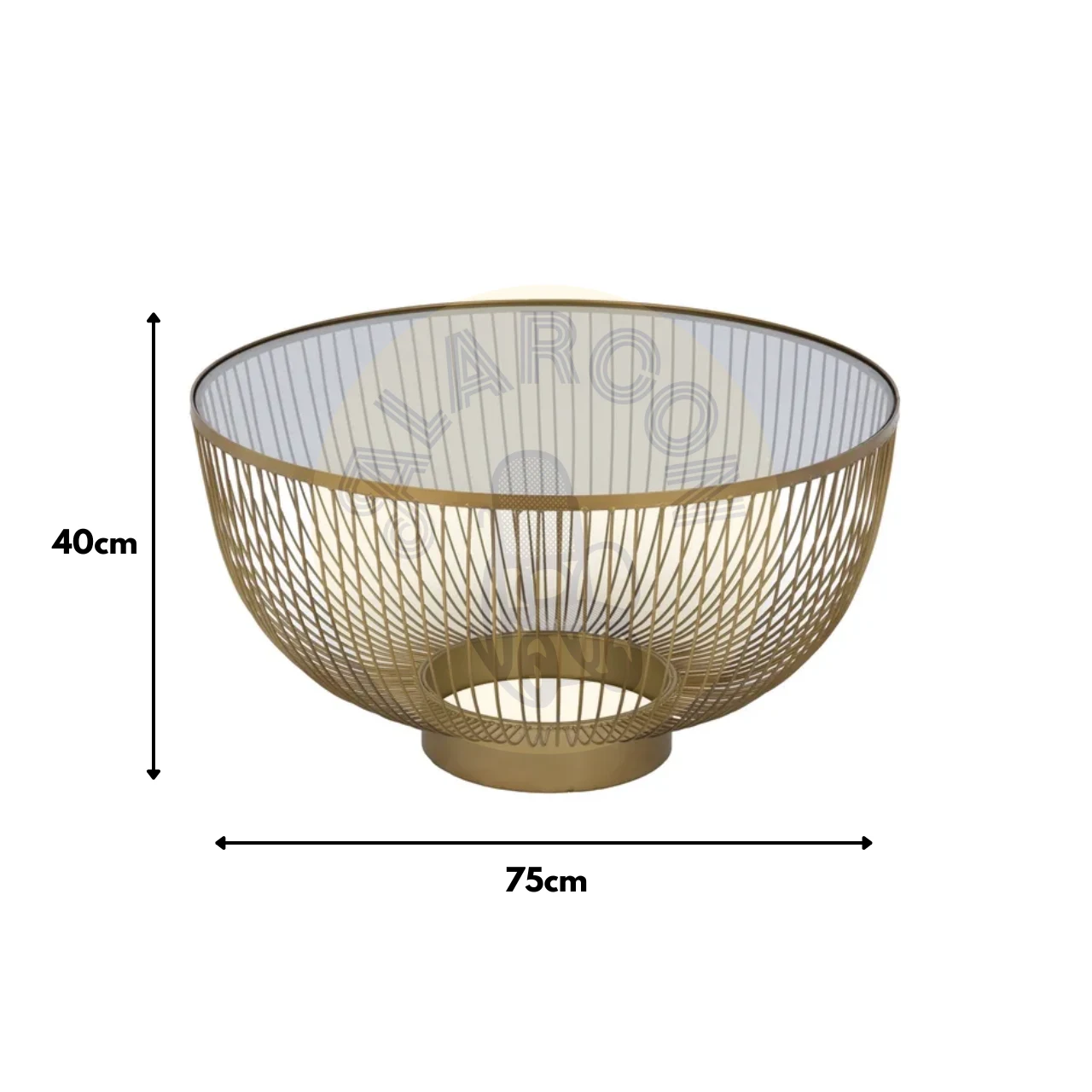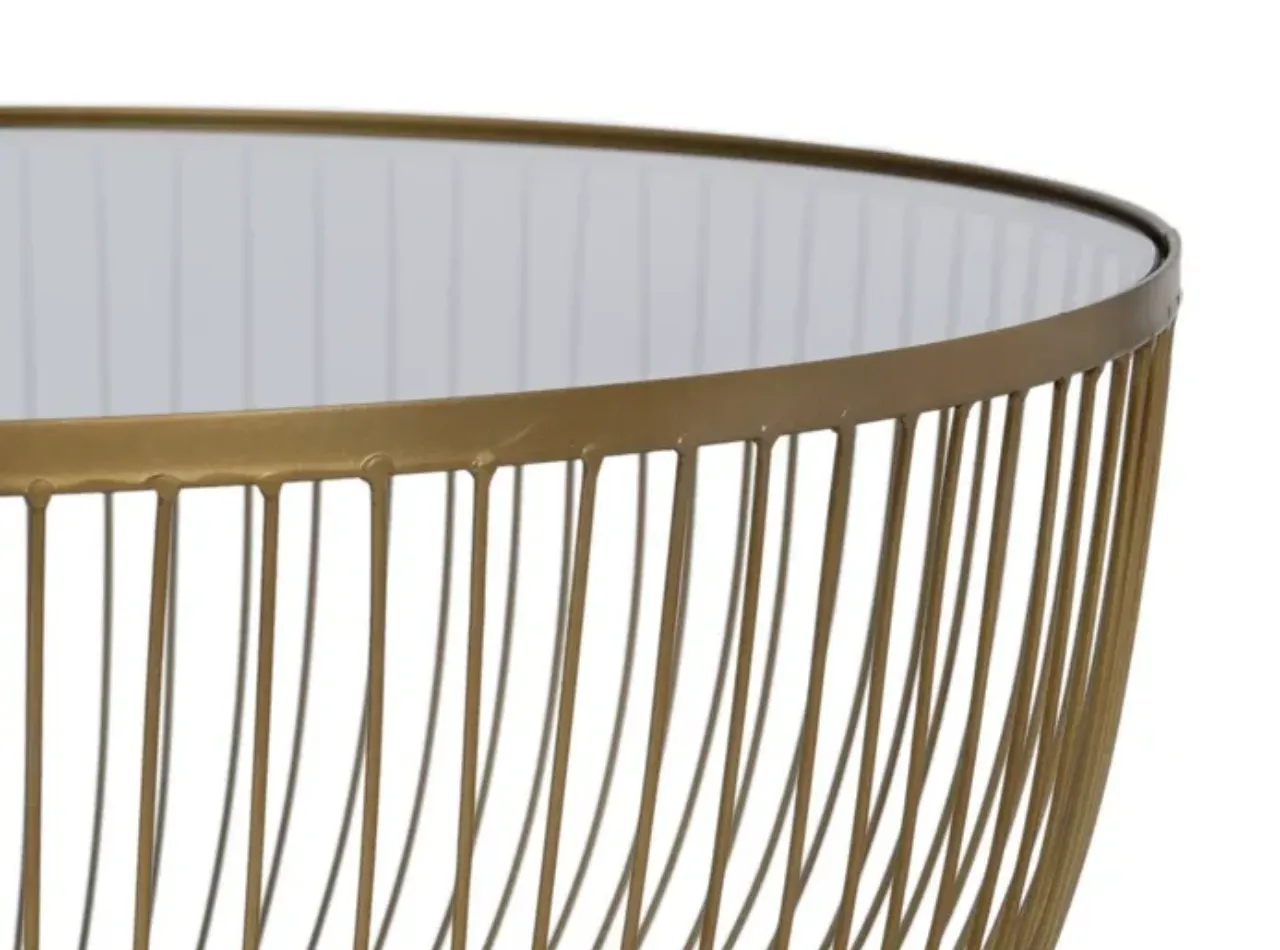 Esta mesa de centro en color oro combina la resistencia del hierro con la elegancia del cristal, creando un diseño sofisticado que aporta luminosidad y estilo al salón.