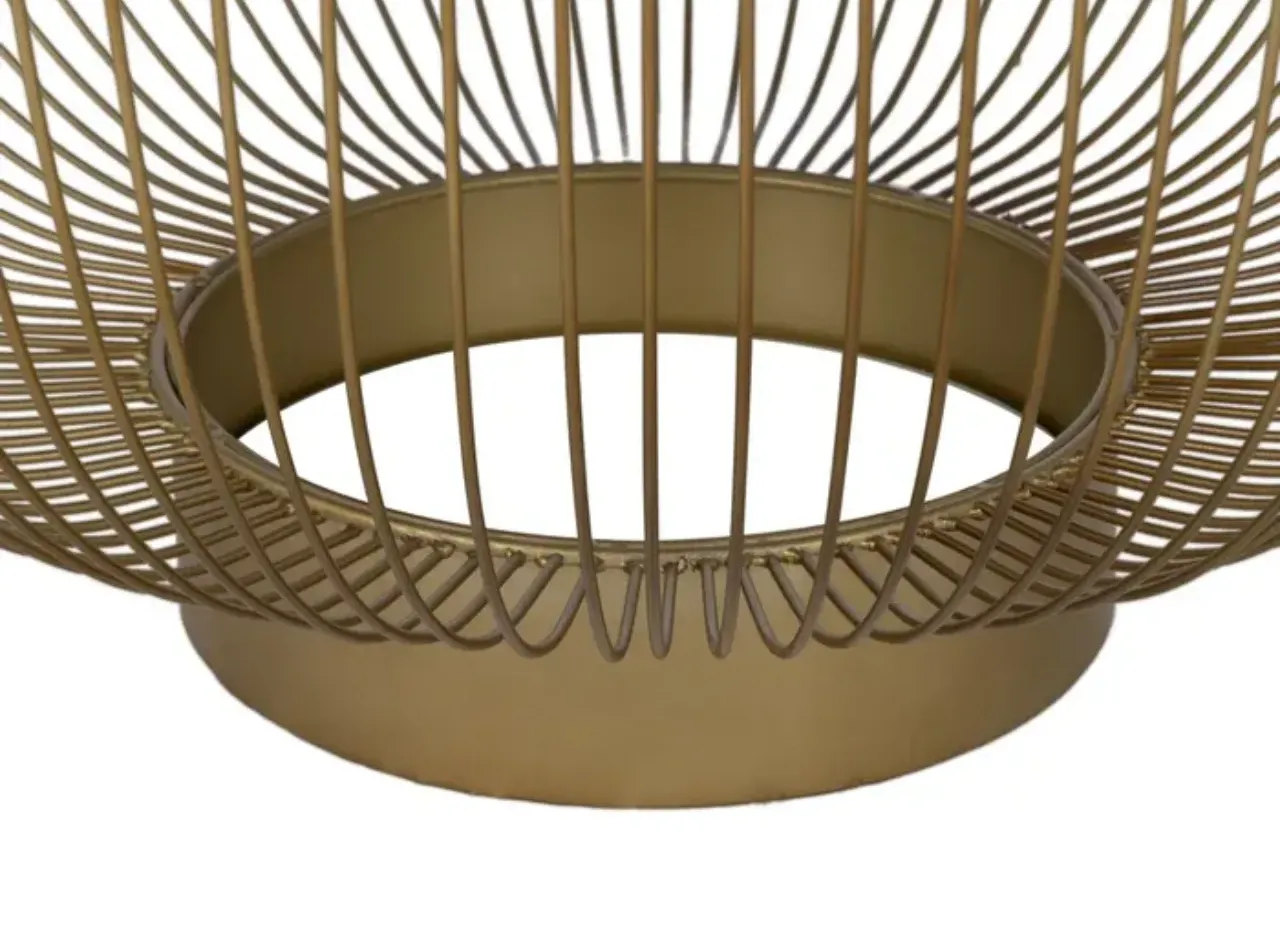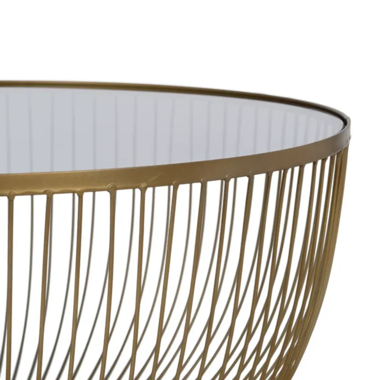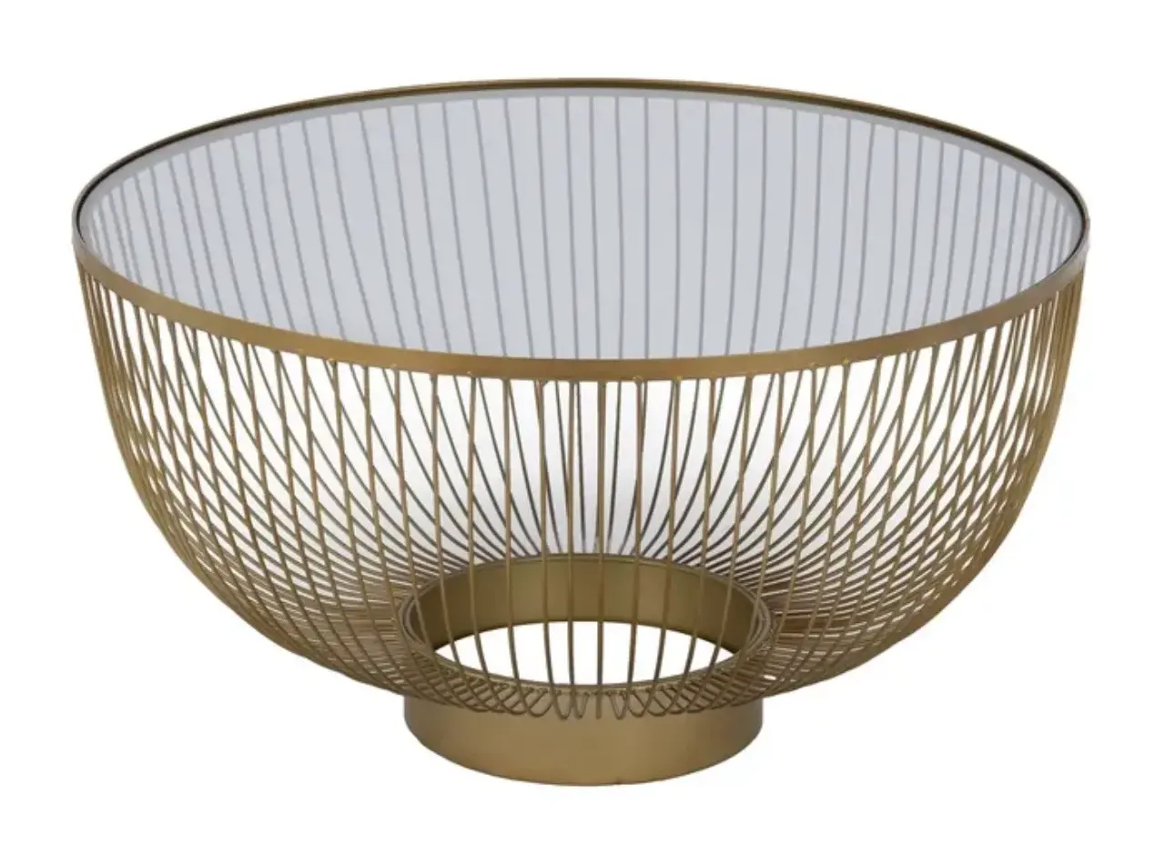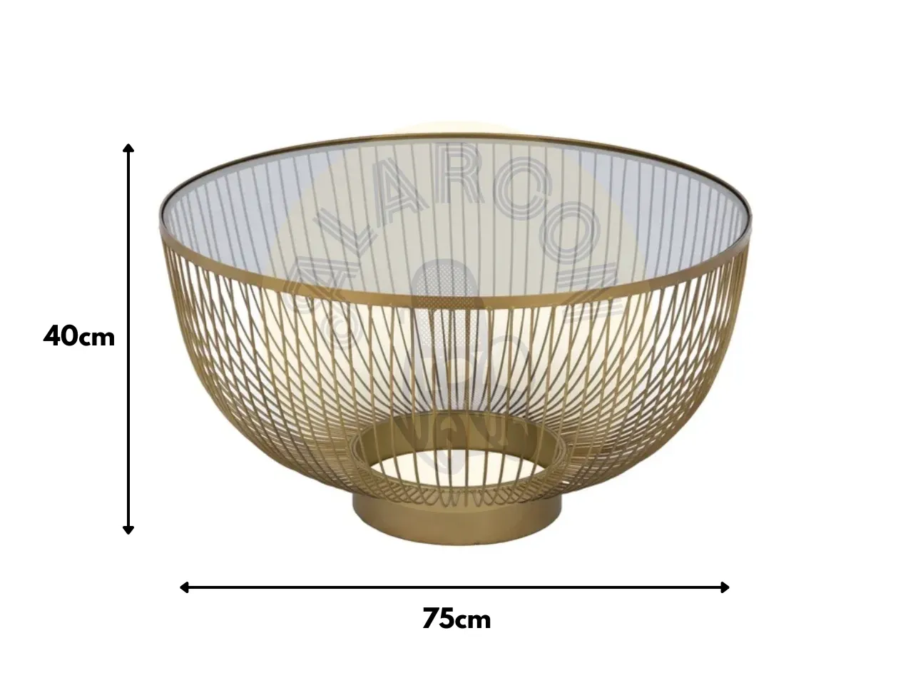 Esta mesa de centro en color oro combina la resistencia del hierro con la elegancia del cristal, creando un diseño sofisticado que aporta luminosidad y estilo al salón.