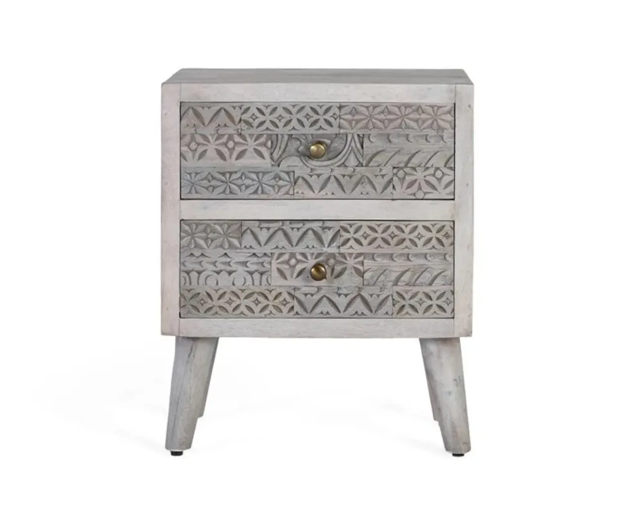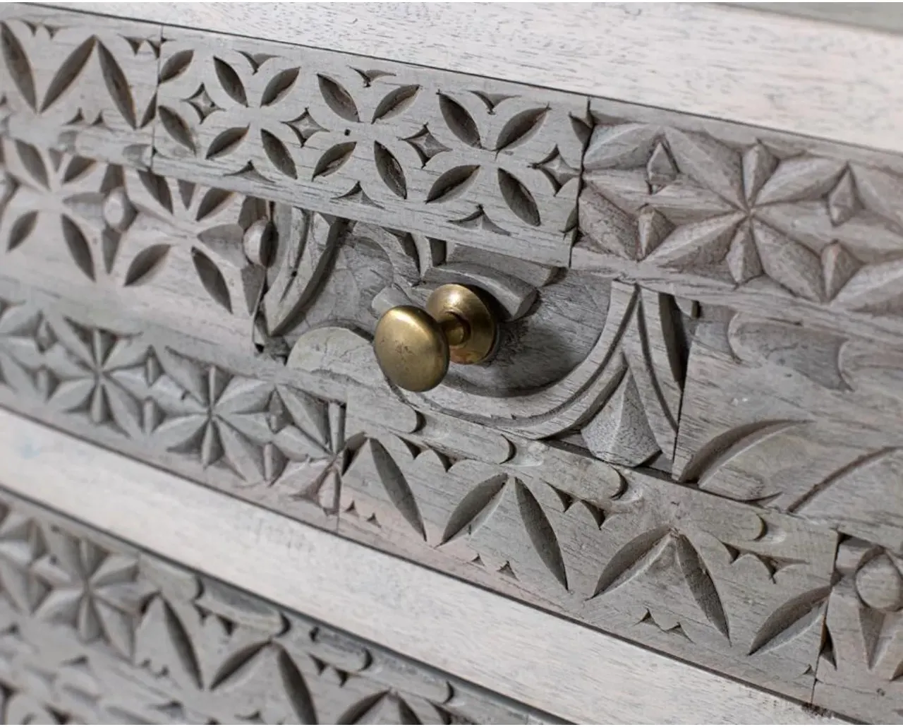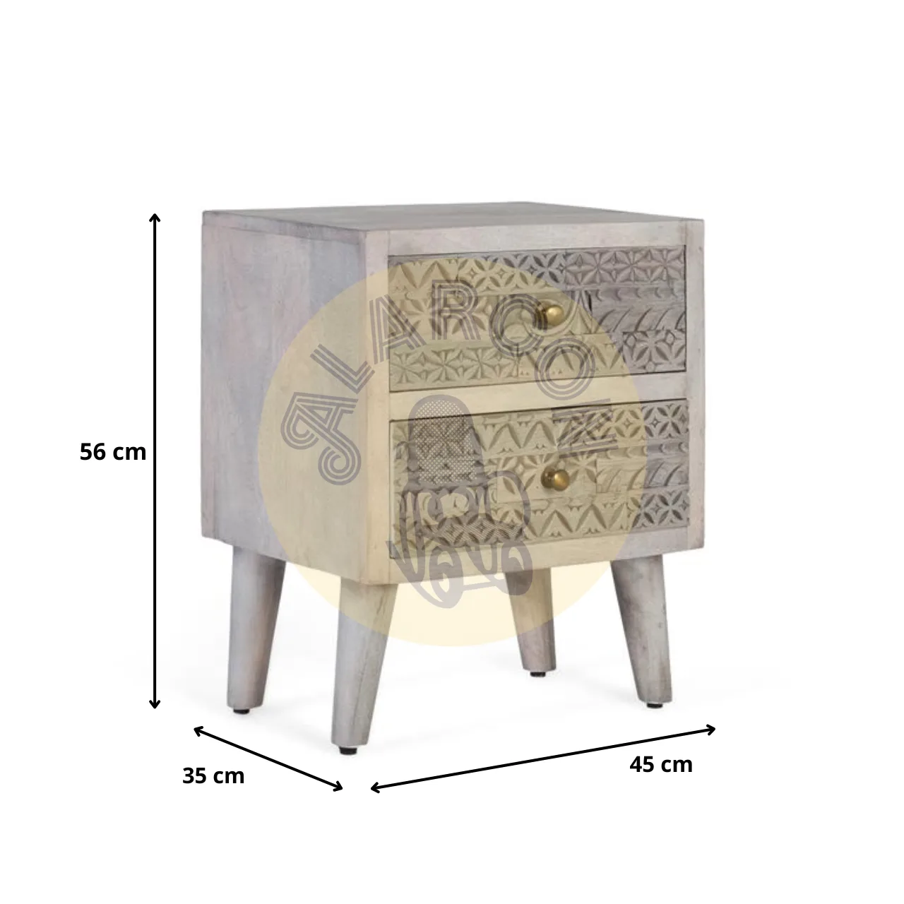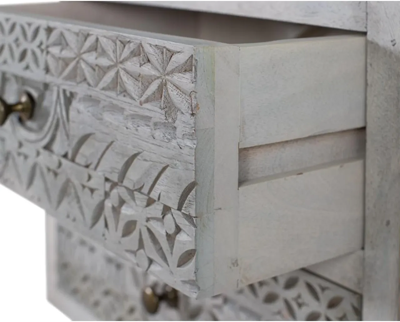Destaca por sus 2 cajones amplios con tiradores metálicos en tono latón envejecido, que ofrecen almacenaje práctico sin renunciar al diseño. Los frontis tallados a mano con motivos geométricos y florales aportan relieve artesanal y convierten cada pieza en un mueble con identidad propia.