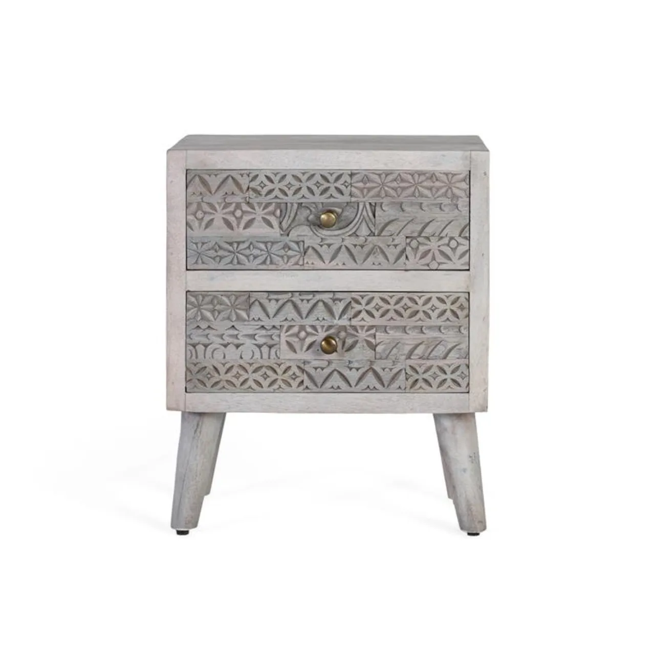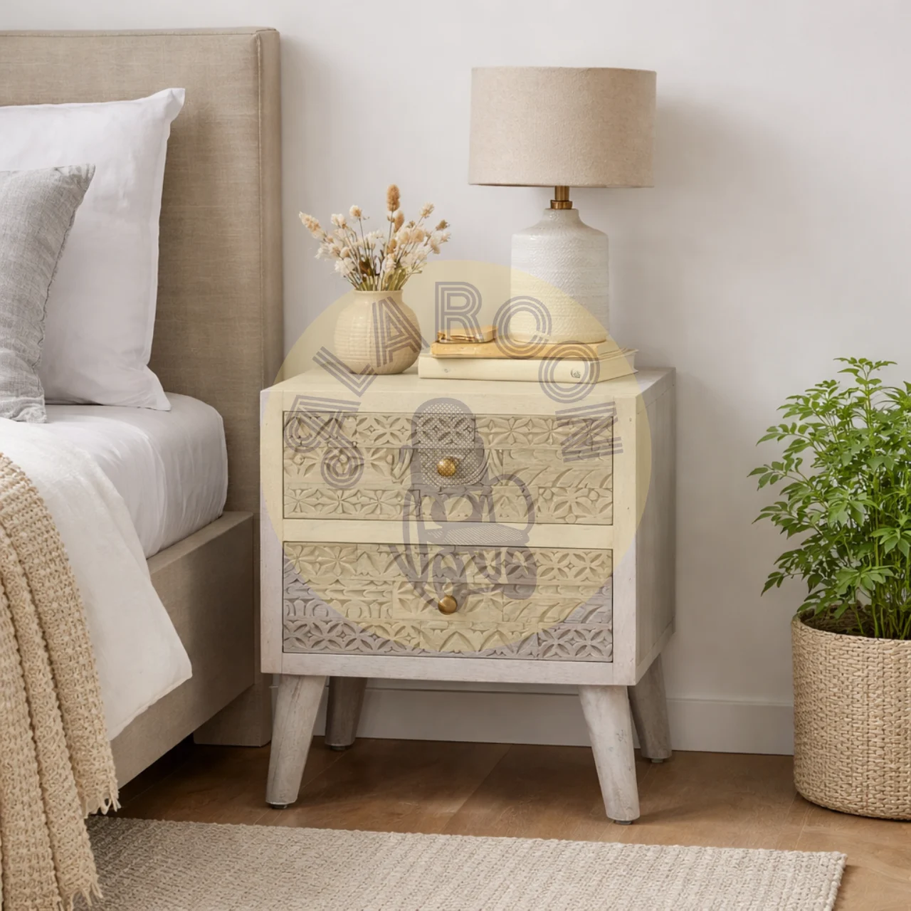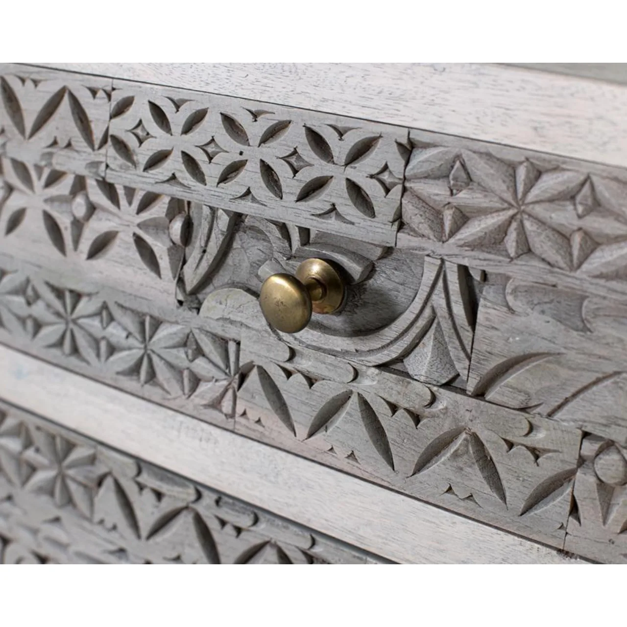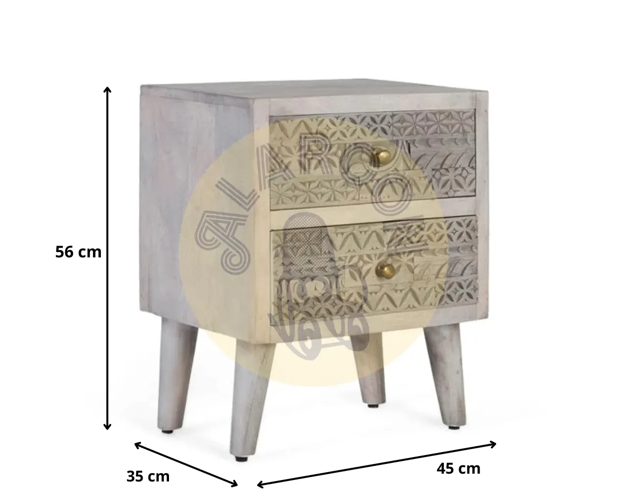 Destaca por sus 2 cajones amplios con tiradores metálicos en tono latón envejecido, que ofrecen almacenaje práctico sin renunciar al diseño. Los frontis tallados a mano con motivos geométricos y florales aportan relieve artesanal y convierten cada pieza en un mueble con identidad propia.
