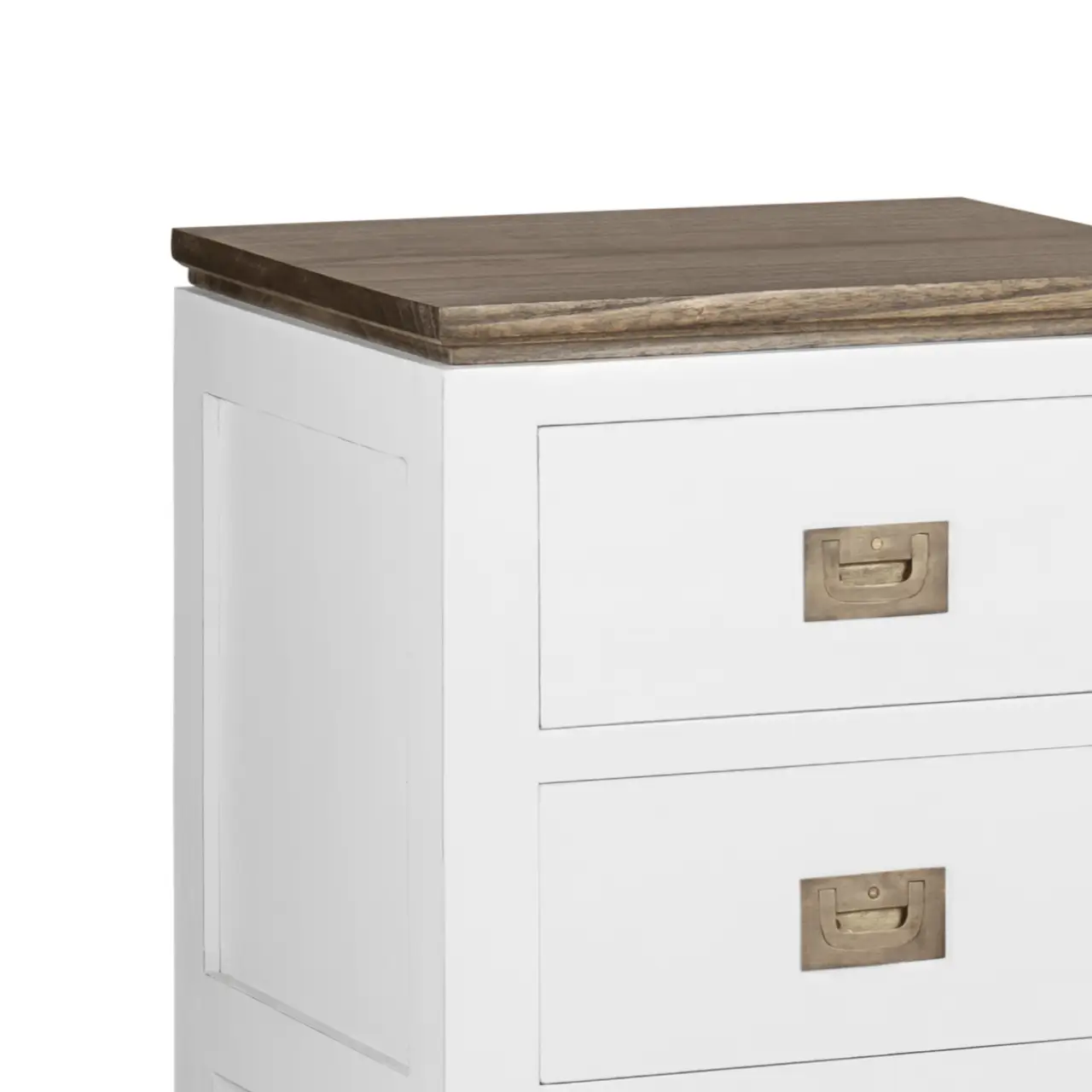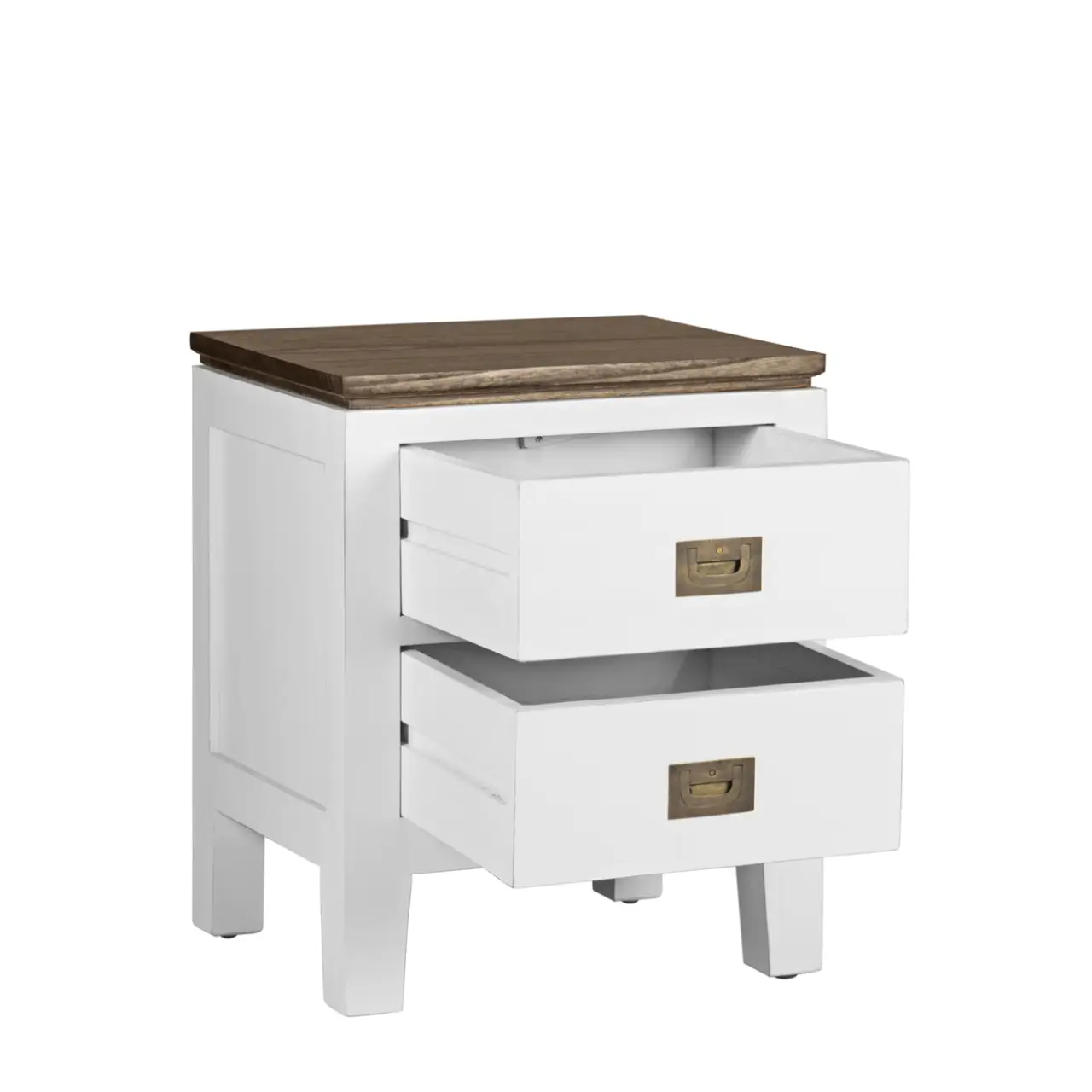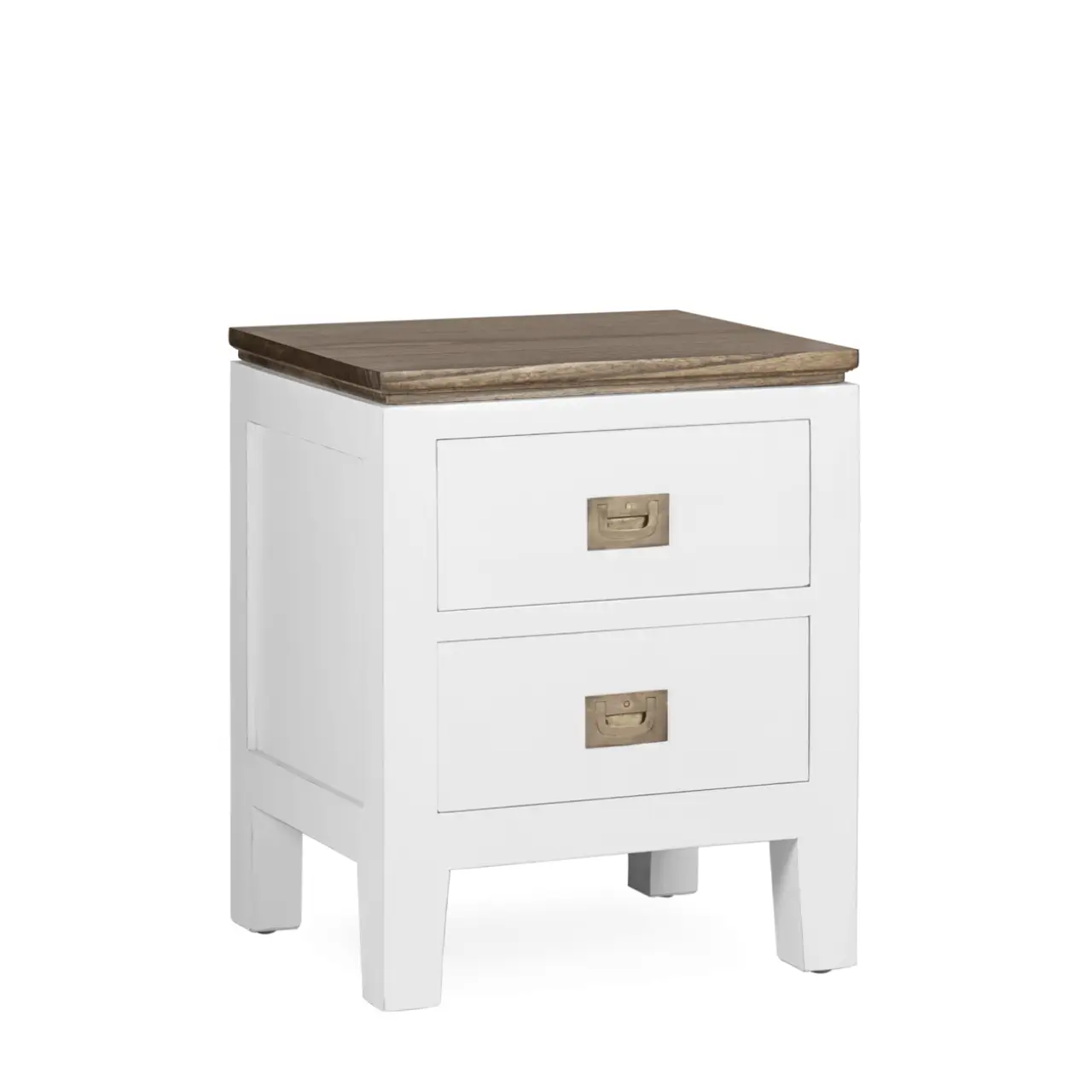 La Mesita Everest de 2 cajones, artesanalmente tallada en Madera de Mindi, te ofrece estilo y funcionalidad sin comprometer la calidad. Con los accesorios de bronce que enriquecen su estética, este artículo será la incorporación perfecta para tu dormitorio.