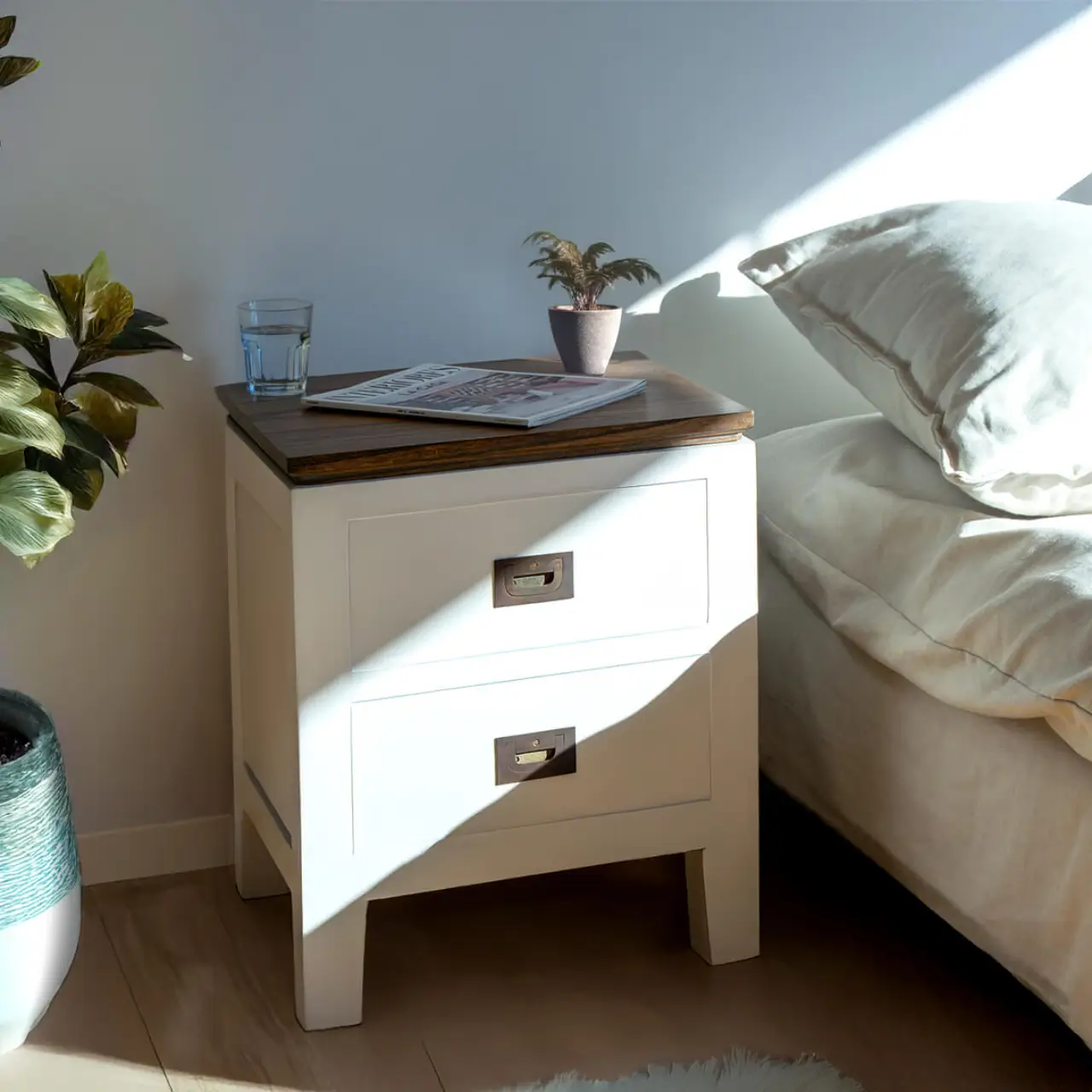 Además, la Mesita de Noche Everest cuenta con un amplio espacio de almacenamiento gracias a sus 2 cajones. Mide 45 x 40 x 55, un tamaño óptimo para encajar a la perfección en cualquier rincón de tu estancia. Además, su top en madera maciza proporciona una base sólida y robusta para cualquier objeto que desees tener al alcance de la mano por la noche.