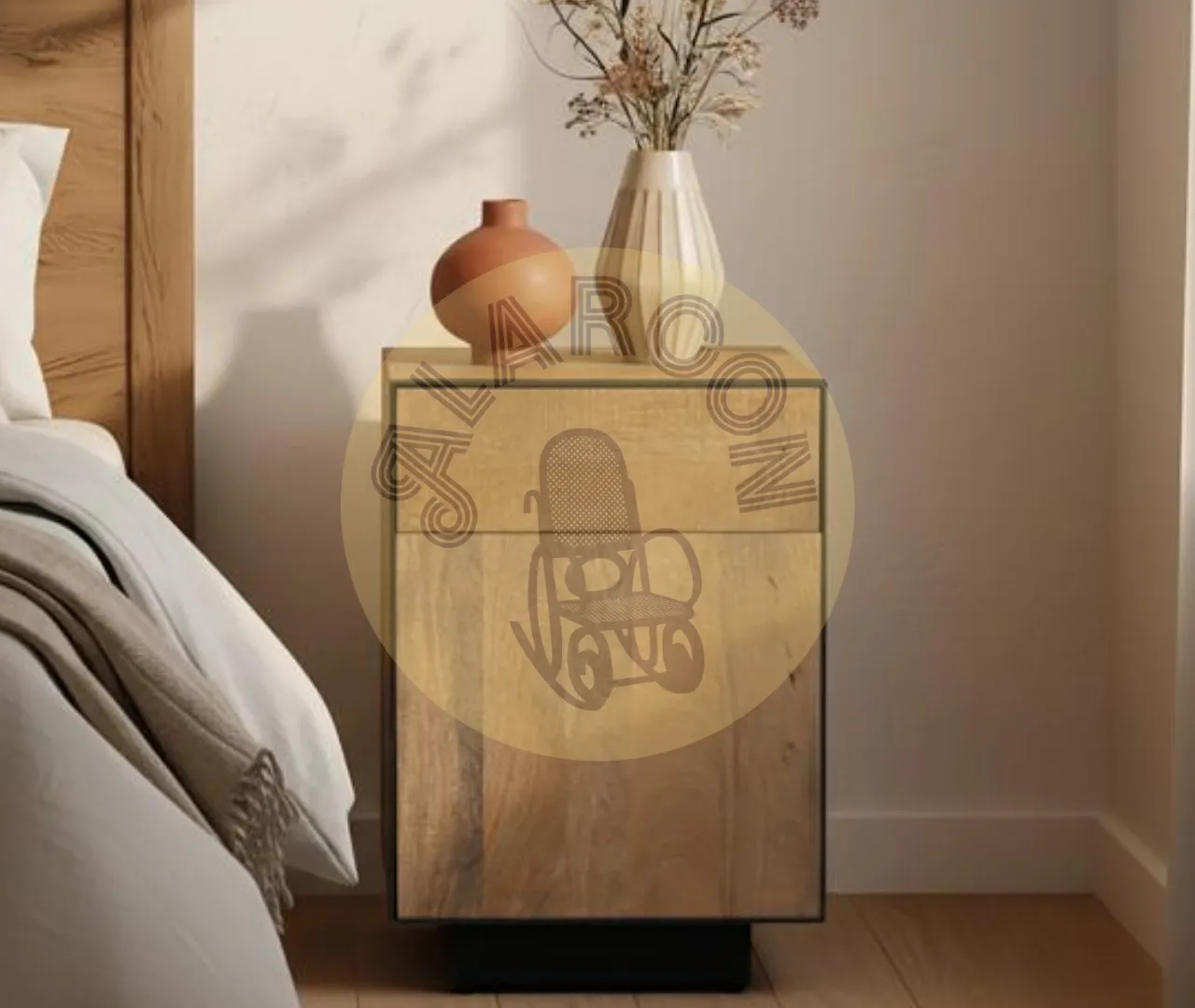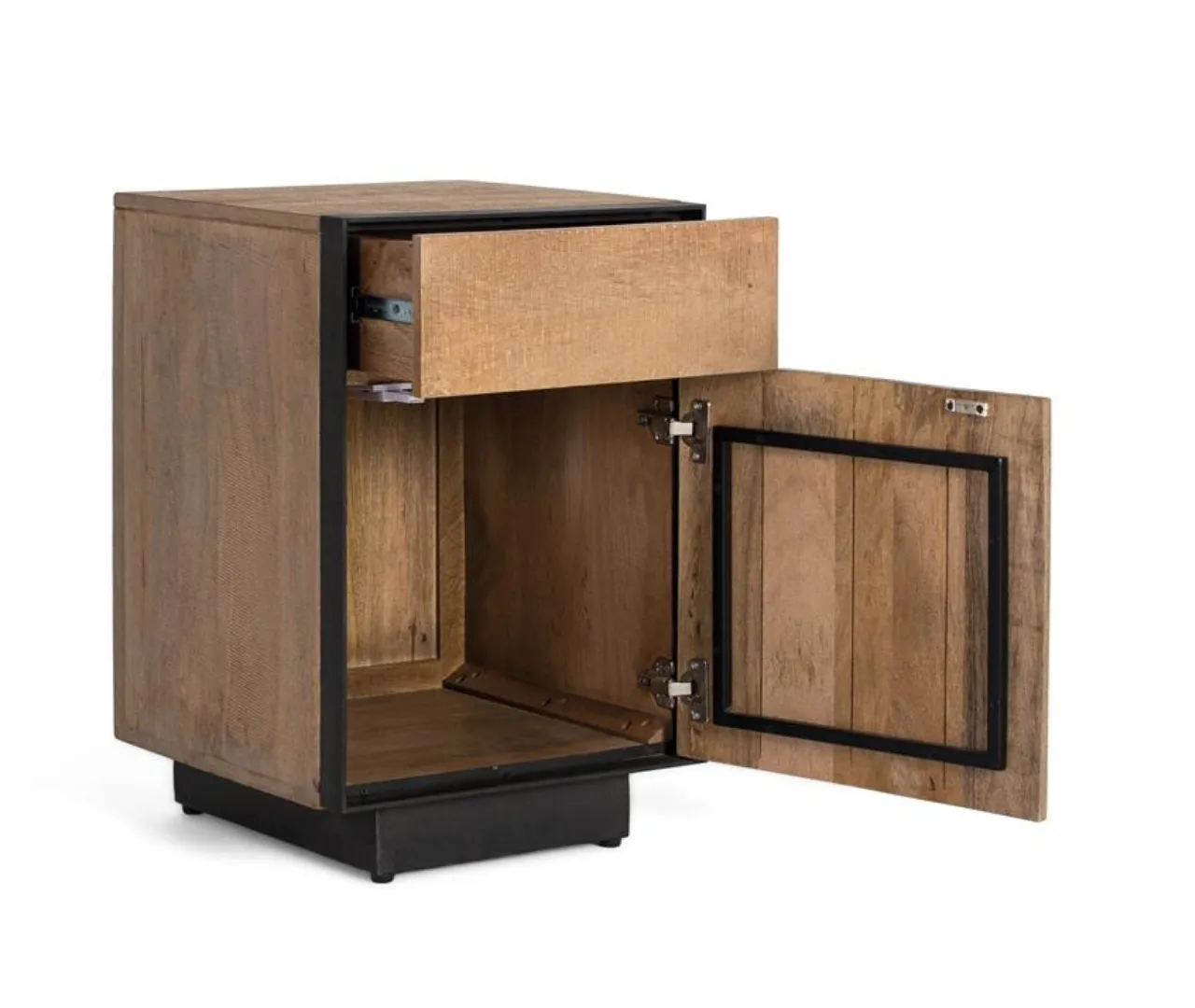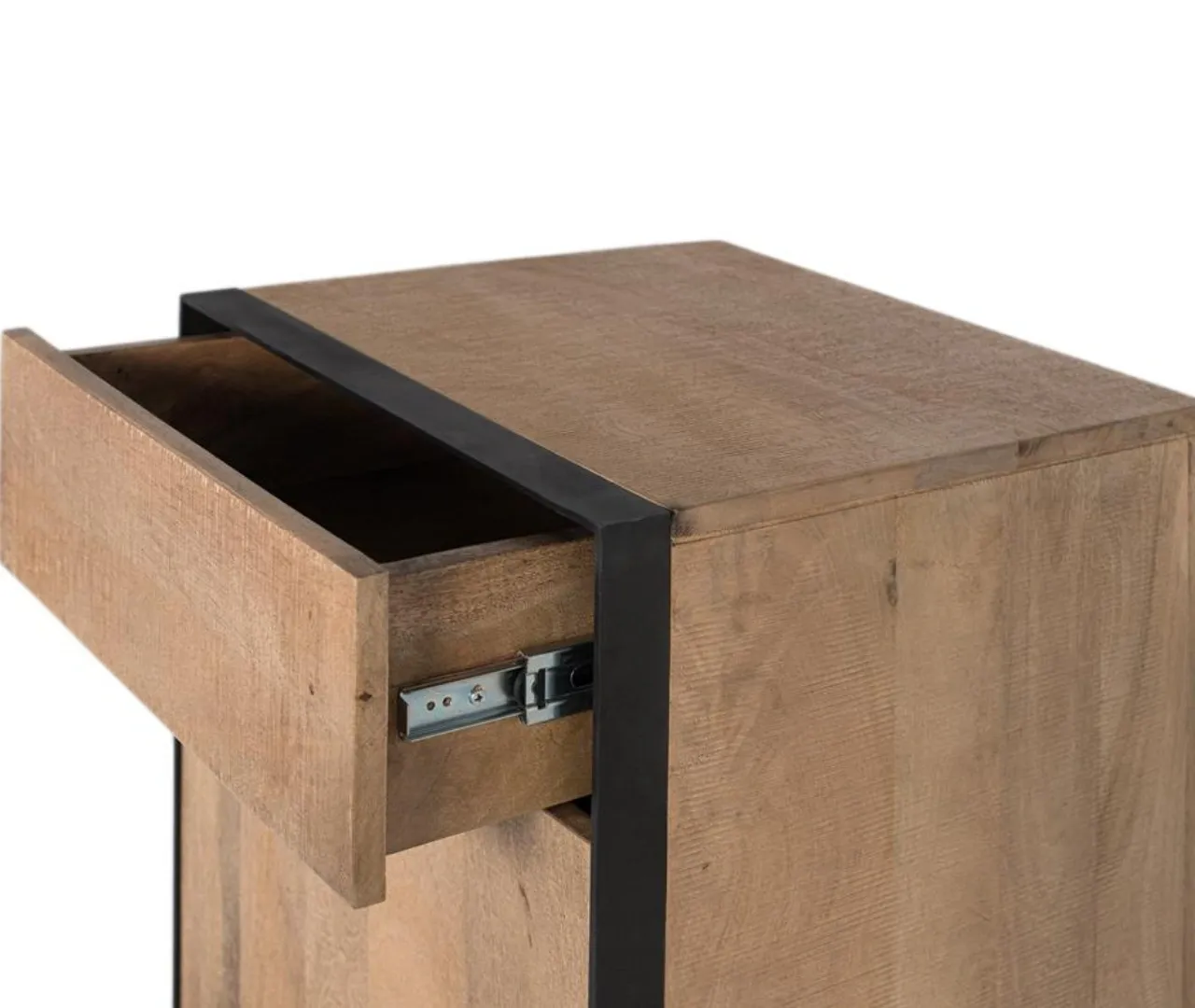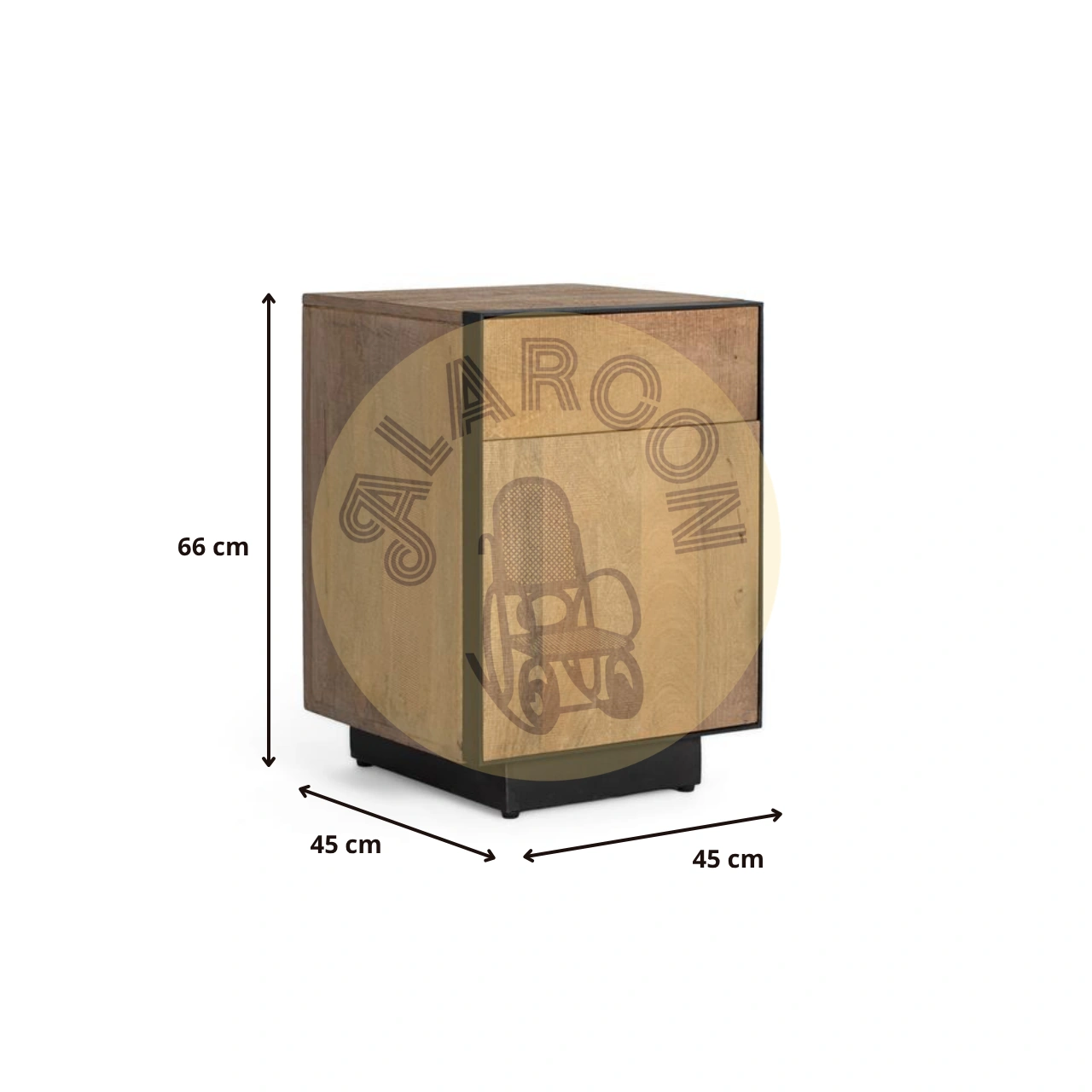 Aporta carácter a tu dormitorio con esta mesita de noche de madera de mango en acabado natural, diseñada para quienes buscan funcionalidad y estilo en una sola pieza. Su estructura combina la calidez de la madera con un resistente marco metálico, encajando a la perfección en ambientes industriales y contemporáneos.