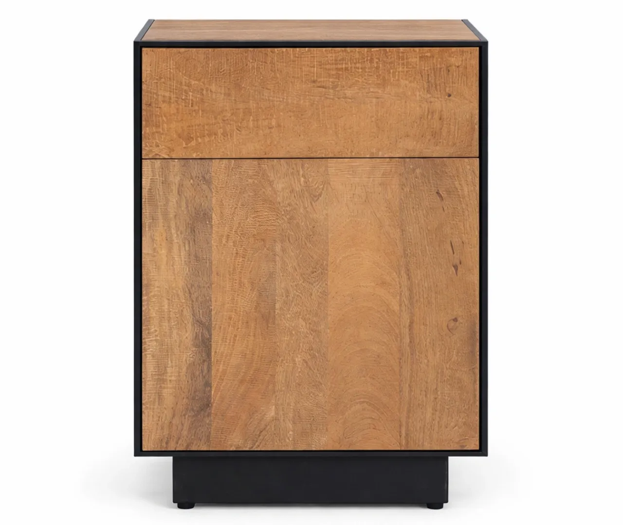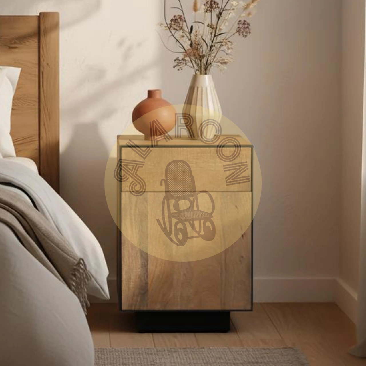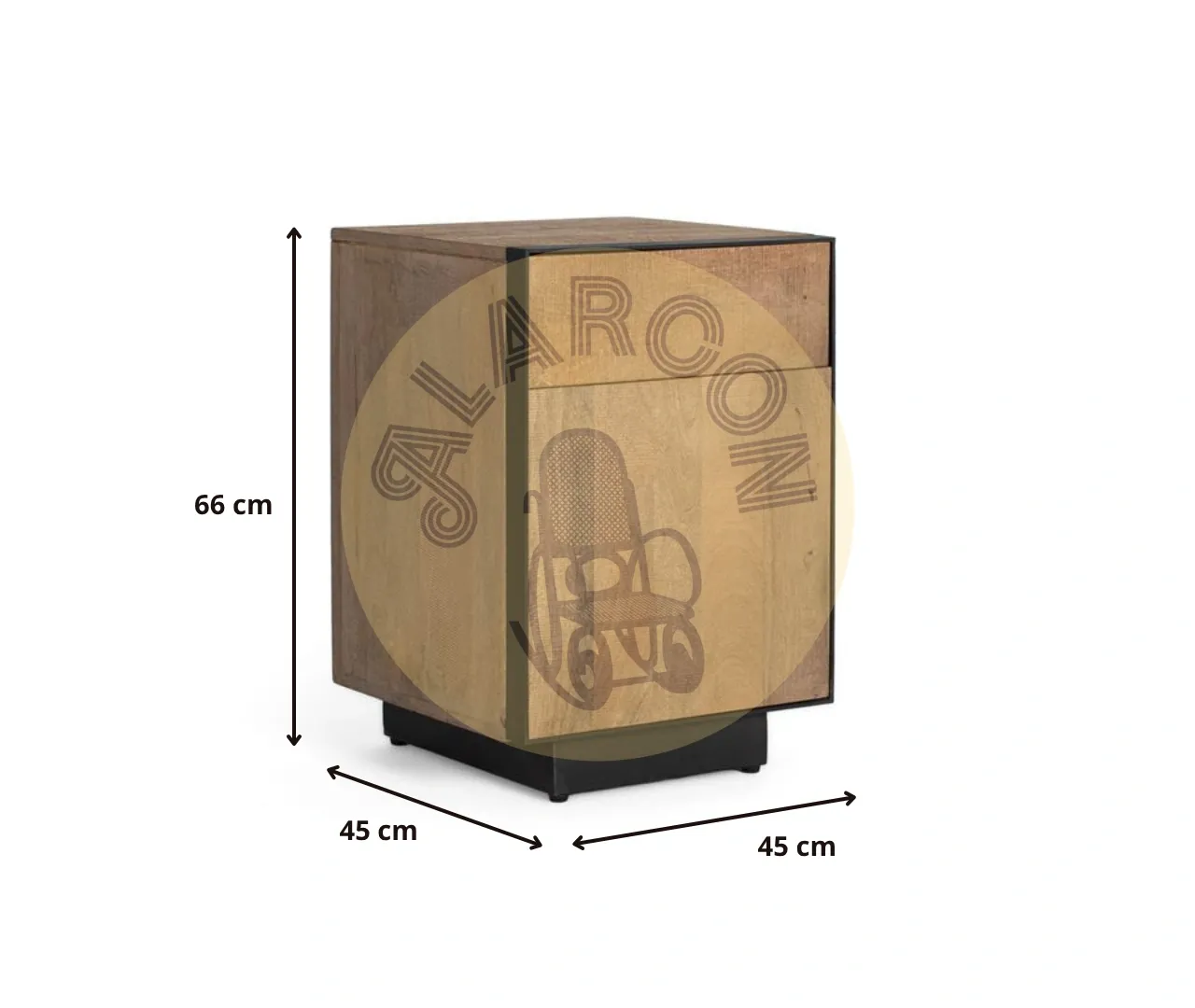 Aporta carácter a tu dormitorio con esta mesita de noche de madera de mango en acabado natural, diseñada para quienes buscan funcionalidad y estilo en una sola pieza. Su estructura combina la calidez de la madera con un resistente marco metálico, encajando a la perfección en ambientes industriales y contemporáneos.