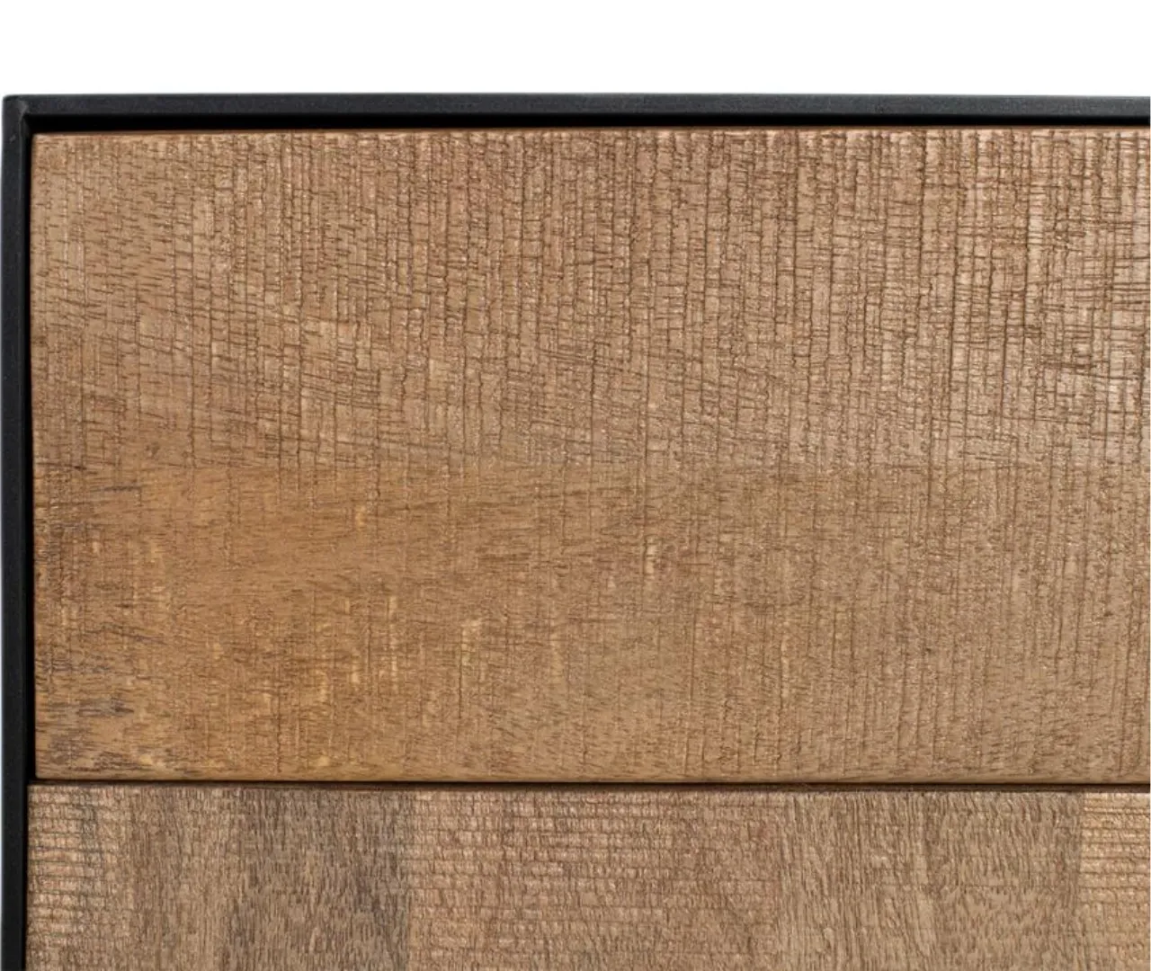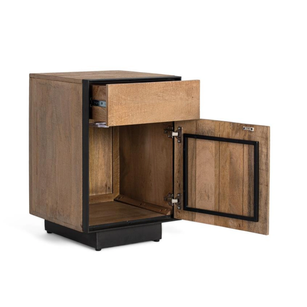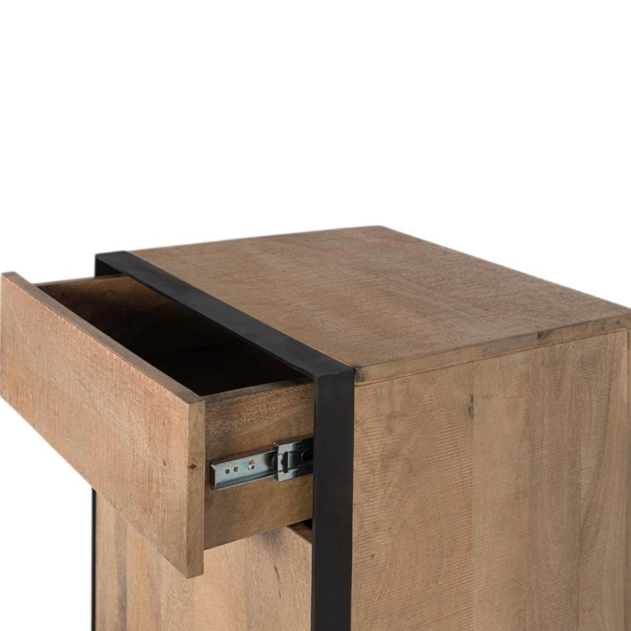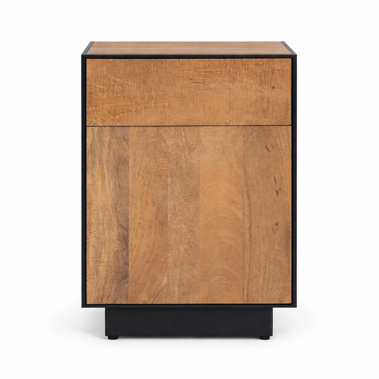 Aporta carácter a tu dormitorio con esta mesita de noche de madera de mango en acabado natural, diseñada para quienes buscan funcionalidad y estilo en una sola pieza. Su estructura combina la calidez de la madera con un resistente marco metálico, encajando a la perfección en ambientes industriales y contemporáneos.
