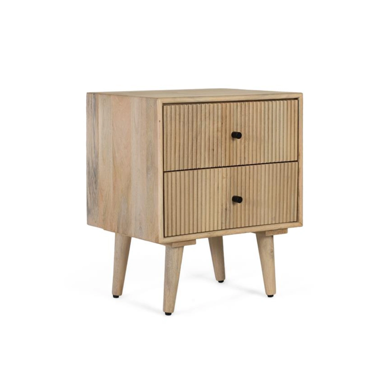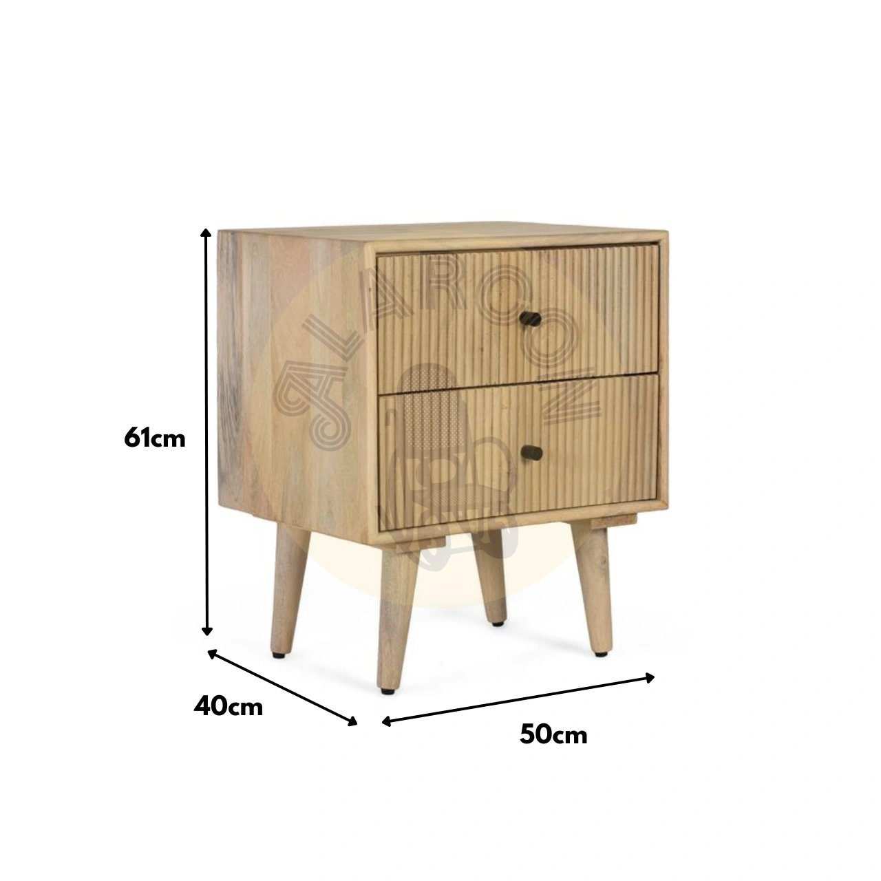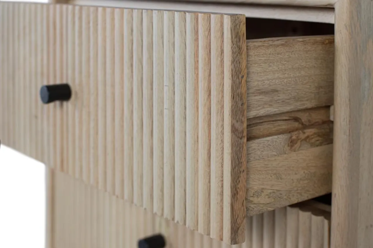 Fabricada en madera maciza de mango, esta mesita presenta un acabado en tono natural claro que realza la veta y aporta una estética cálida y atemporal. Su diseño destaca por el frontal acanalado de los cajones, un detalle decorativo que añade textura y un estilo nórdico muy actual.