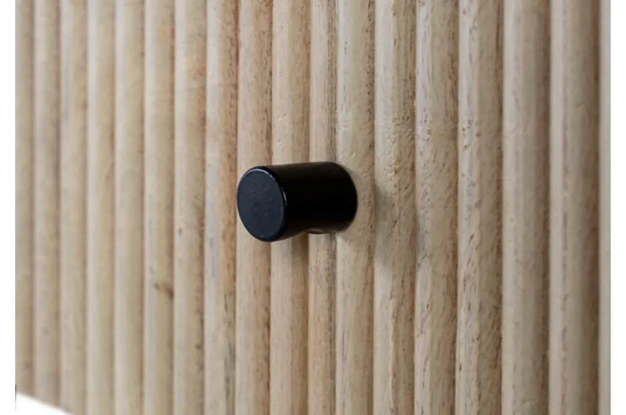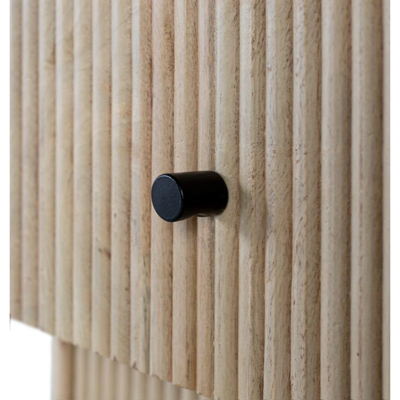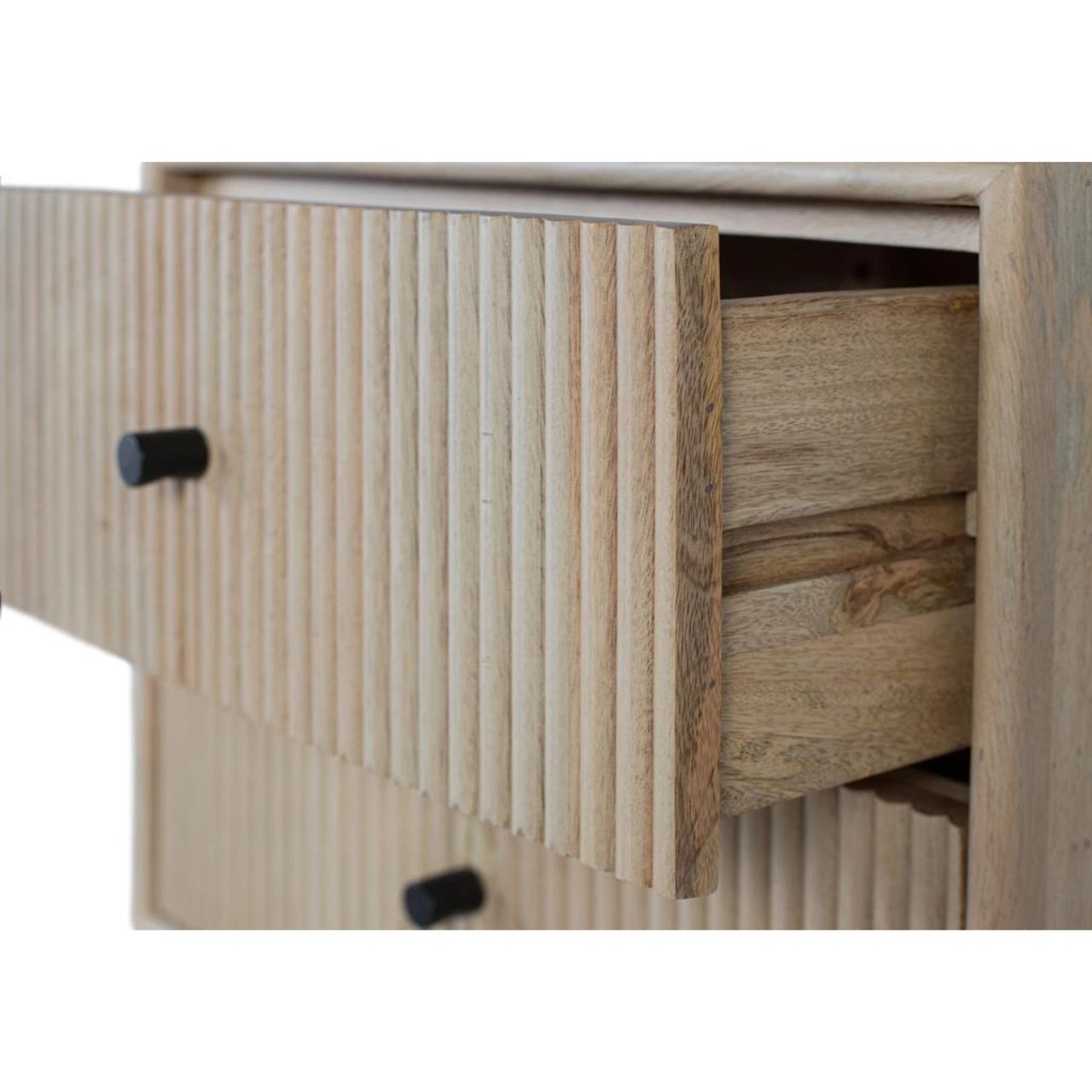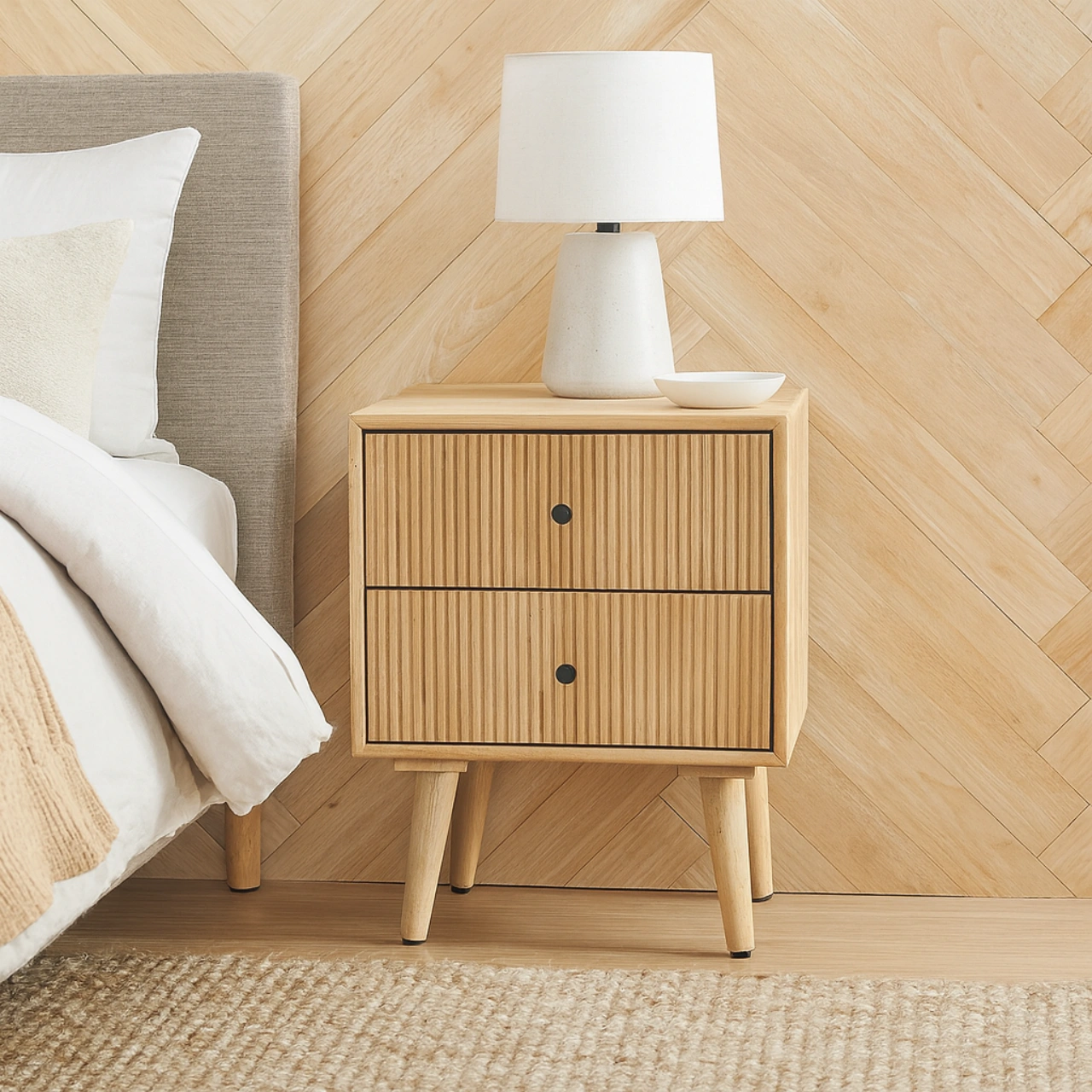 Fabricada en madera maciza de mango, esta mesita presenta un acabado en tono natural claro que realza la veta y aporta una estética cálida y atemporal. Su diseño destaca por el frontal acanalado de los cajones, un detalle decorativo que añade textura y un estilo nórdico muy actual.