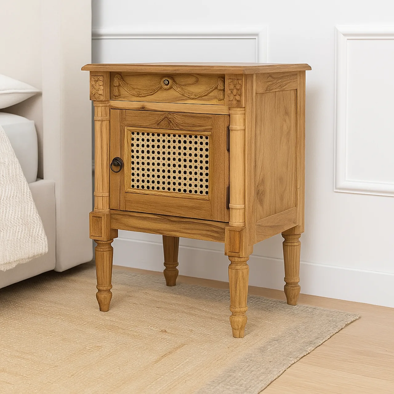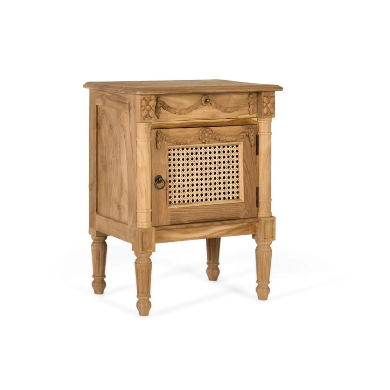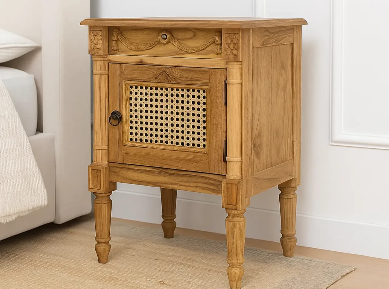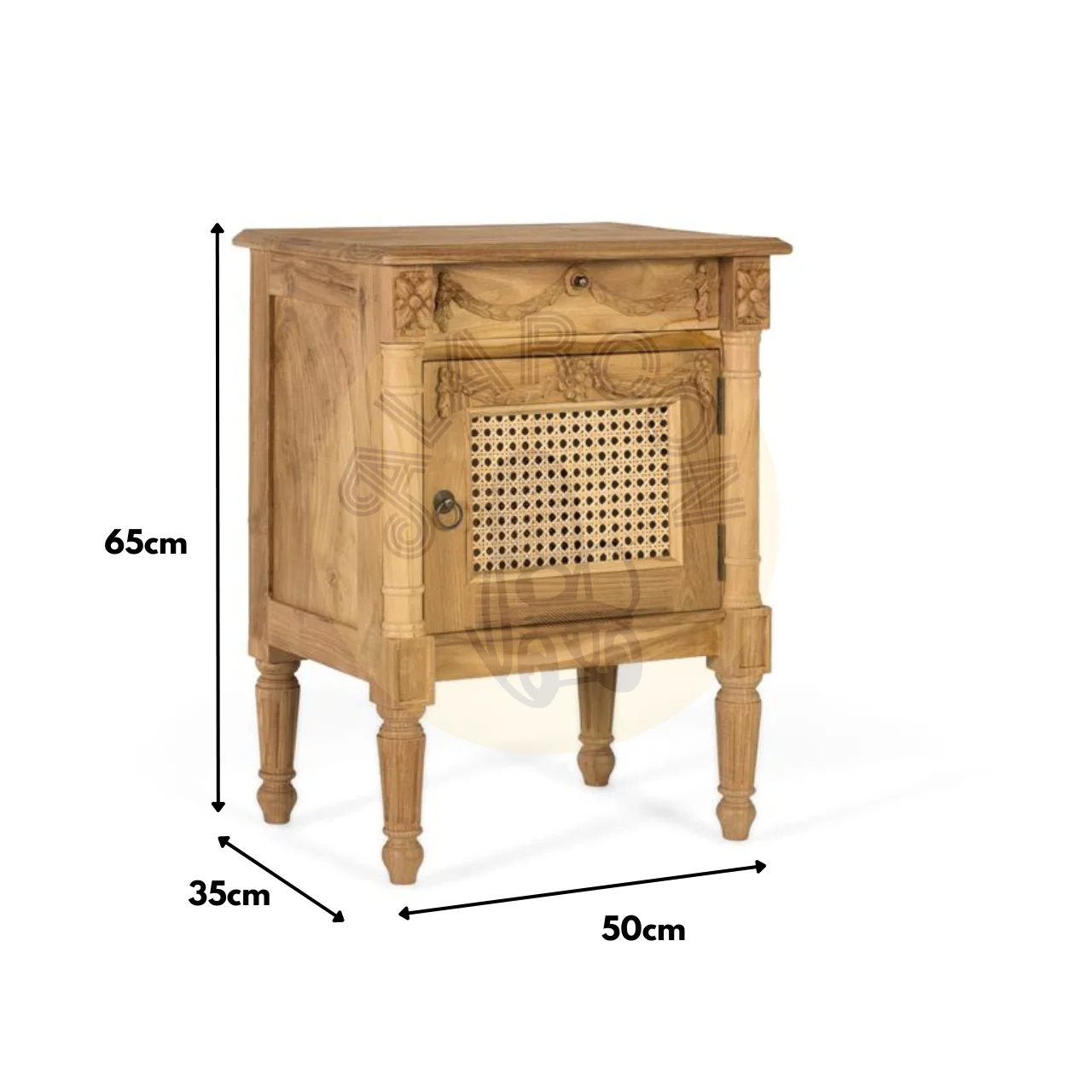 Con unas medidas de 50 cm de largo, 65 cm de alto y 35 cm de ancho, incluye un cajón superior tallado a mano con motivos de guirnaldas y una puerta inferior con rejilla de ratán trenzado, que aporta textura y un aire natural al conjunto.