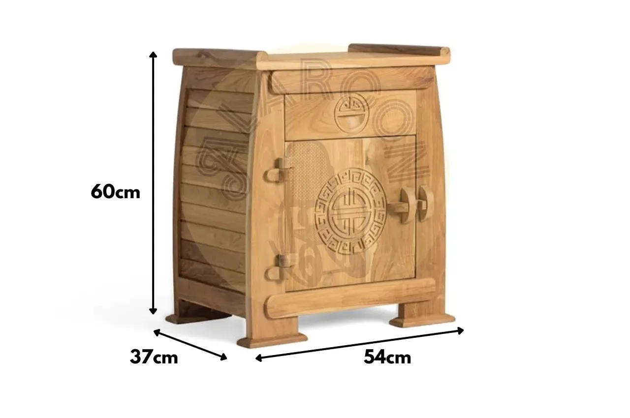 La mesilla de noche de teca maciza destaca por su acabado natural, que resalta las vetas únicas de la madera y realza su carácter artesanal. Su diseño combina solidez estructural con una inspiración oriental, aportando calidez y elegancia a dormitorios de estilo contemporáneo o rústico.