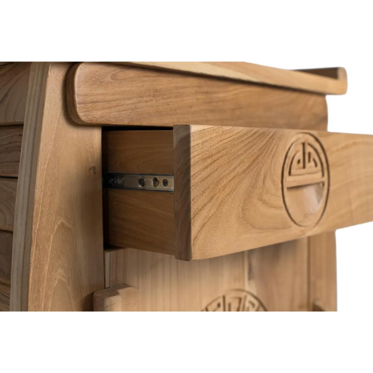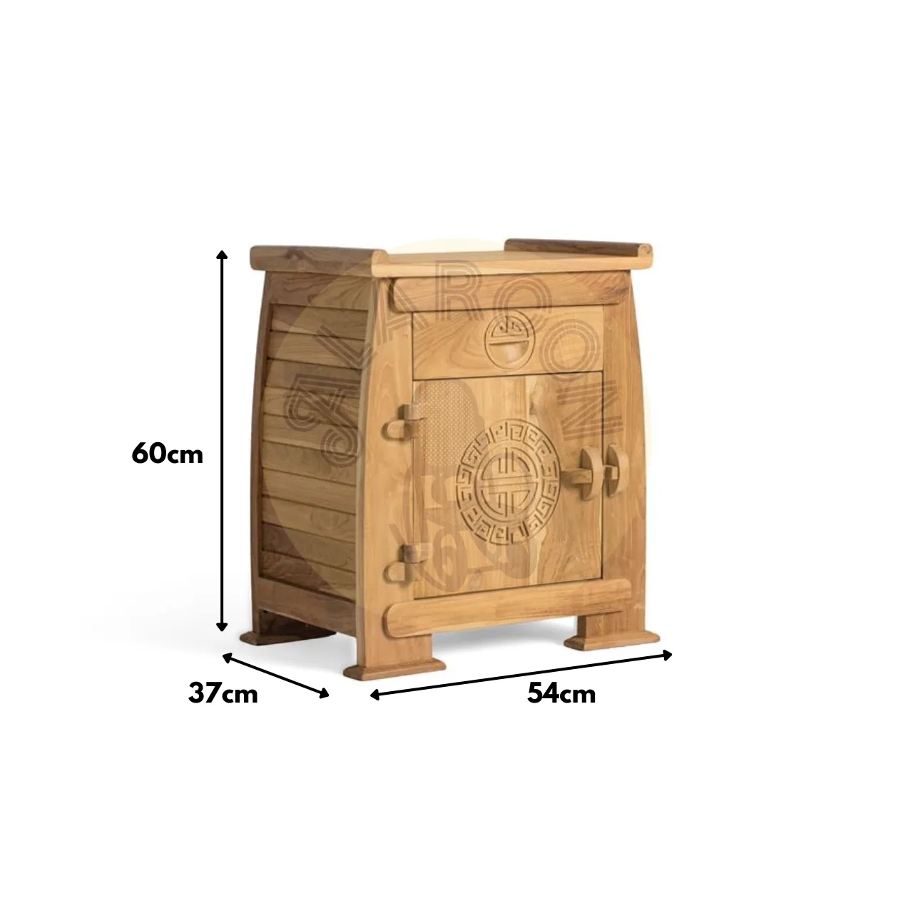 Las bisagras y cierres de madera refuerzan la autenticidad de su elaboración manual, mientras que la estructura de teca sostenible garantiza resistencia y durabilidad. Una mesilla diseñada para acompañar el descanso con estilo, naturalidad y funcionalidad.
