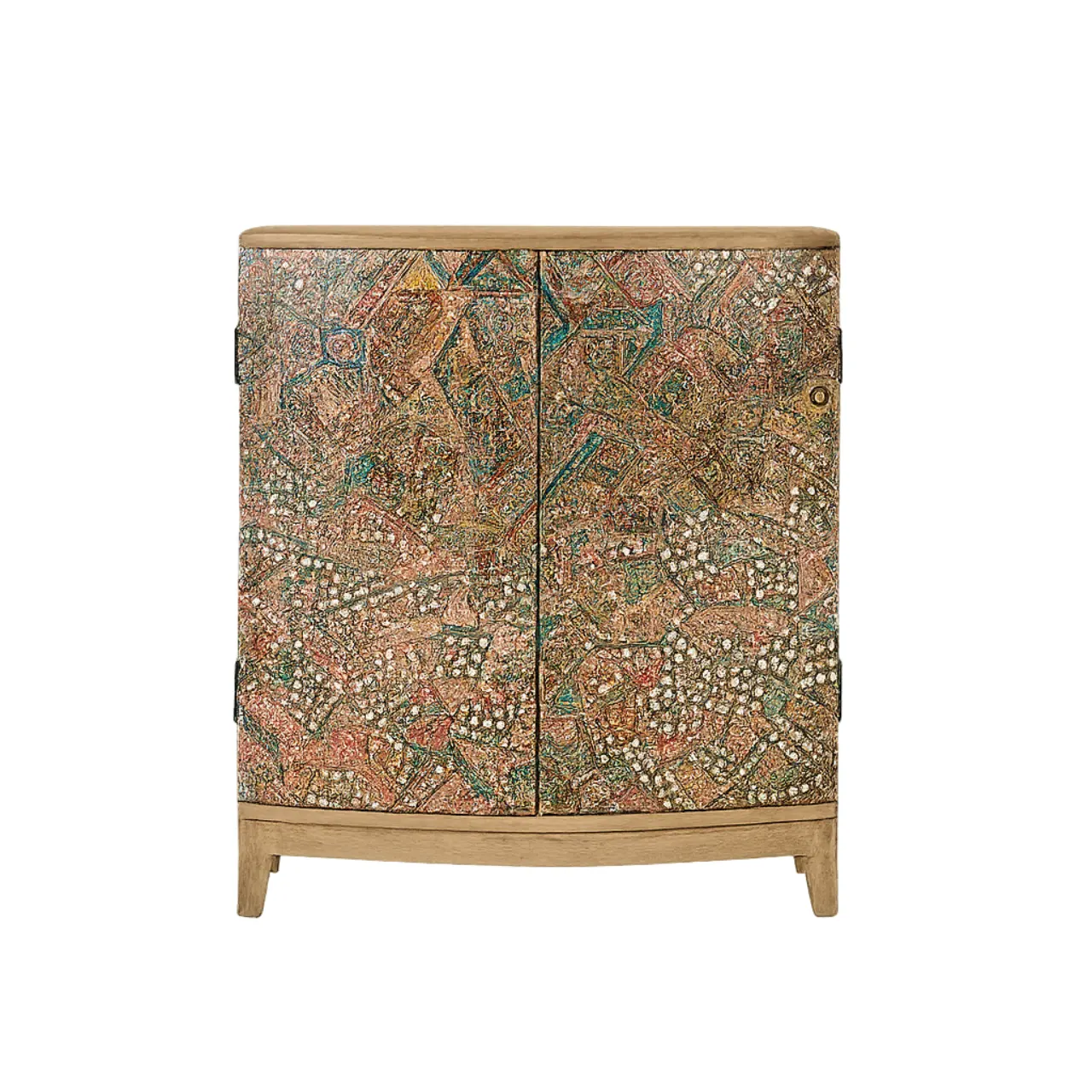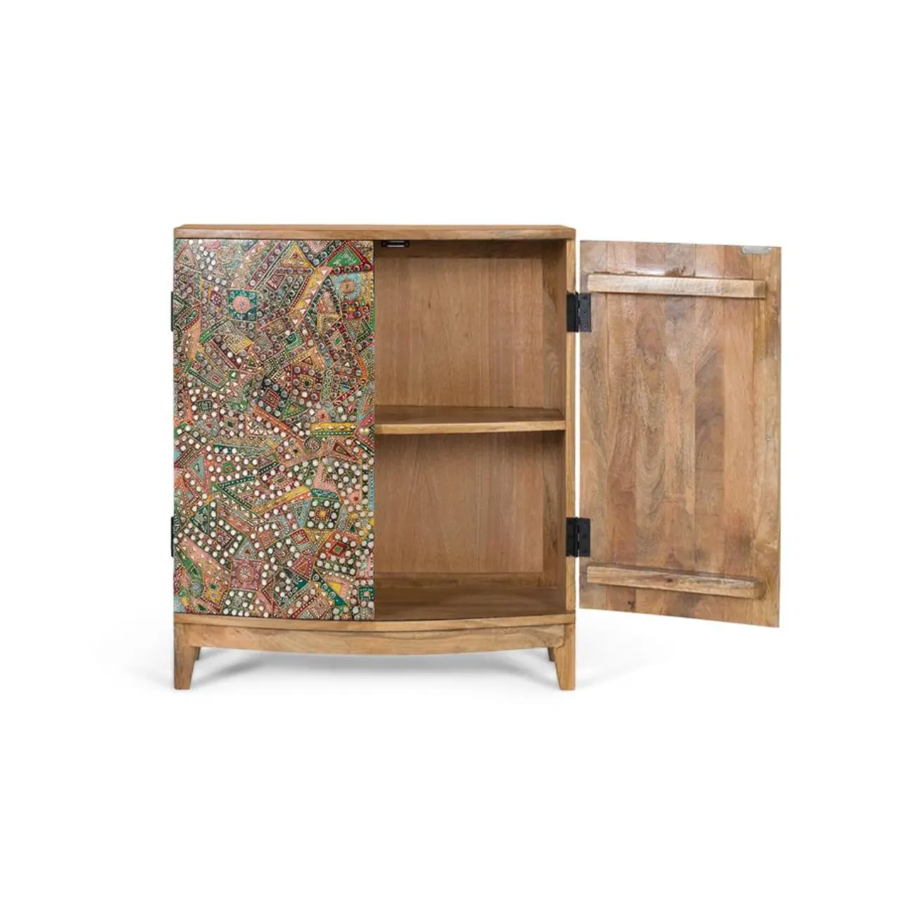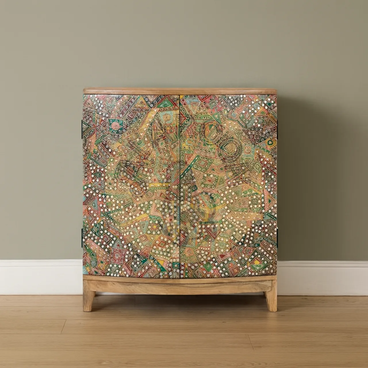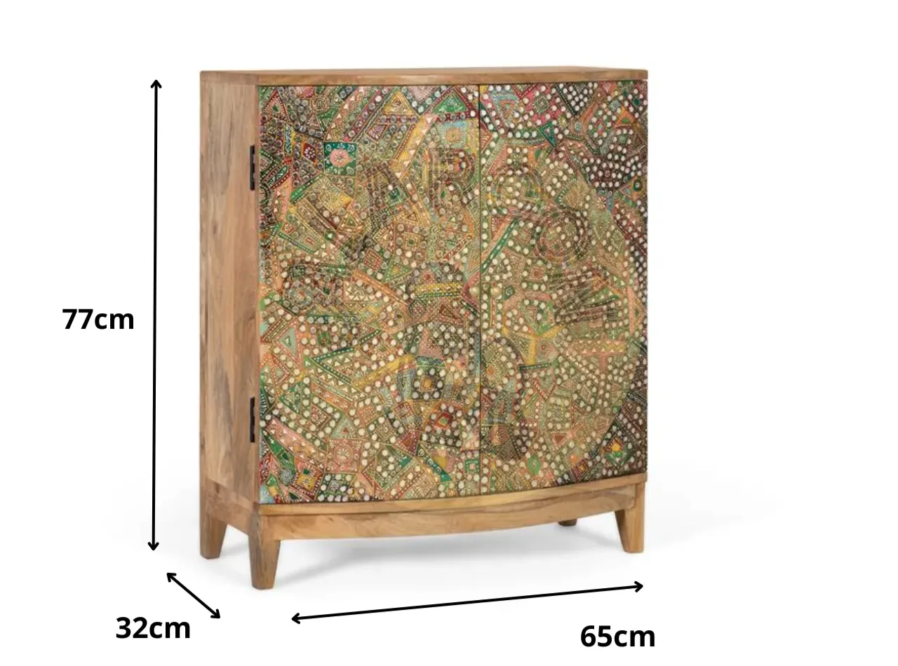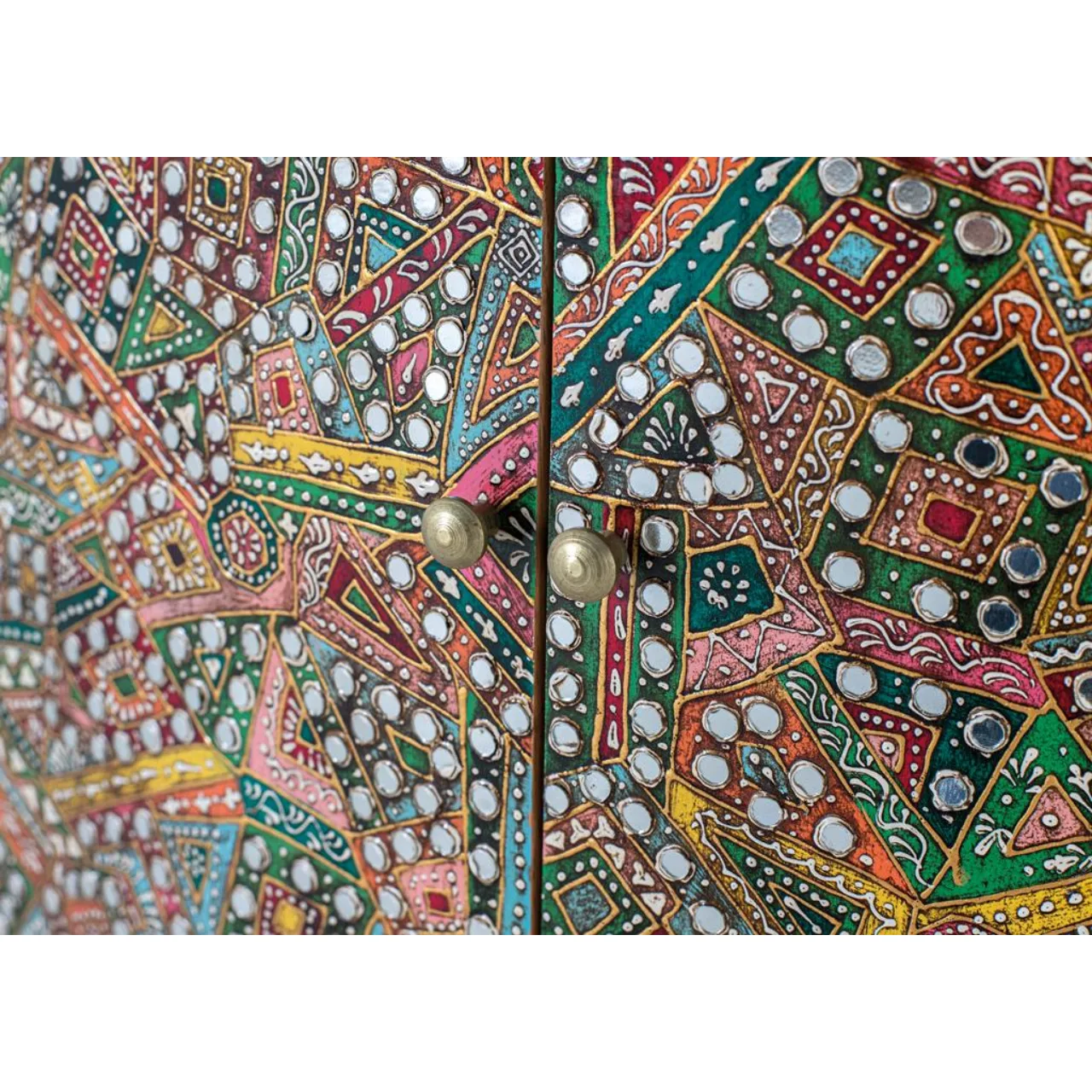 La superficie frontal está decorada con un mosaico colorido de patrones geométricos y florales, enriquecido con pequeños espejos y detalles metálicos que aportan textura y luminosidad. Cada detalle convierte a esta pieza en un punto focal lleno de carácter.