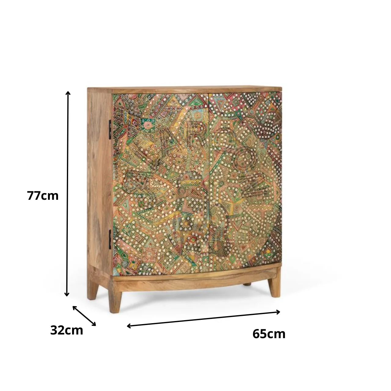 Este mueble auxiliar de madera destaca por su diseño único y su toque artesanal. Con una estructura compacta y resistente, incorpora dos puertas frontales ligeramente curvas que aportan personalidad y estilo a cualquier estancia.