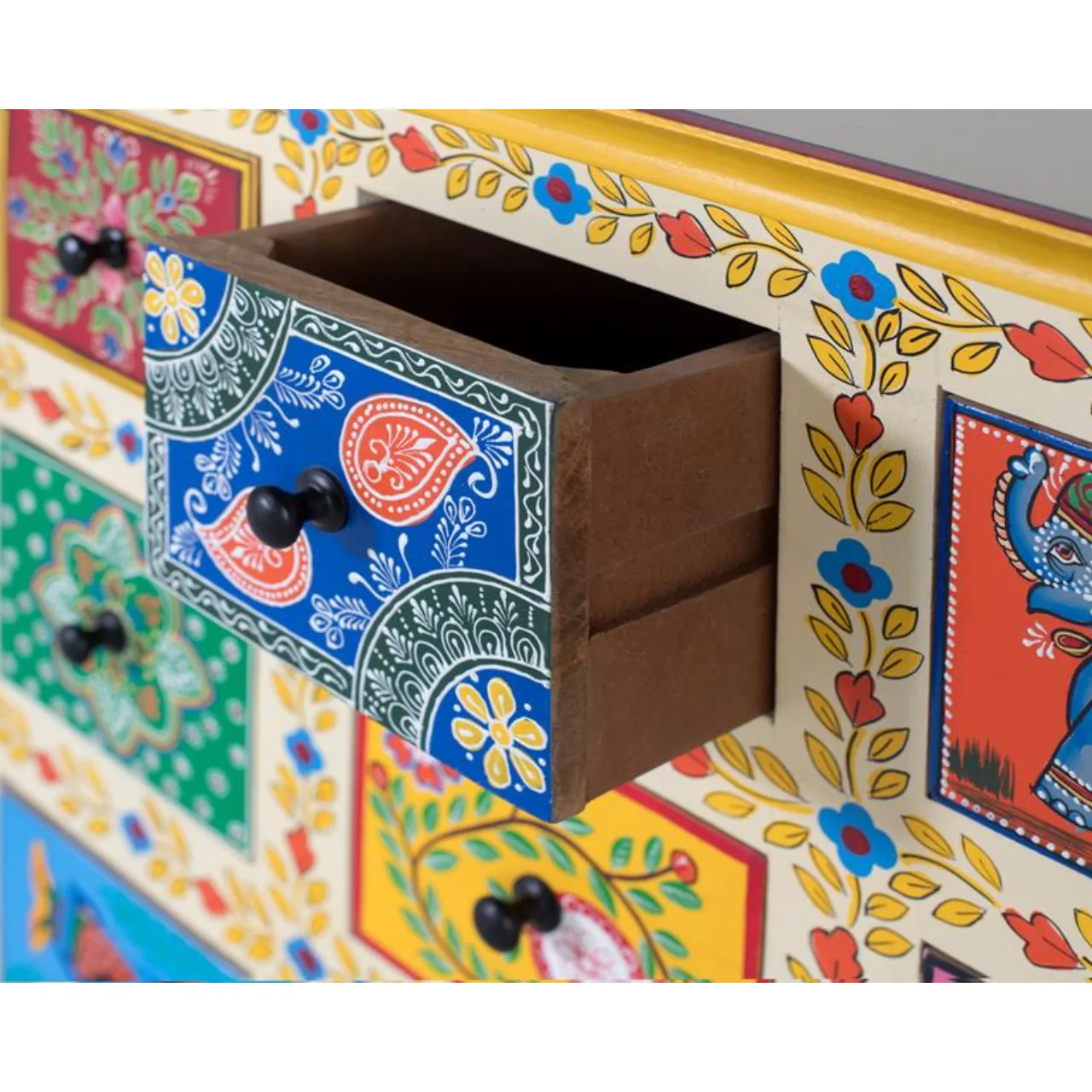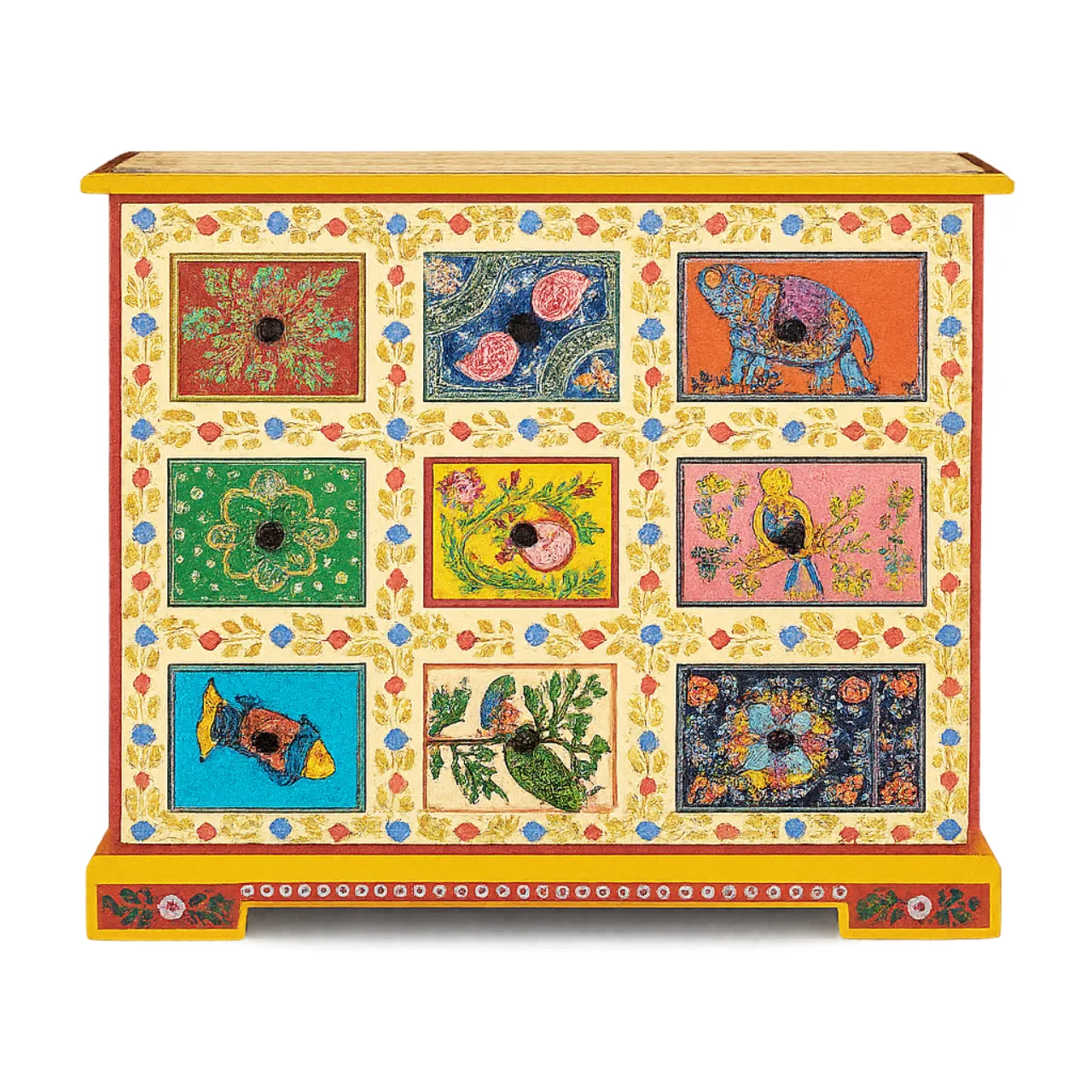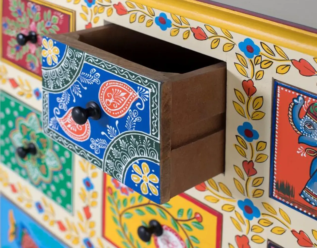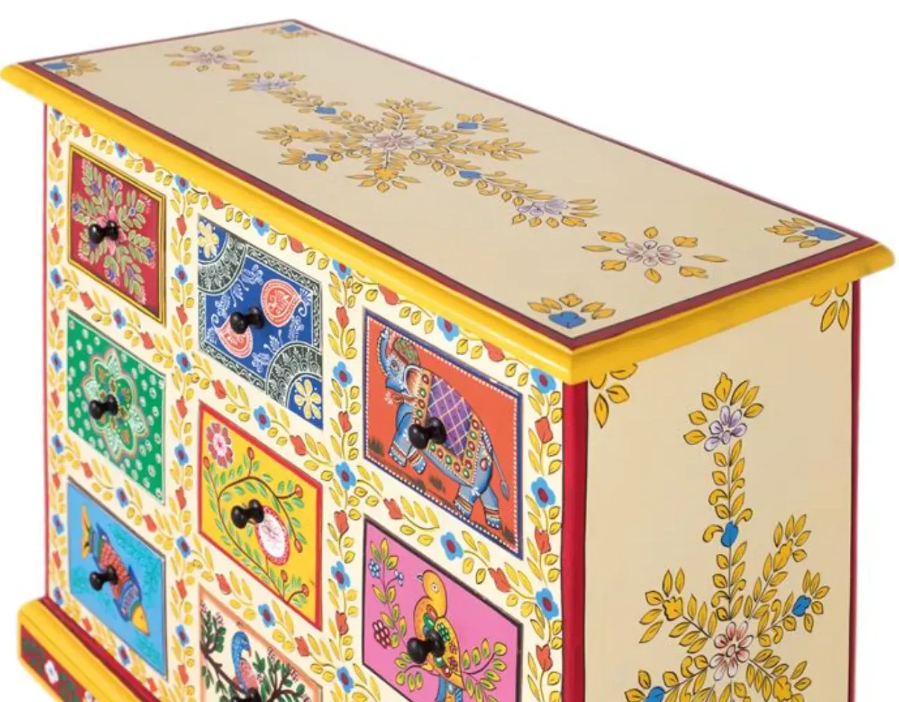 Este mueble auxiliar de madera maciza de mango destaca por su diseño artesanal con 9 cajones únicos, cada uno decorado con motivos inspirados en el arte popular indio. Los colores vivos y las formas detalladas convierten cada frente en una pieza decorativa que aporta personalidad a cualquier espacio.