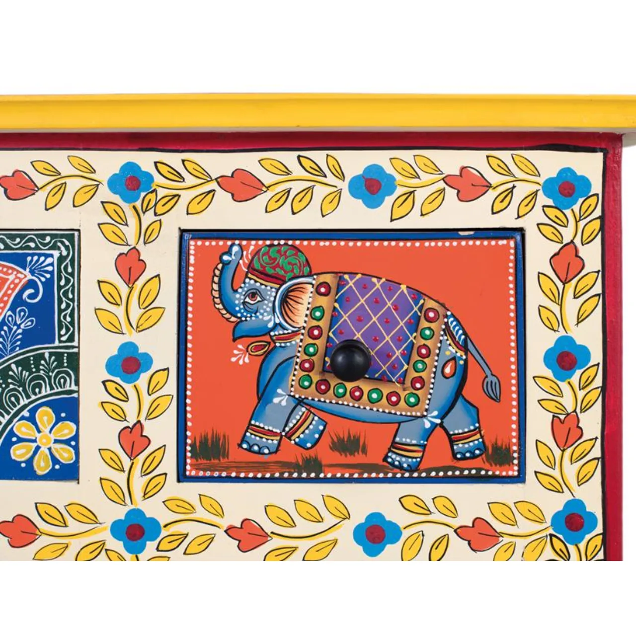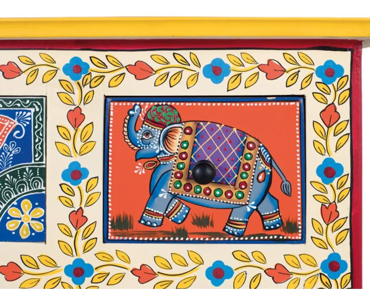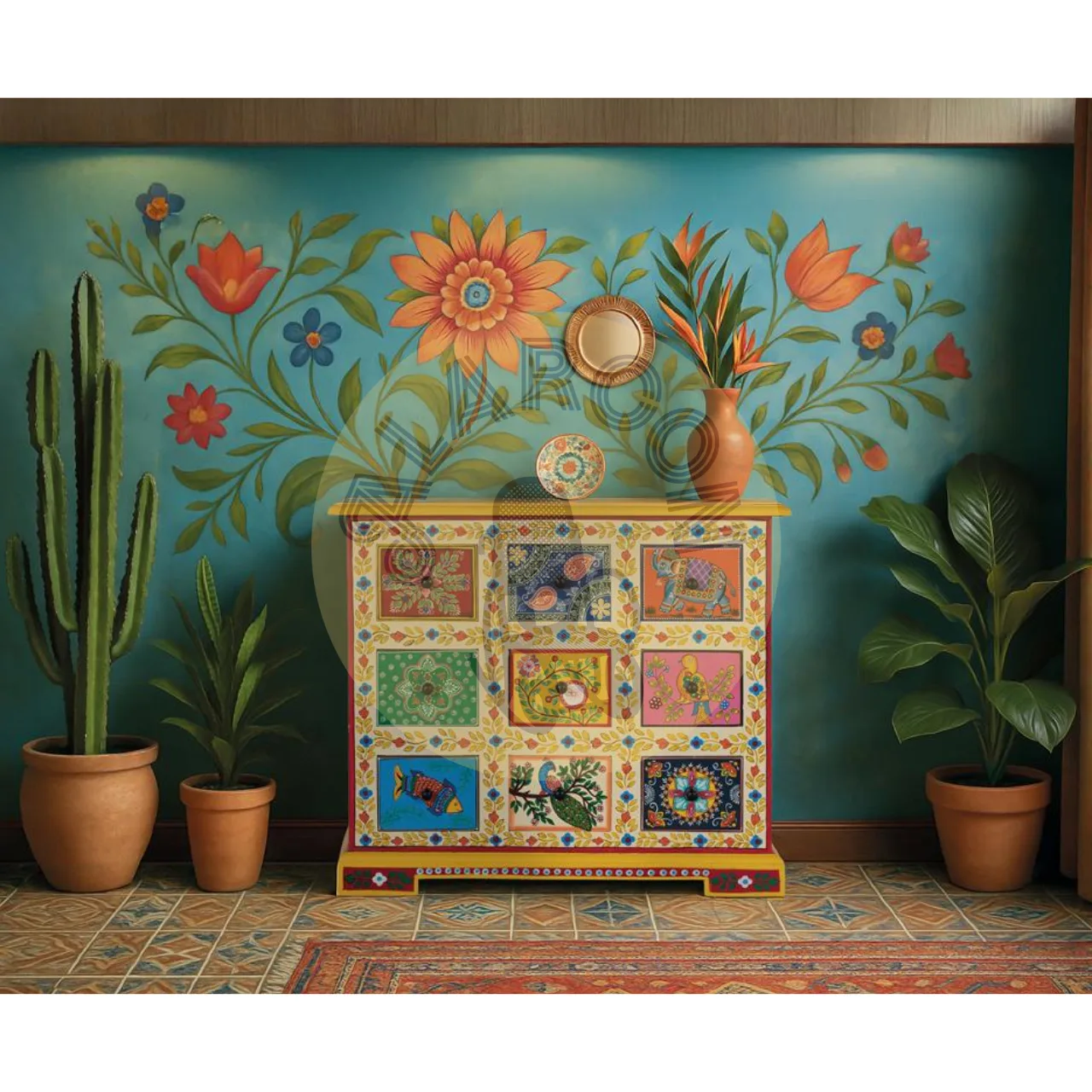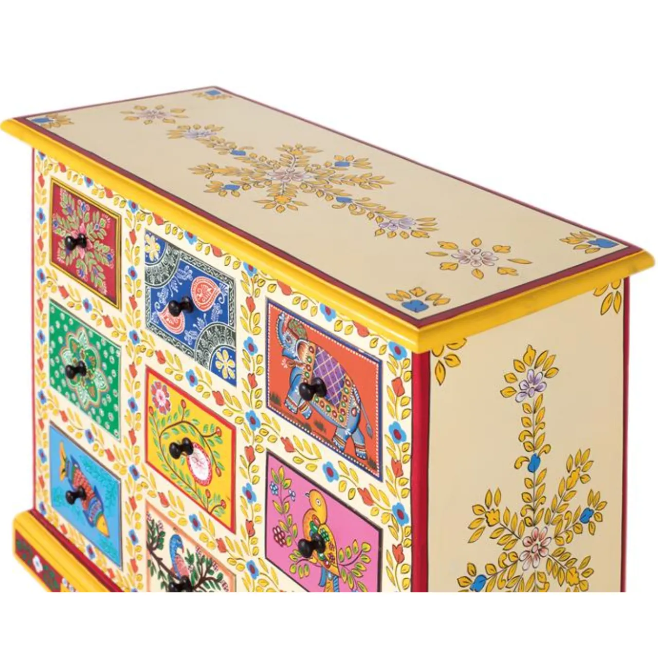 Este mueble auxiliar de madera maciza de mango destaca por su diseño artesanal con 9 cajones únicos, cada uno decorado con motivos inspirados en el arte popular indio. Los colores vivos y las formas detalladas convierten cada frente en una pieza decorativa que aporta personalidad a cualquier espacio.