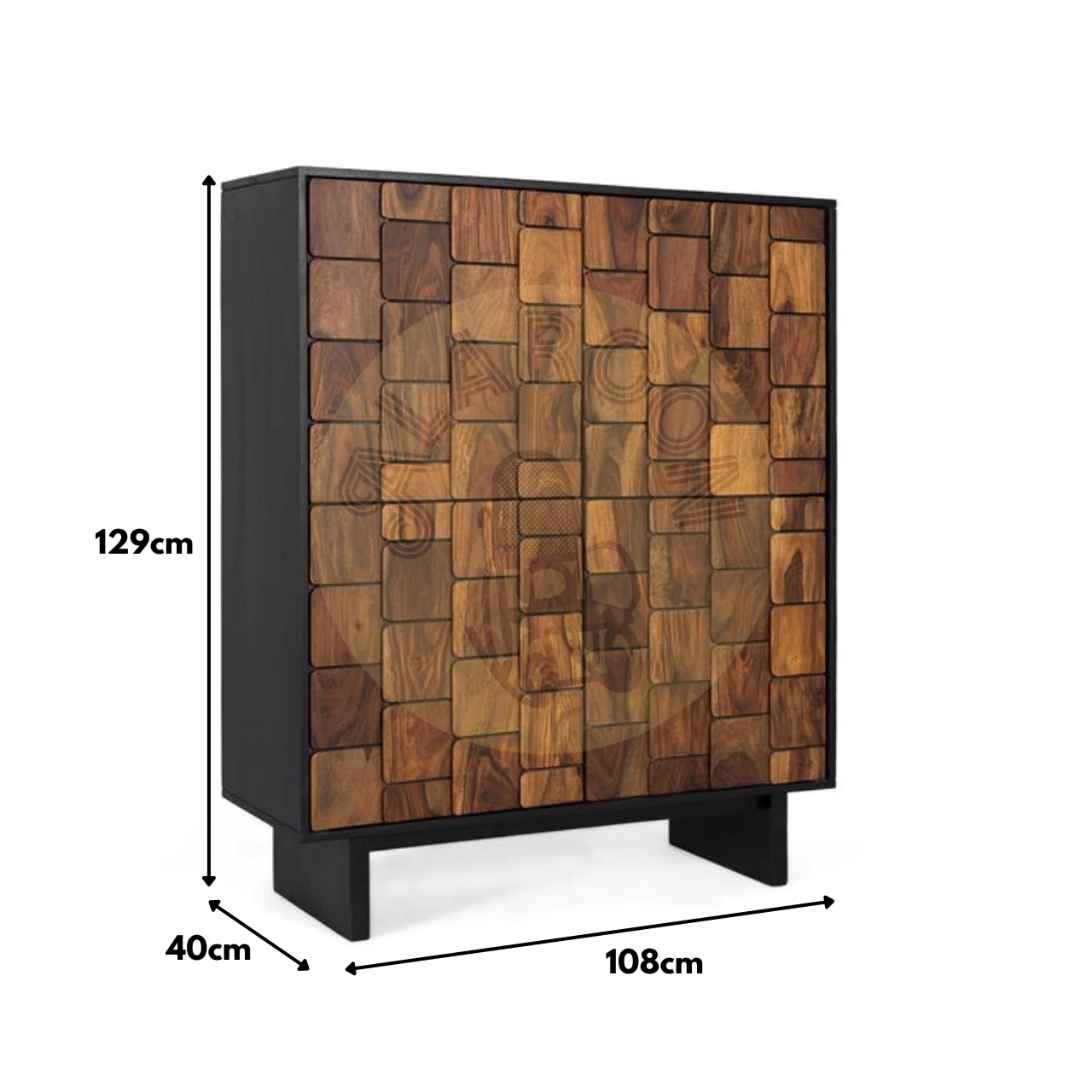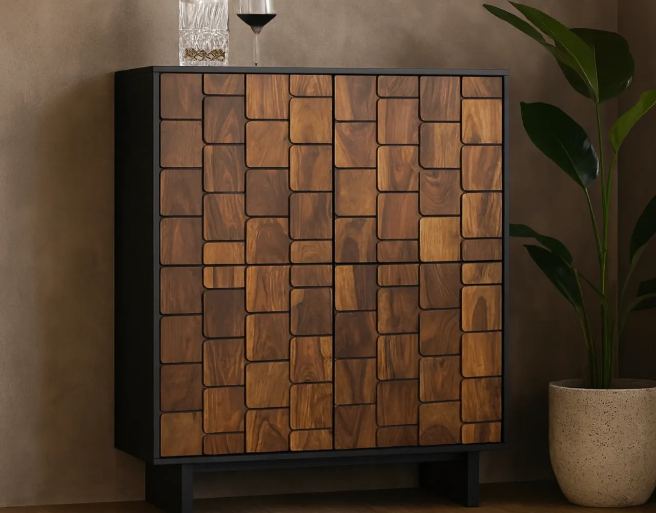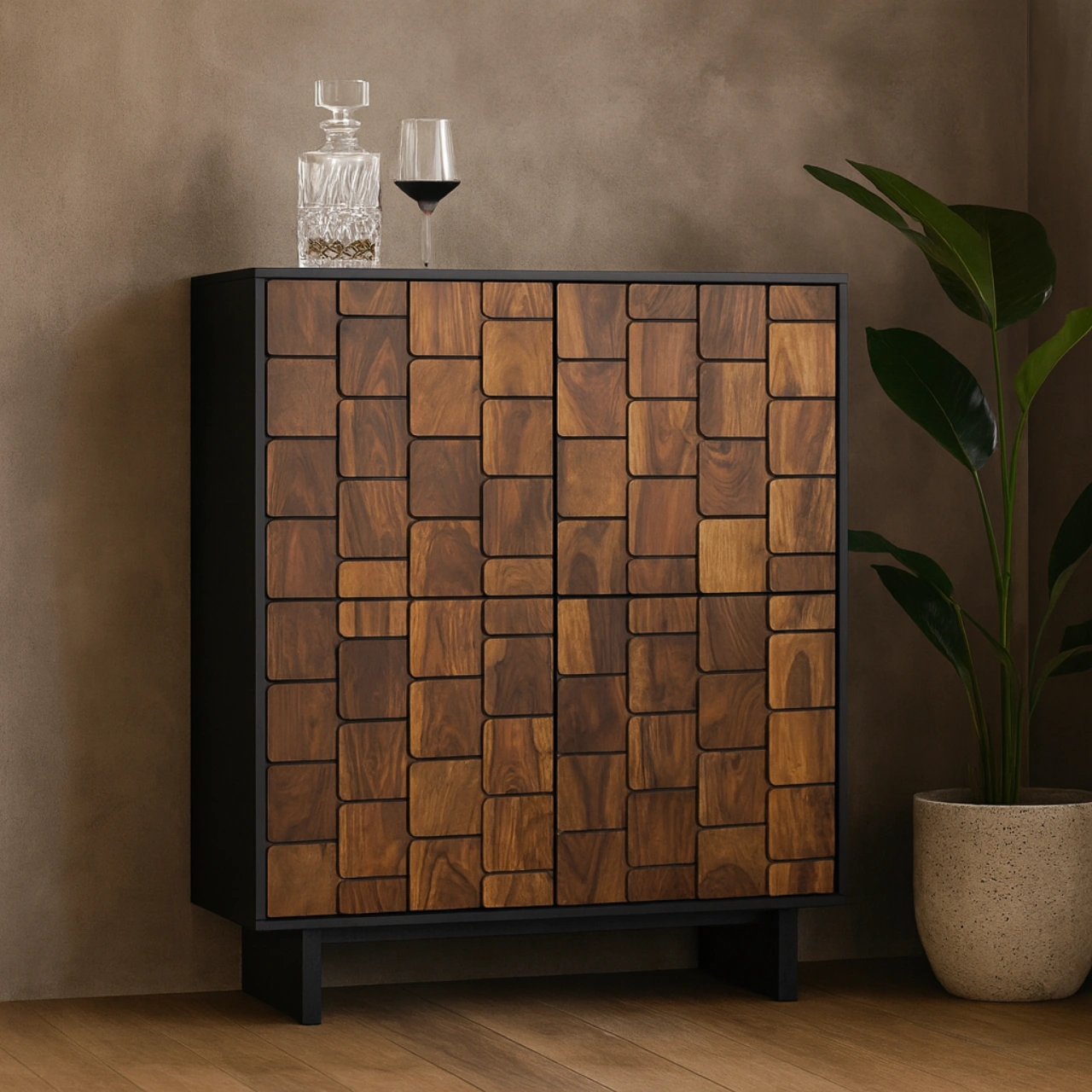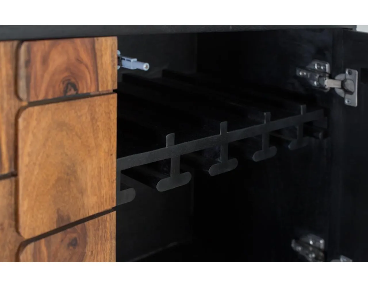 Aporta carácter a tu zona de estar con este mueble bar de madera maciza de mango en acabado wengué, un diseño contemporáneo que destaca por sus puertas de sheesham con relieve tridimensional, creando profundidad y un efecto visual sofisticado. Su estética limpia se refuerza con el sistema de apertura push, pensado para mantener una línea moderna y sin tiradores.