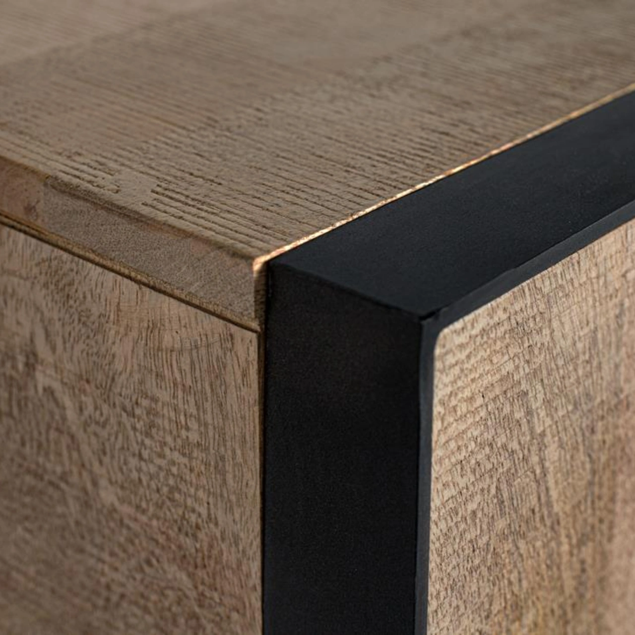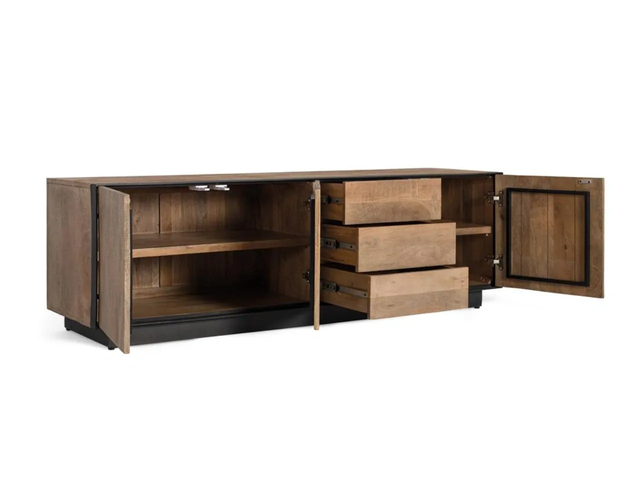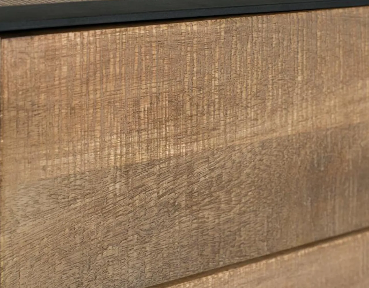 Aporta carácter y funcionalidad a tu salón con este mueble de TV fabricado en madera de mango natural, un material resistente que destaca por sus vetas naturales y su estética auténtica. Su diseño combina la calidez de la madera maciza con un elegante perfil de hierro negro, creando un equilibrio perfecto entre estilo industrial y decoración contemporánea.