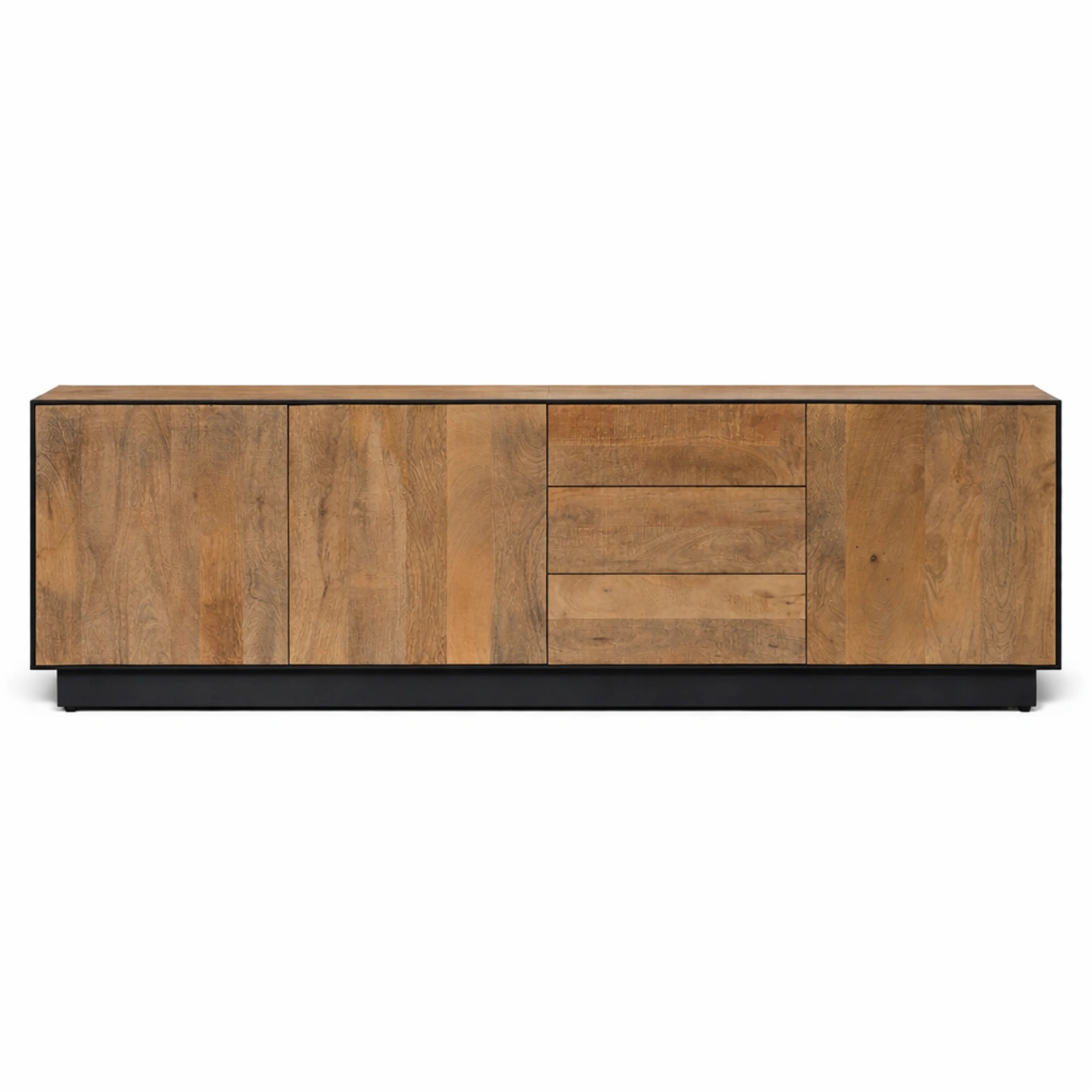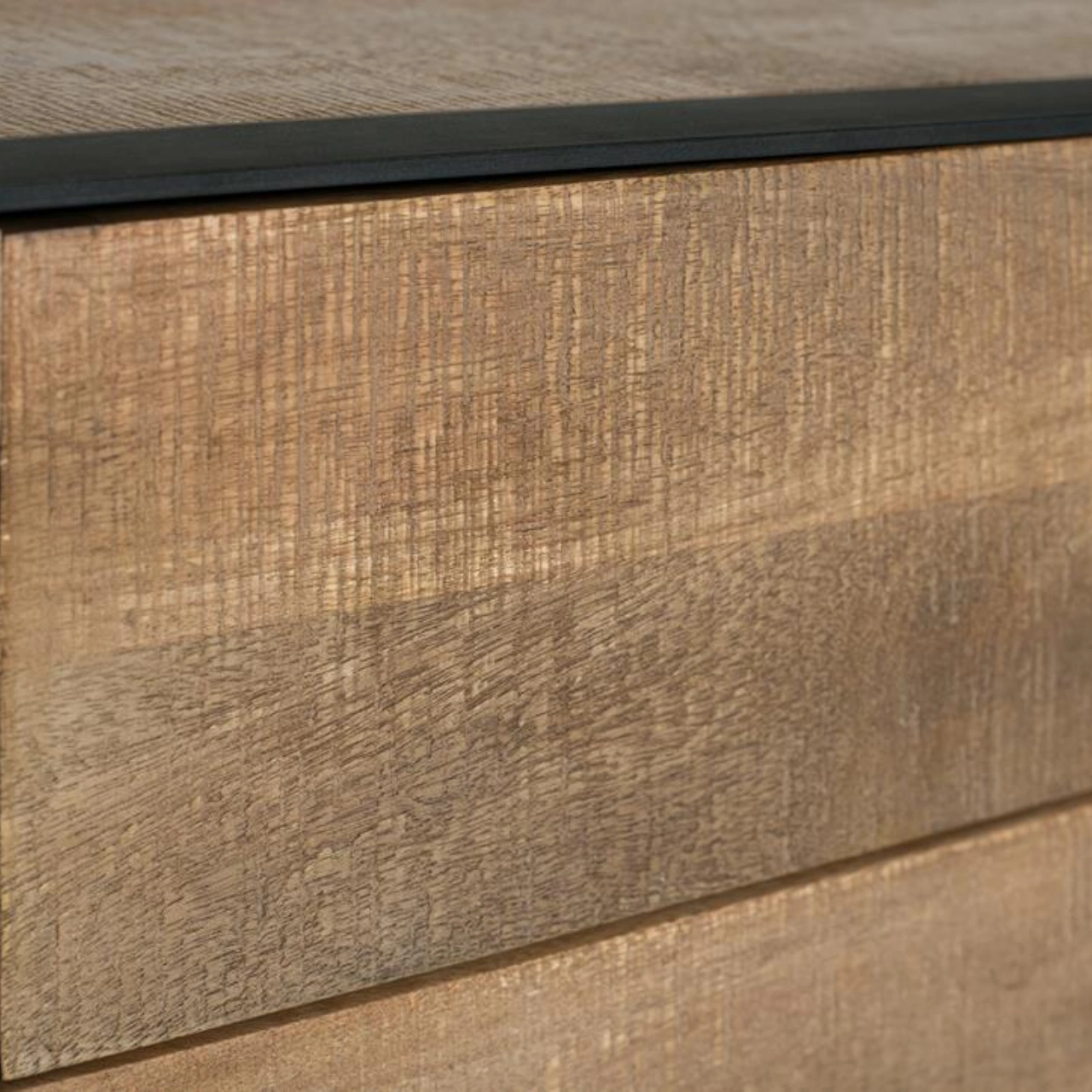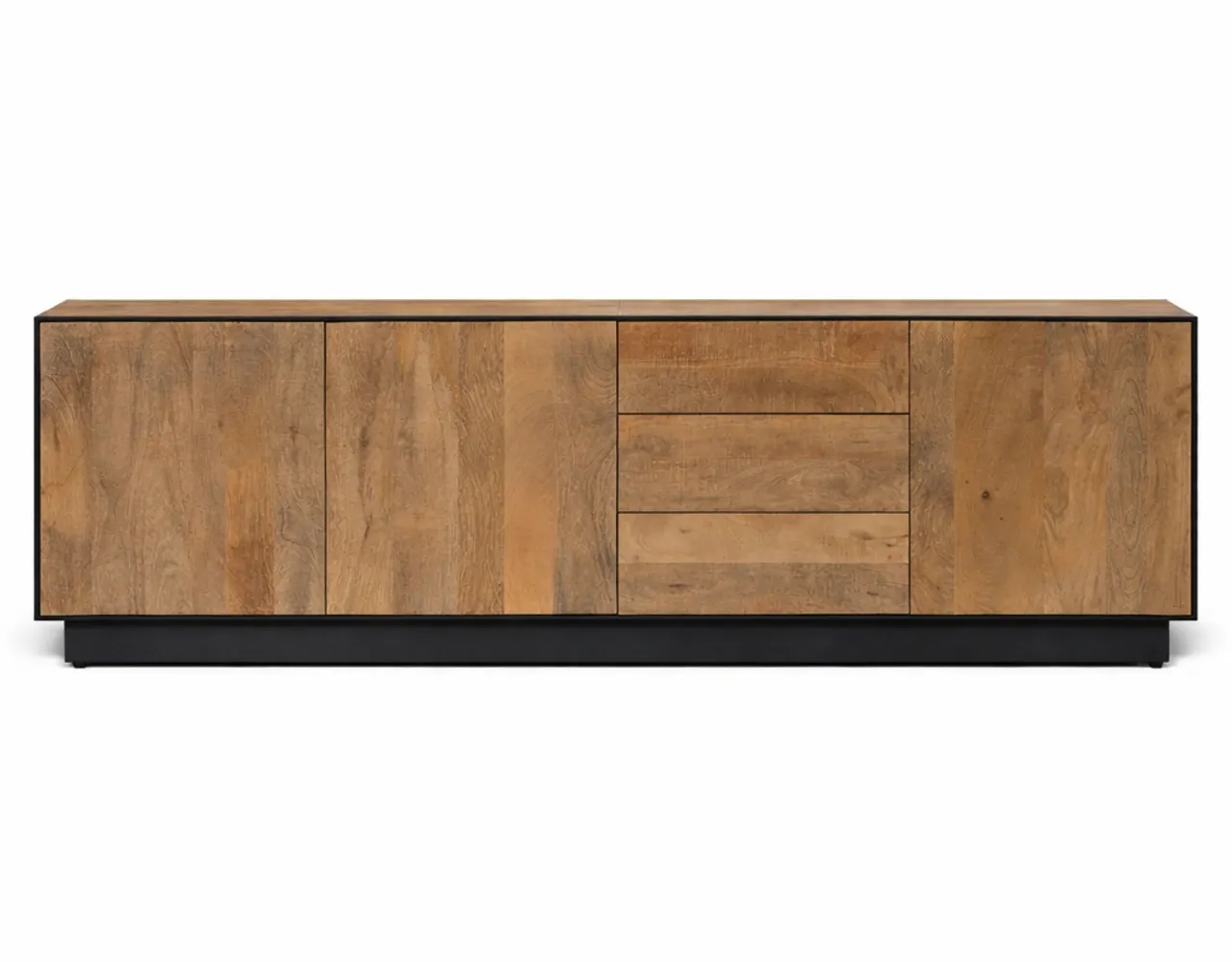 Aporta carácter y funcionalidad a tu salón con este mueble de TV fabricado en madera de mango natural, un material resistente que destaca por sus vetas naturales y su estética auténtica. Su diseño combina la calidez de la madera maciza con un elegante perfil de hierro negro, creando un equilibrio perfecto entre estilo industrial y decoración contemporánea.