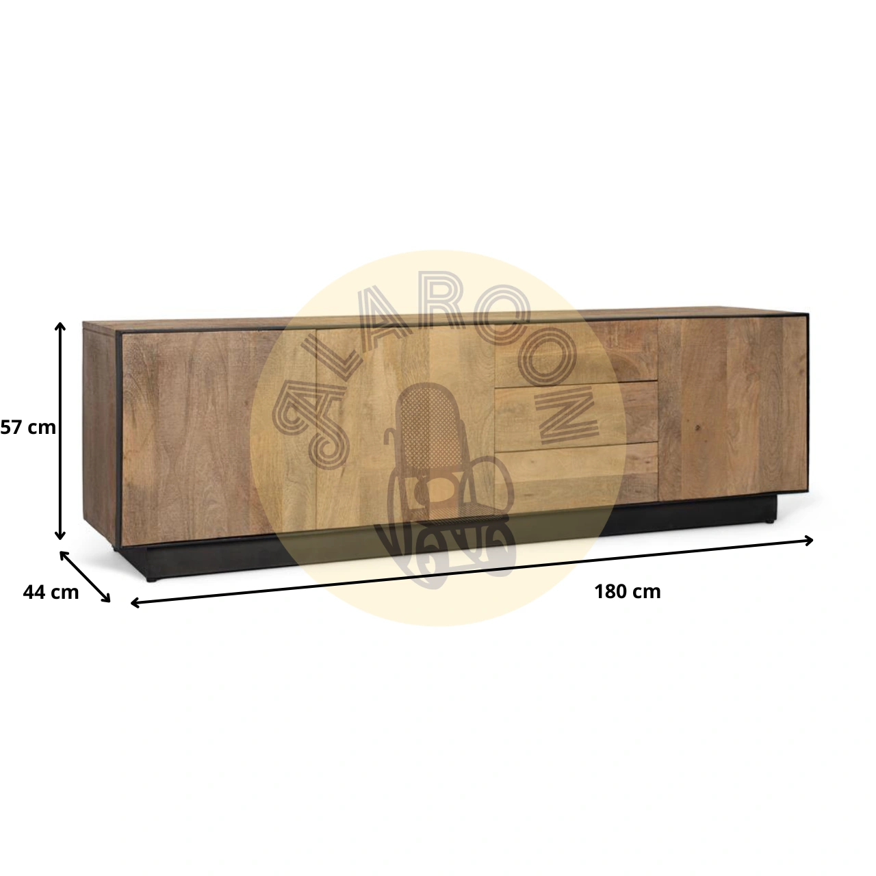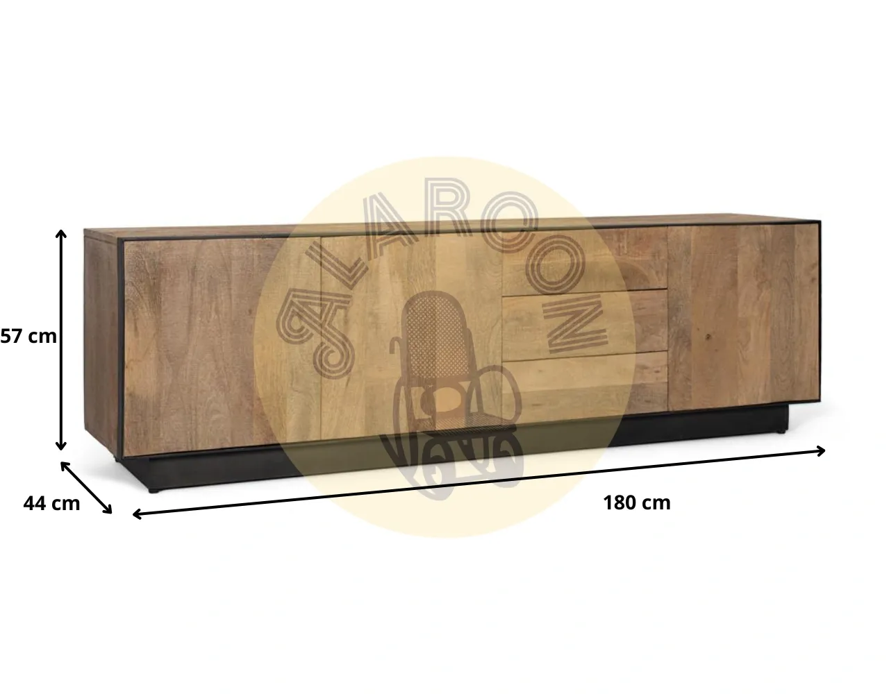 Su formato de 180 cm de largo, 57 cm de alto y 44 cm de ancho ofrece una presencia sólida y proporciona una amplia superficie para televisores de gran formato. La estructura con zócalo metálico refuerza su estabilidad y aporta un acabado moderno que encaja fácilmente en salones actuales, lofts o ambientes de inspiración urbana.