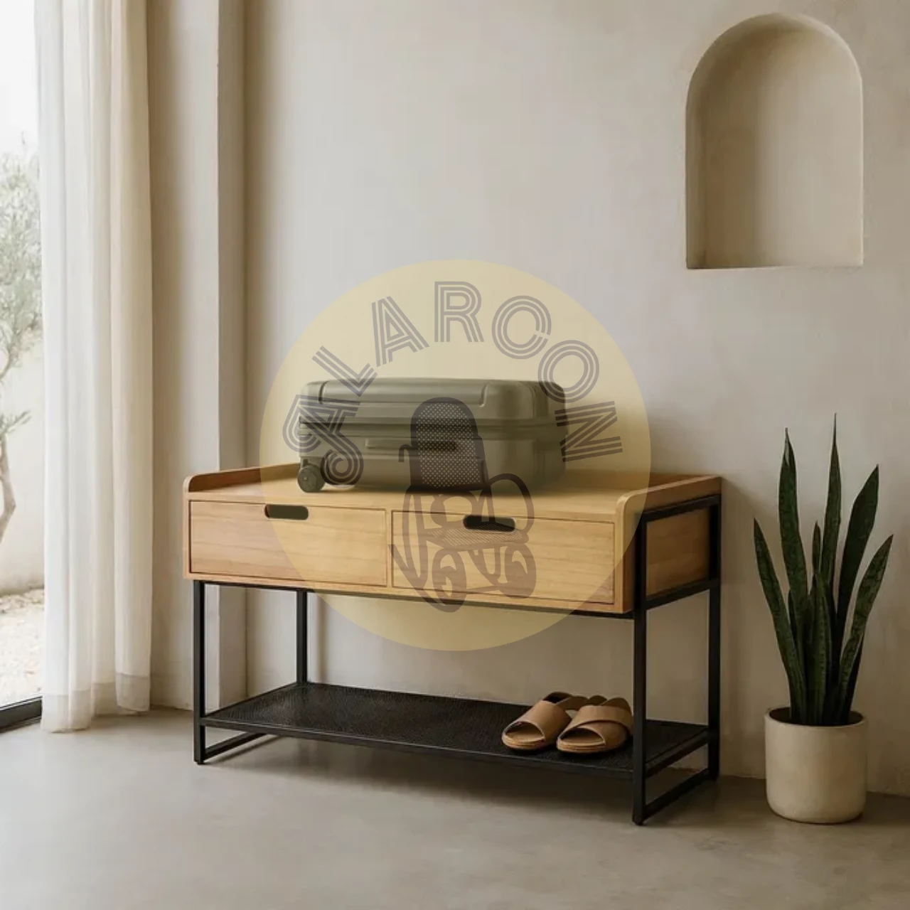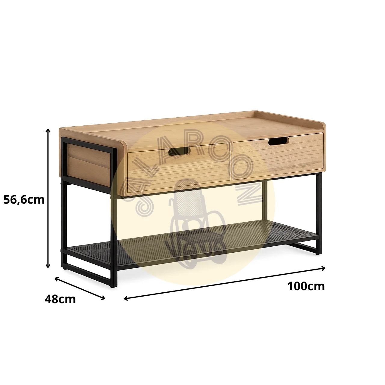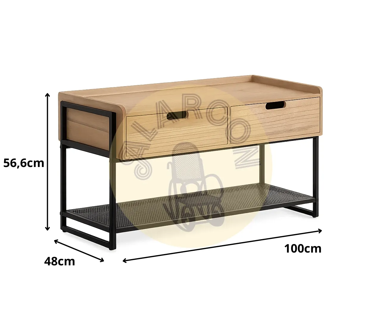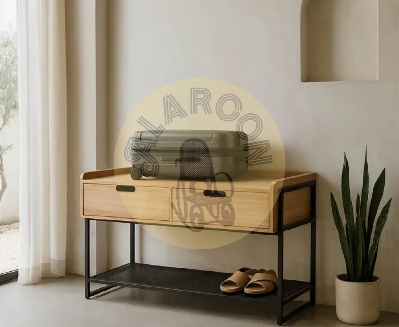 Este mueble recibidor combina una estructura de hierro resistente con dos cajones de 46×15 cm, ideales para mantener tus objetos personales siempre en orden. Su diseño moderno aporta un estilo funcional que se adapta fácilmente a diferentes espacios del hogar.