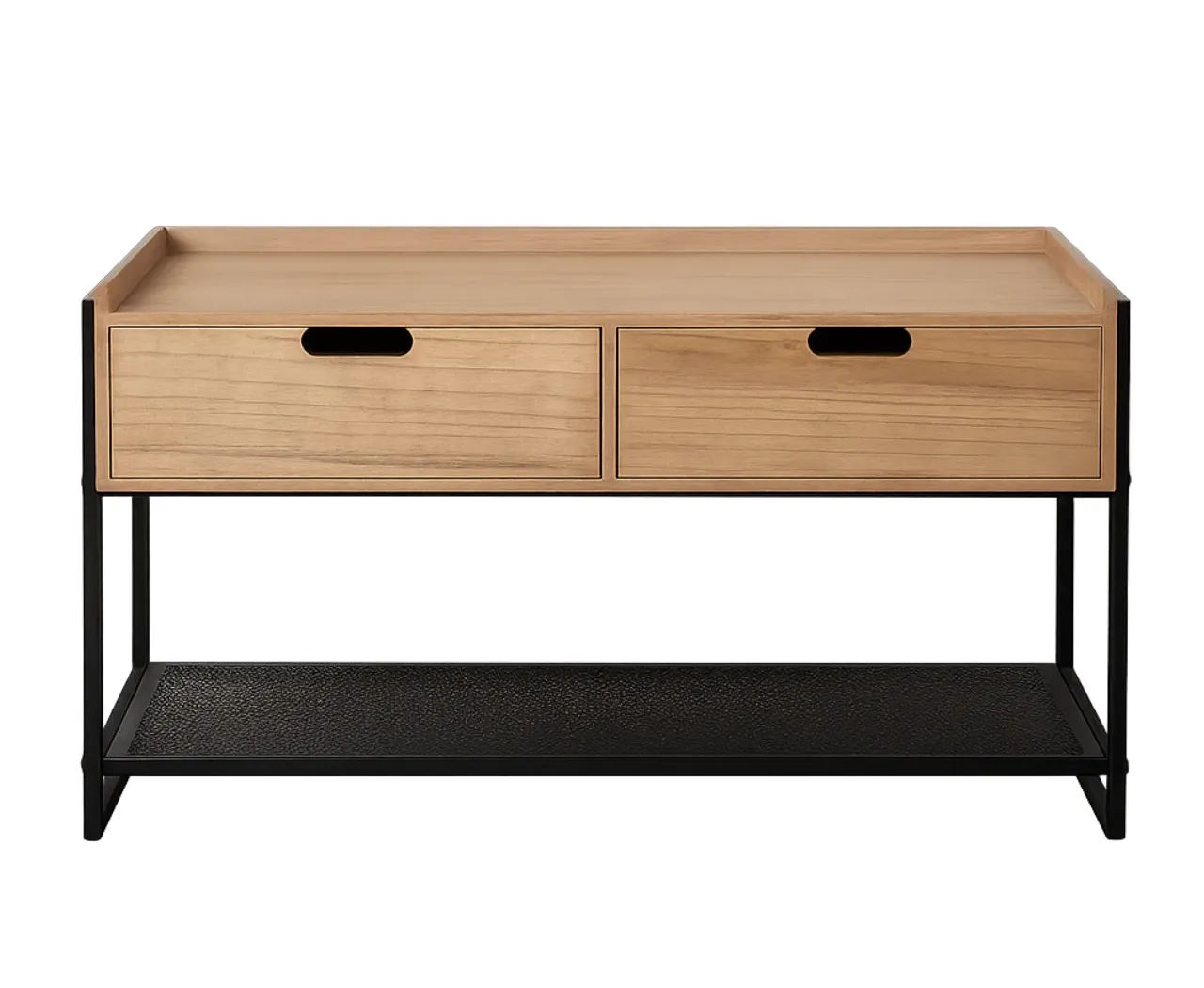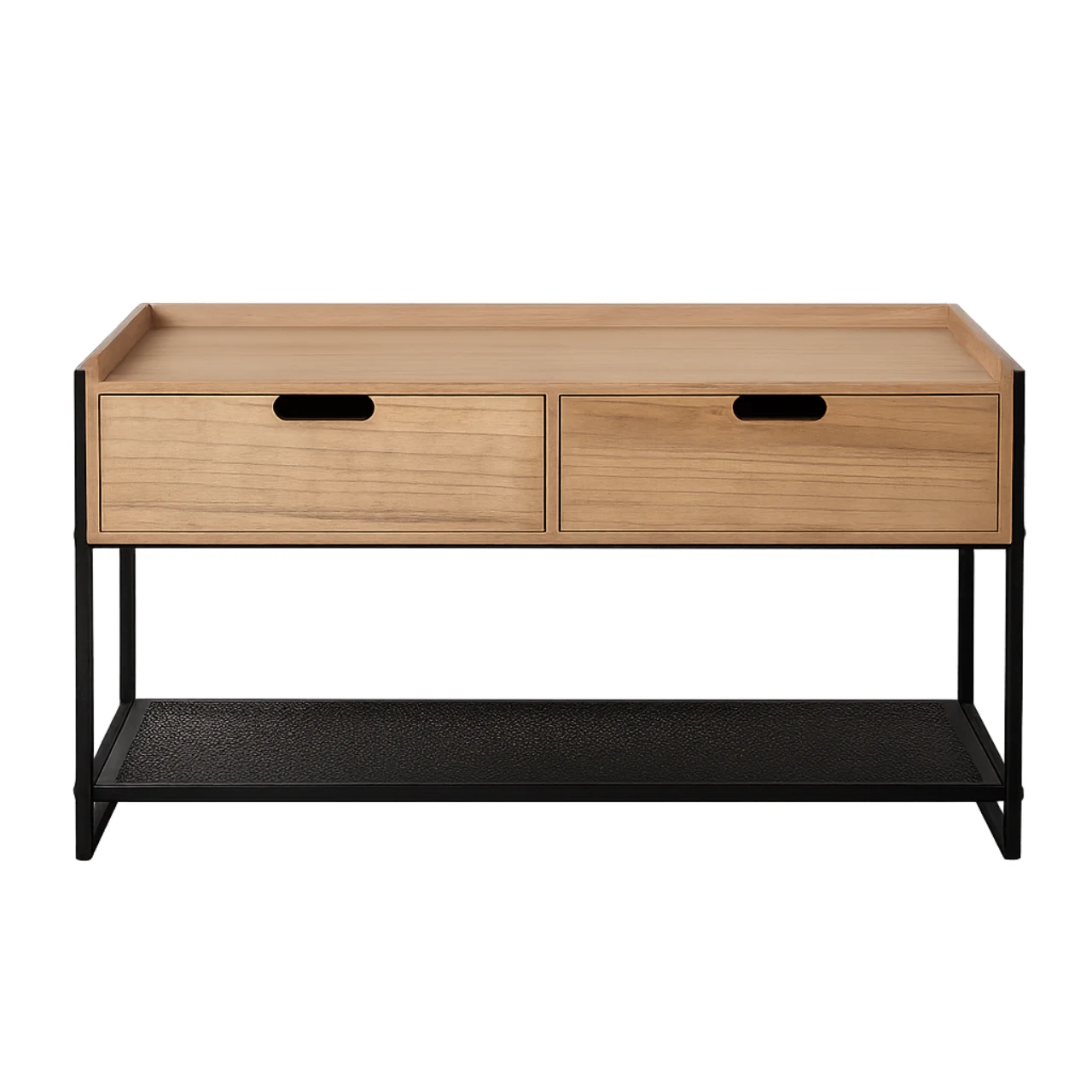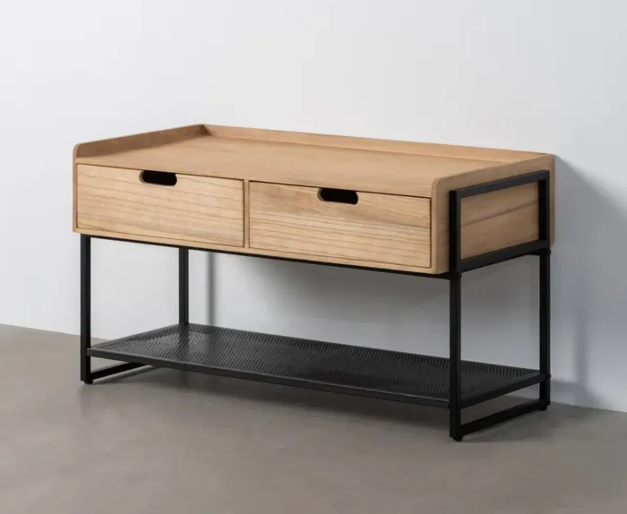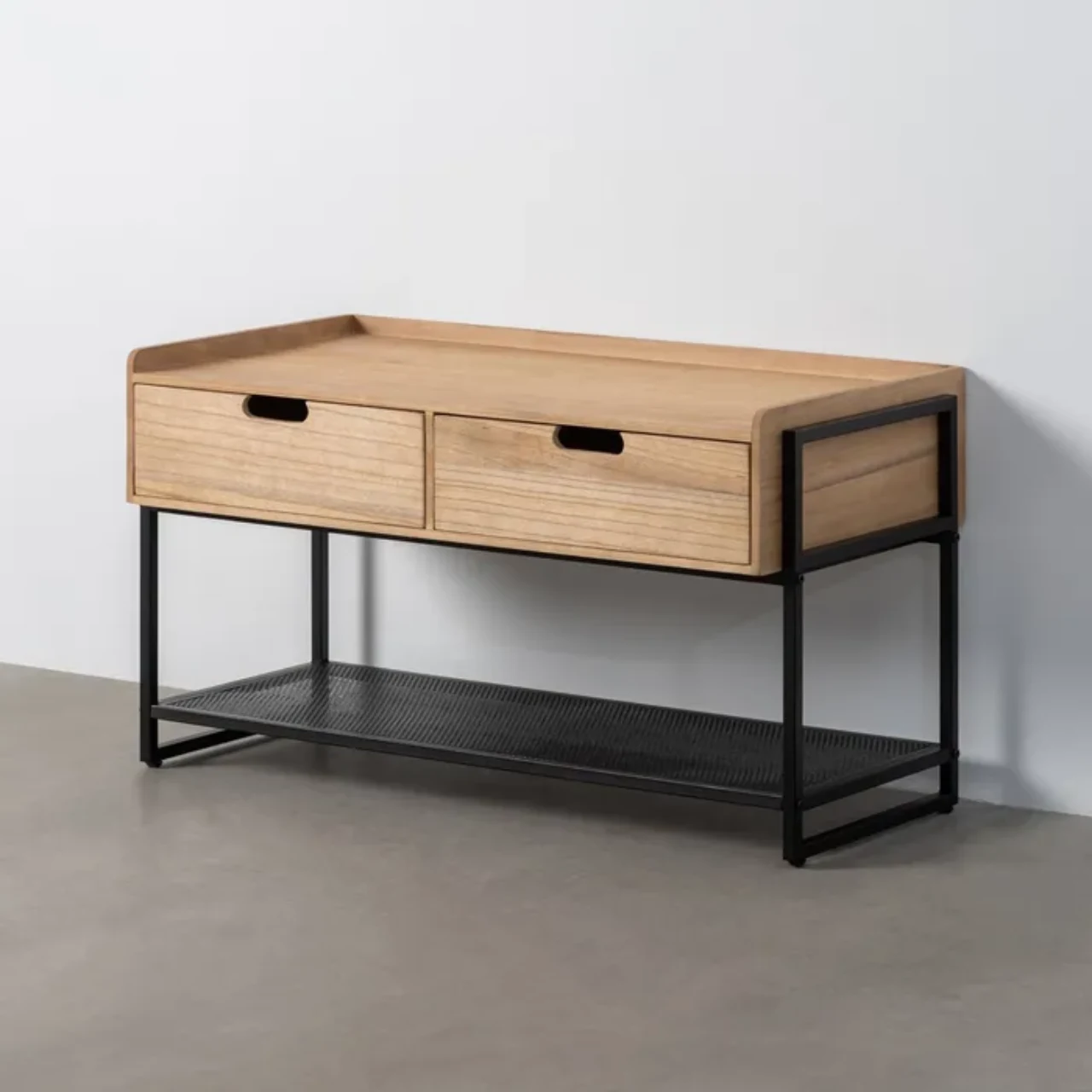 Este mueble recibidor combina una estructura de hierro resistente con dos cajones de 46×15 cm, ideales para mantener tus objetos personales siempre en orden. Su diseño moderno aporta un estilo funcional que se adapta fácilmente a diferentes espacios del hogar.