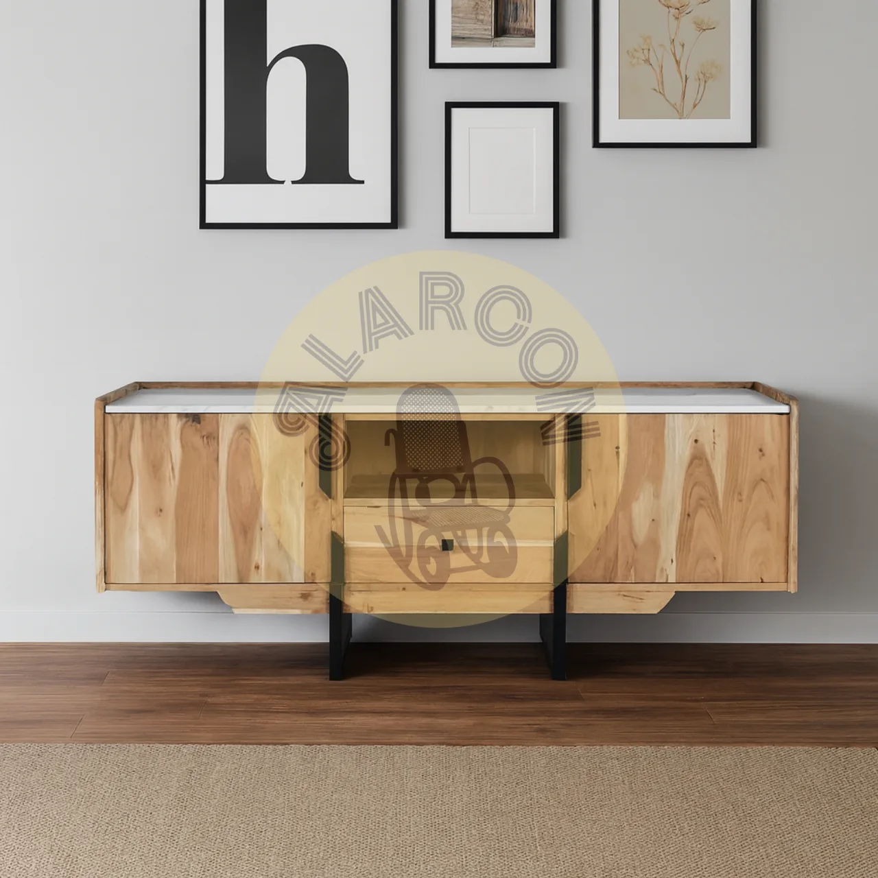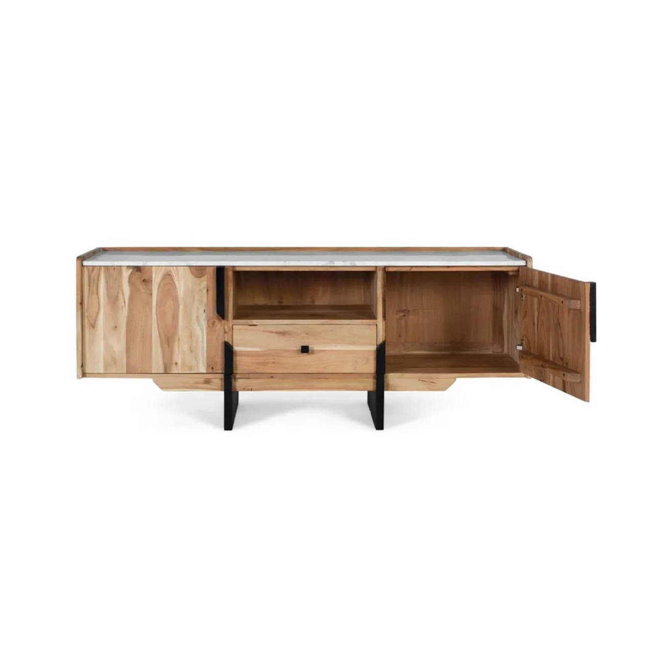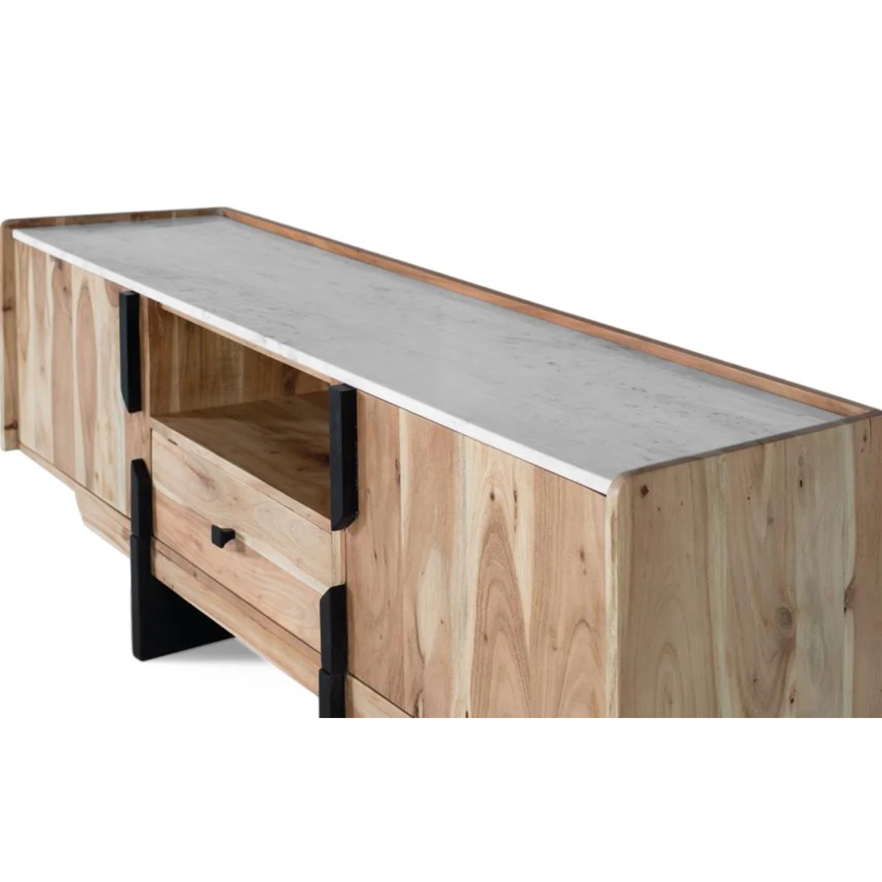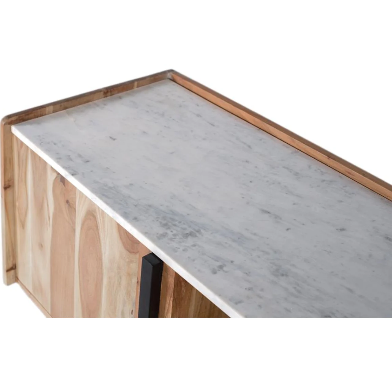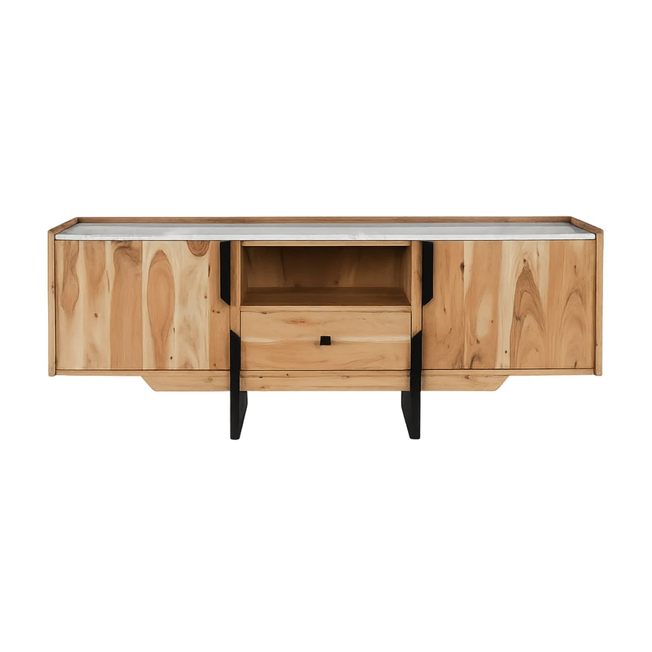 Este mueble de TV destaca por la combinación de madera maciza de acacia en acabado natural y una tapa superior de mármol blanco con vetas grises, creando un contraste elegante y atemporal. Sus vetas visibles aportan carácter único, convirtiéndolo en una pieza protagonista del salón.