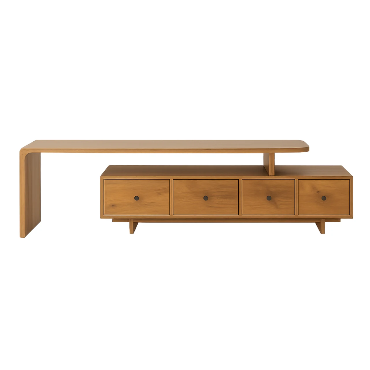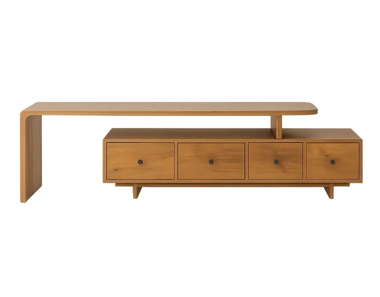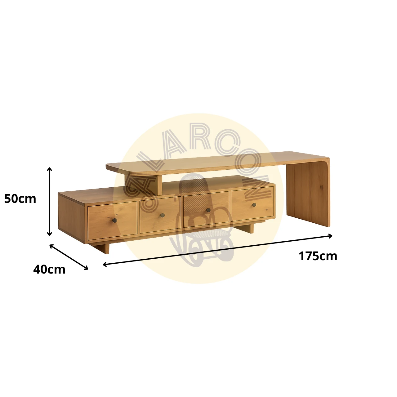 El módulo superior mide 160x40x50 cm y el inferior 145x40x35 cm, creando una estructura versátil para colocar la televisión y organizar dispositivos electrónicos. Los cajones de 34,5×20 cm ofrecen espacio práctico para guardar accesorios sin perder estética.