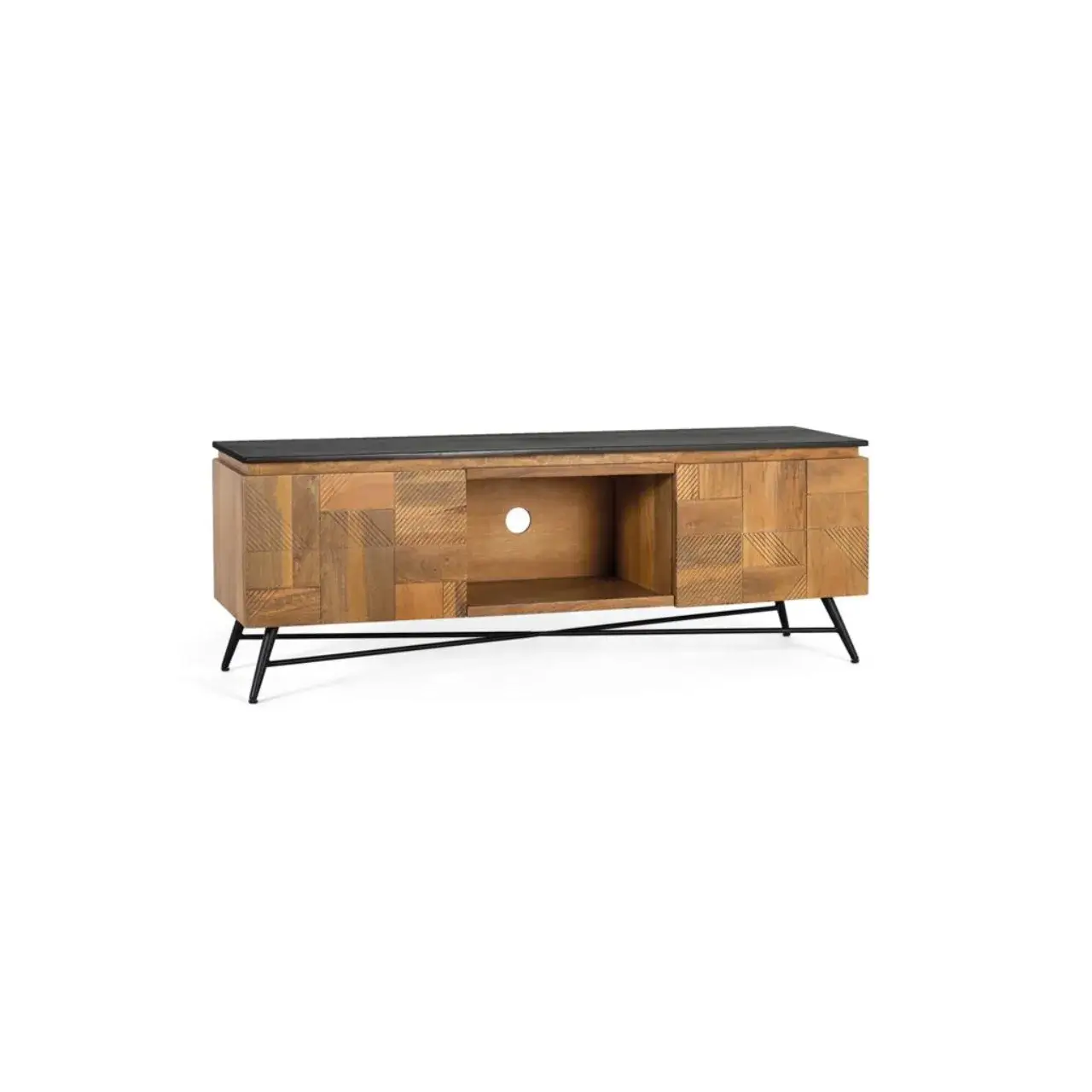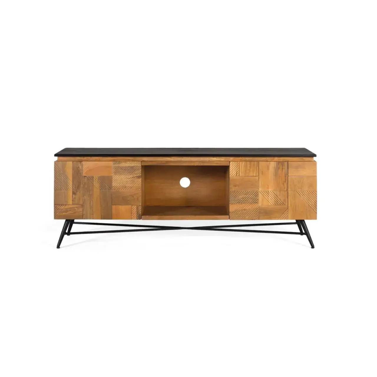 Este mueble de TV de madera de mango fusiona diseño y funcionalidad con un estilo moderno y elegante. El acabado natural de la madera resalta las vetas únicas, mientras que la tapa en negro crea un contraste sofisticado y atemporal.