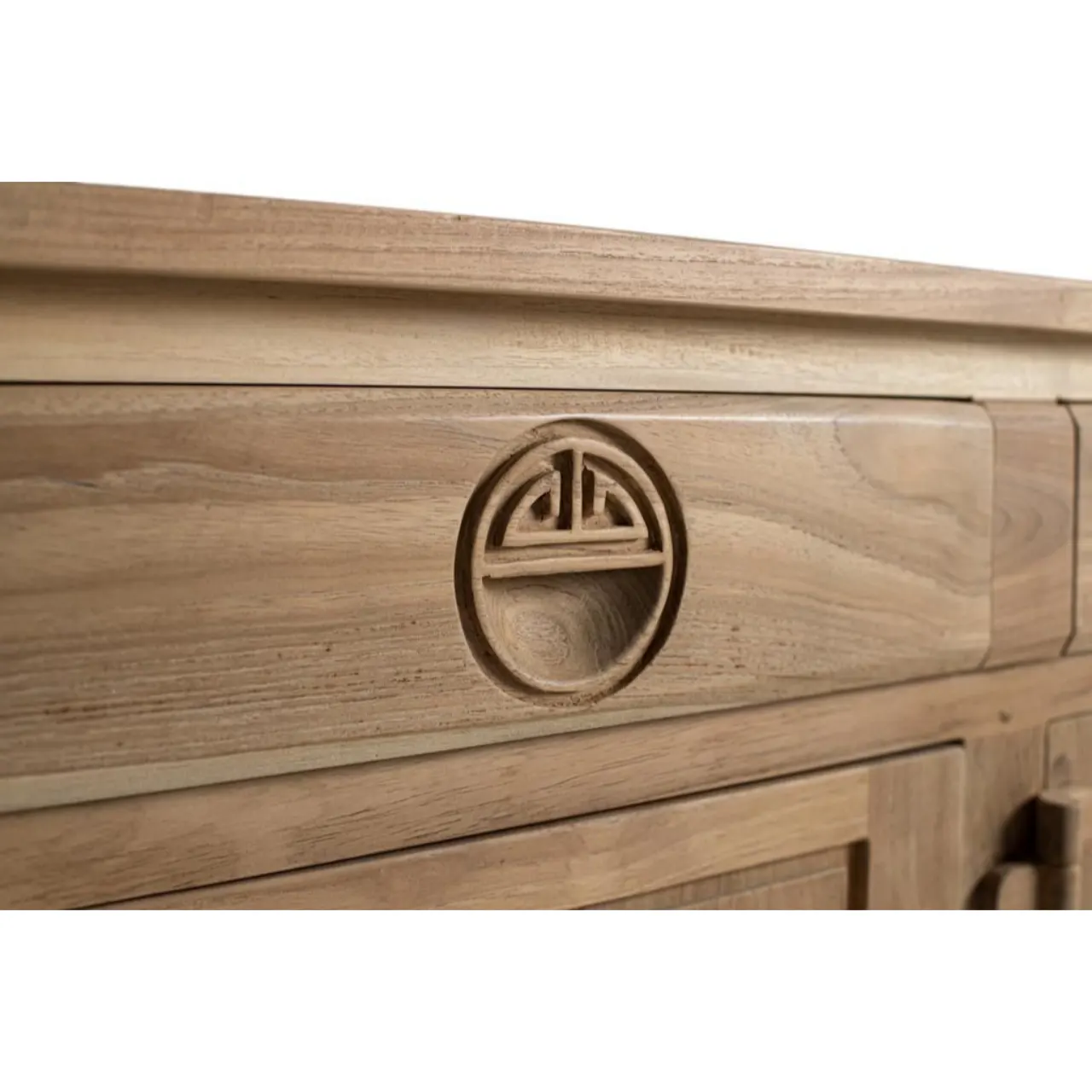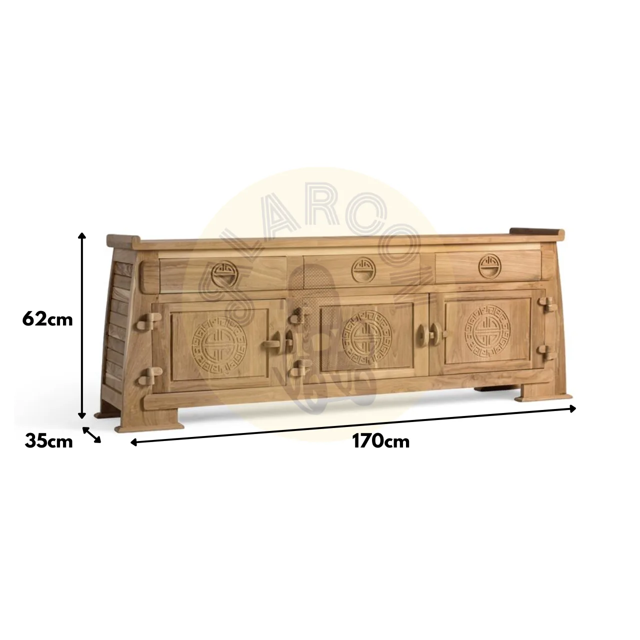 Con unas medidas de 170 cm de largo, 62 cm de alto y 35 cm de ancho, dispone de tres cajones superiores con apertura de uñero y tres puertas inferiores decoradas con motivos geométricos tallados a mano, inspirados en la artesanía oriental.