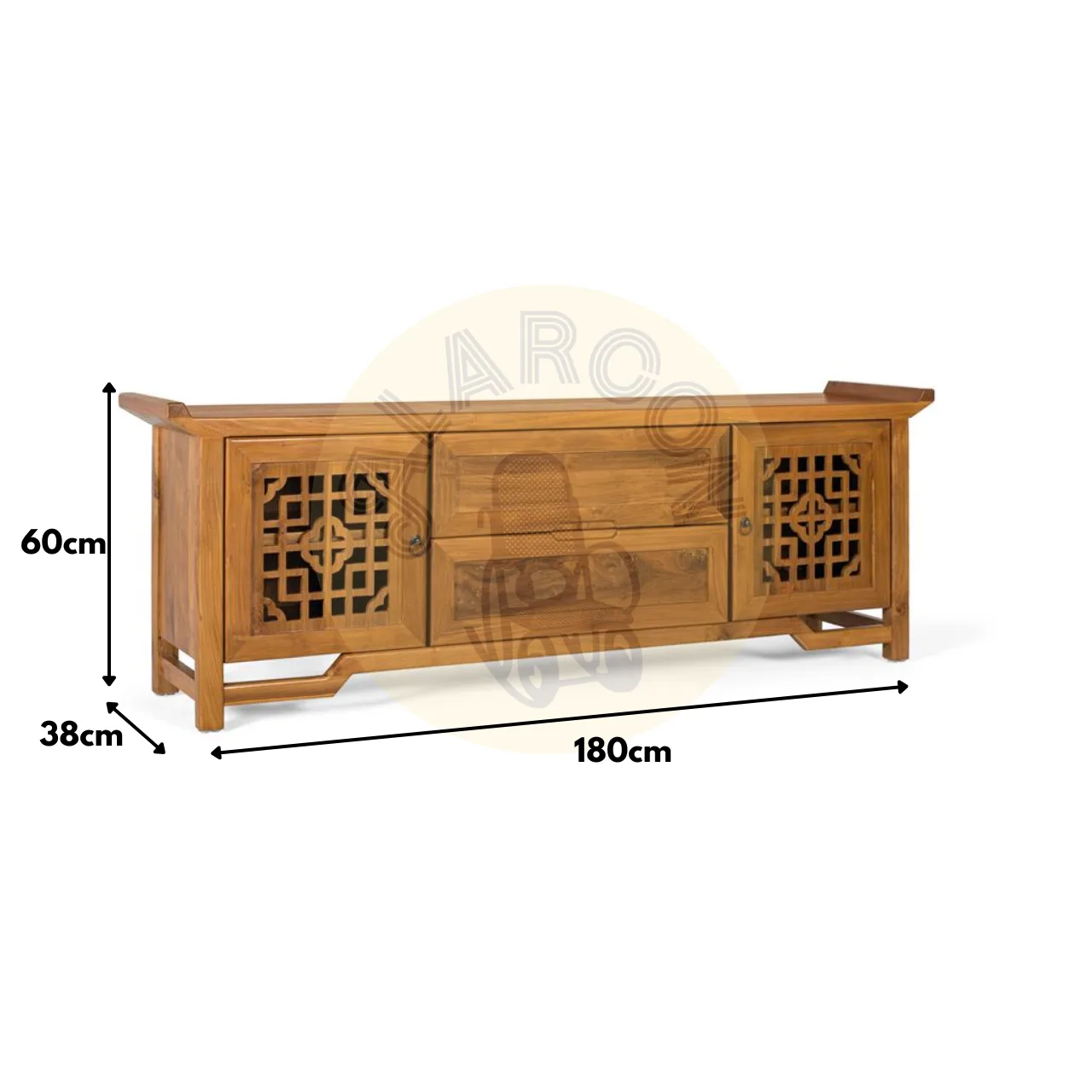 Con unas medidas de 180 cm de largo, 60 cm de alto y 38 cm de ancho, este mueble cuenta con dos cajones centrales con apertura mediante uñero integrado y dos puertas laterales decoradas con un tallado geométrico oriental, que añade carácter y elegancia al conjunto.