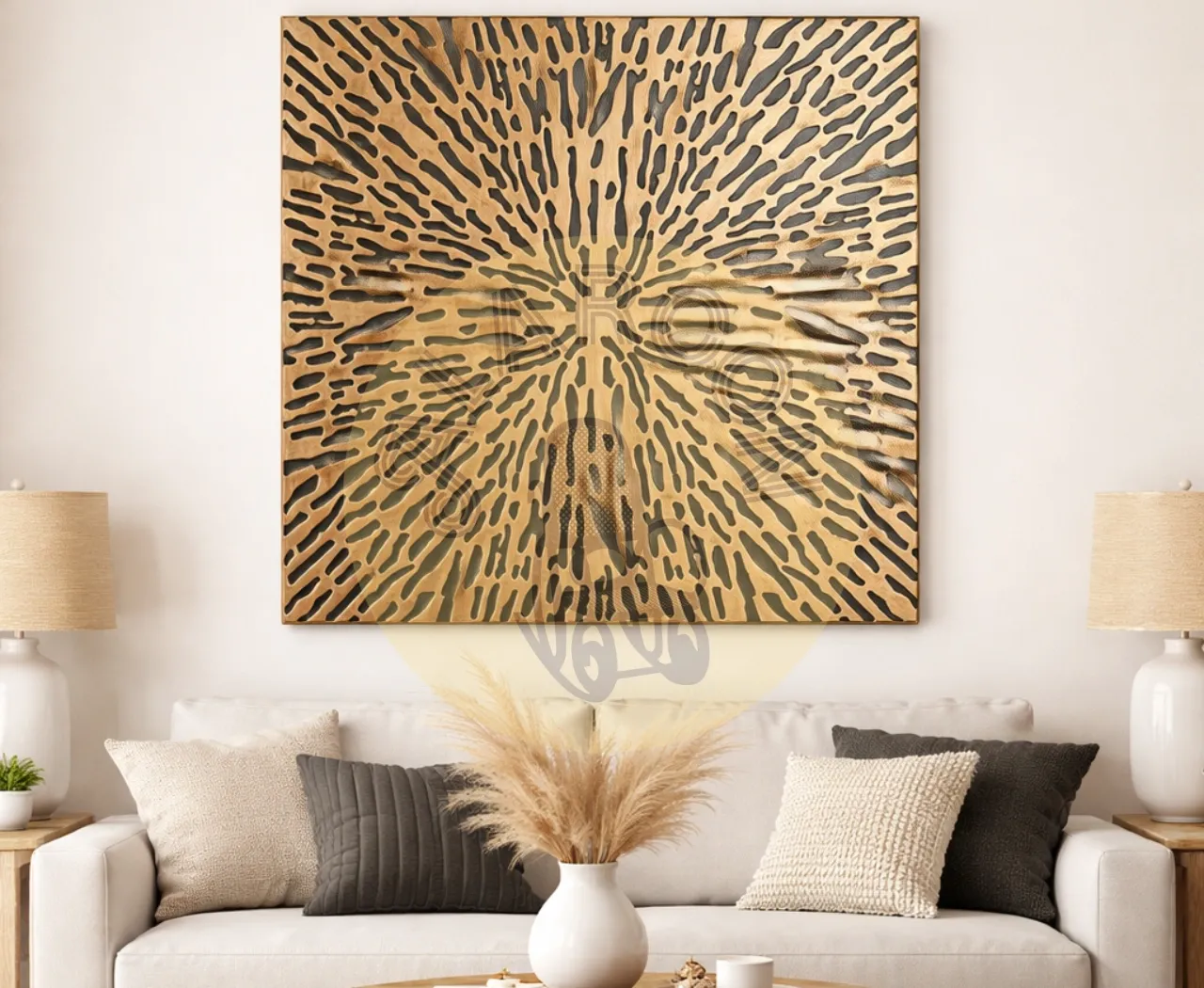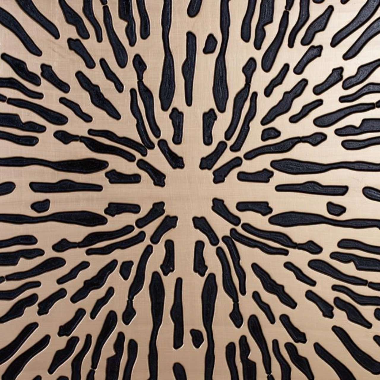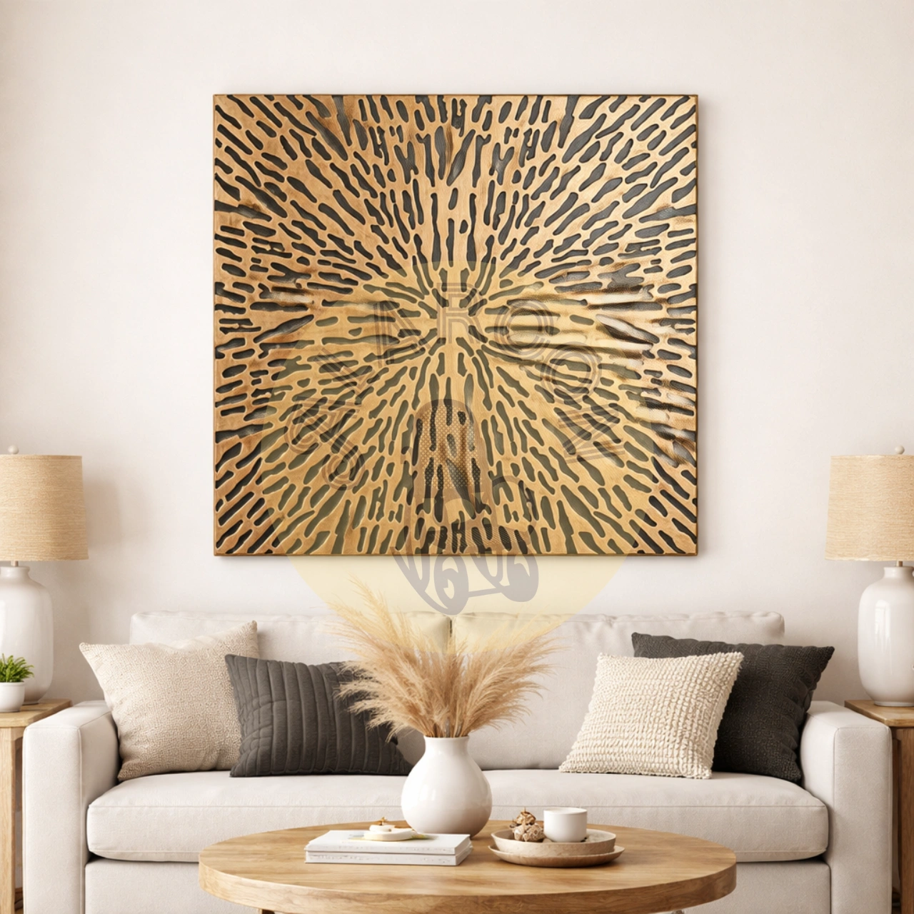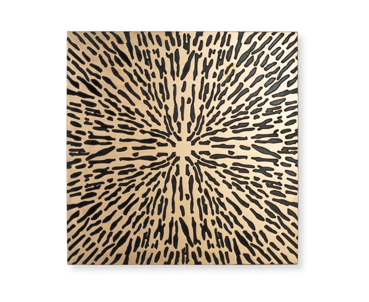 Fabricado de forma artesanal en MDF, cada pieza presenta matices únicos en el acabado, lo que refuerza su autenticidad y valor decorativo. Su formato cuadrado de 120×120 cm y 3 cm de grosor lo convierte en un elemento protagonista sin recargar el entorno.