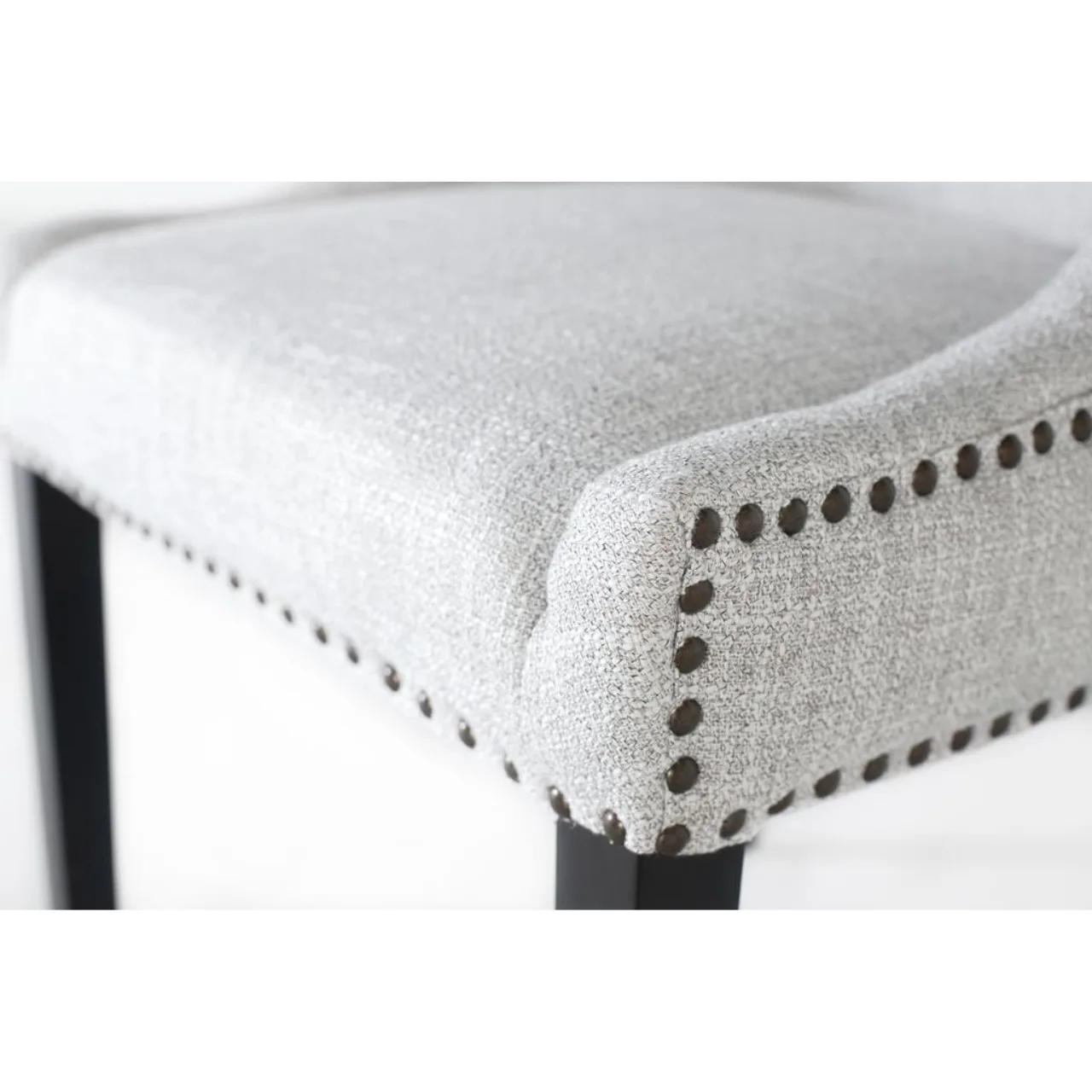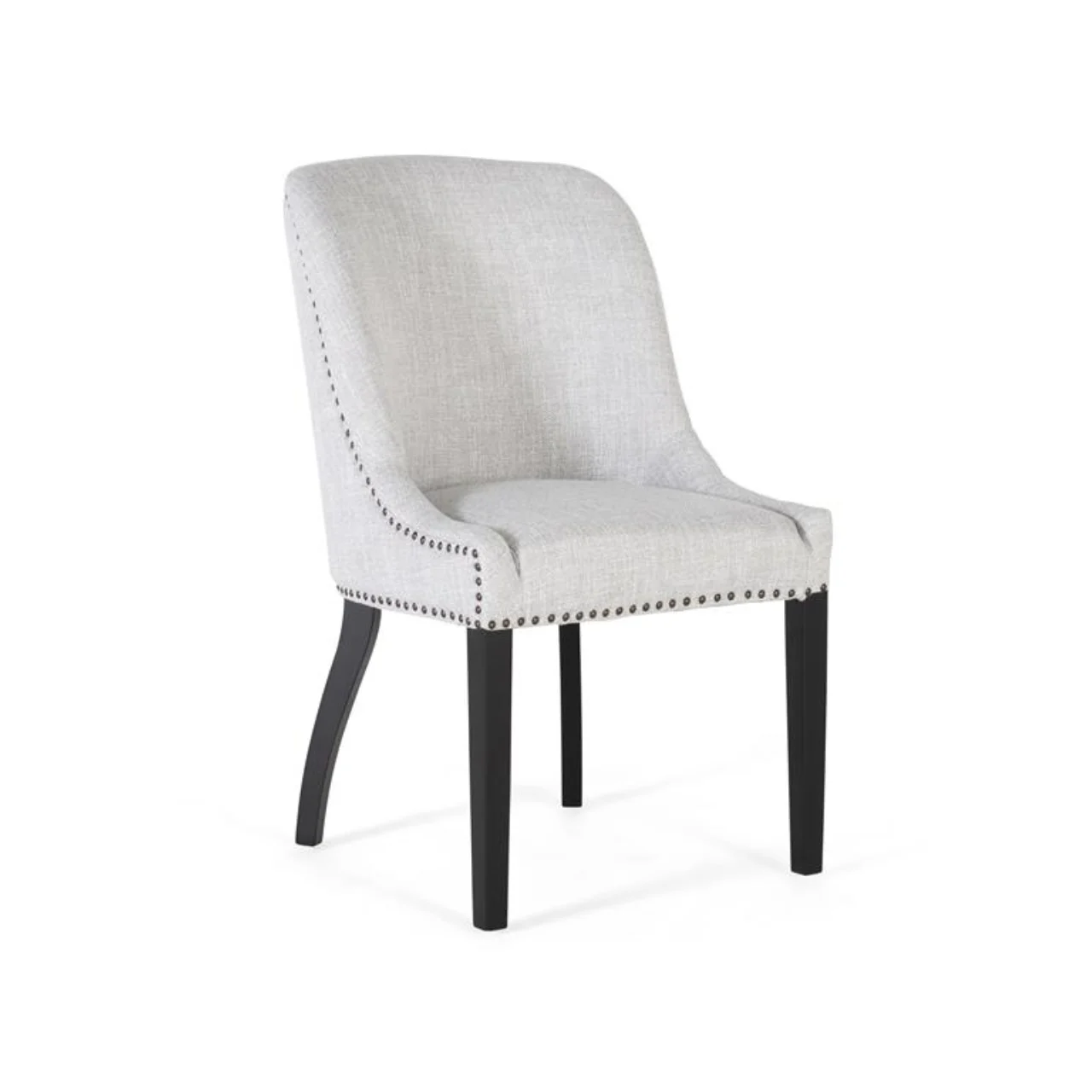 Descubre la elegancia en cada detalle con este set de 2 sillas tapizadas. Su tejido de color gris claro y las patas de madera de tono negro aportan un toque sofisticado a cualquier ambiente. Equipadas con tacos, estas sillas aseguran también una total protección para tu suelo evitando ralladuras.