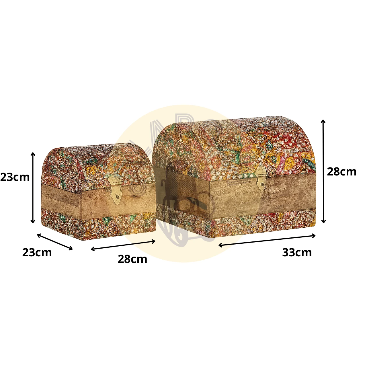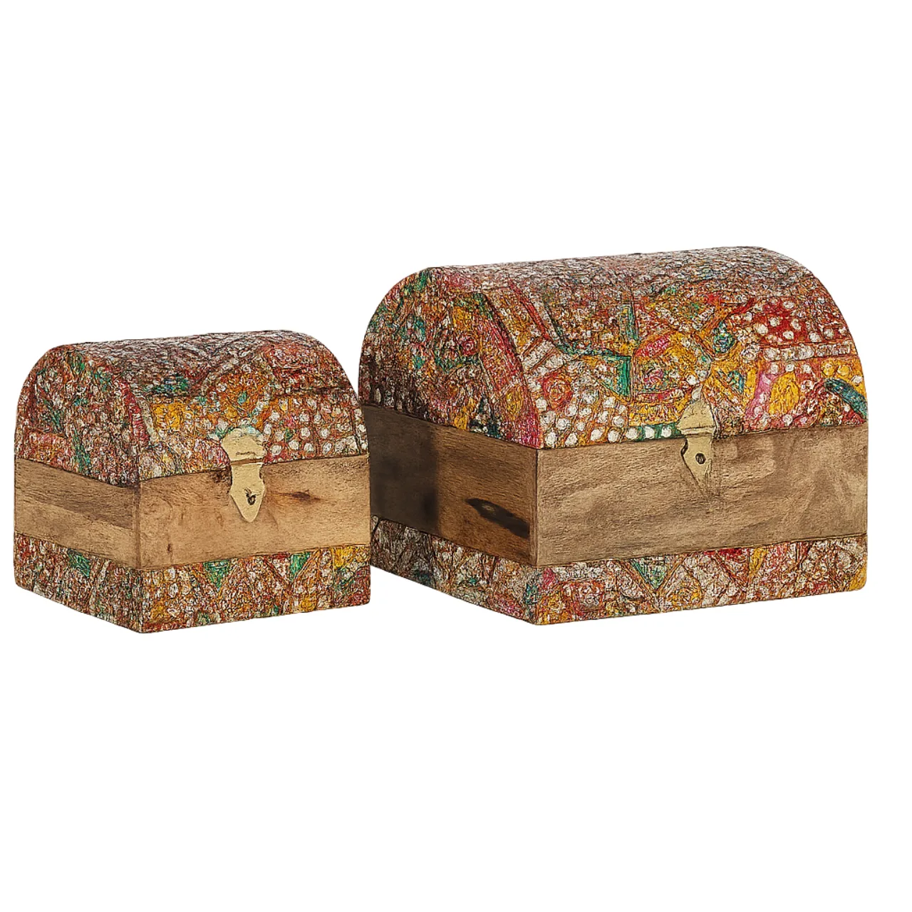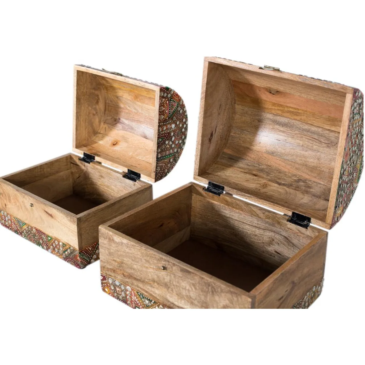Elige un set de 2 baúles joyeros fabricados en madera de mango natural, perfectos para añadir un toque distintivo a cualquier estancia. Su diseño combina un acabado rústico con tapa curva decorada a mano, creando una pieza con carácter propio.