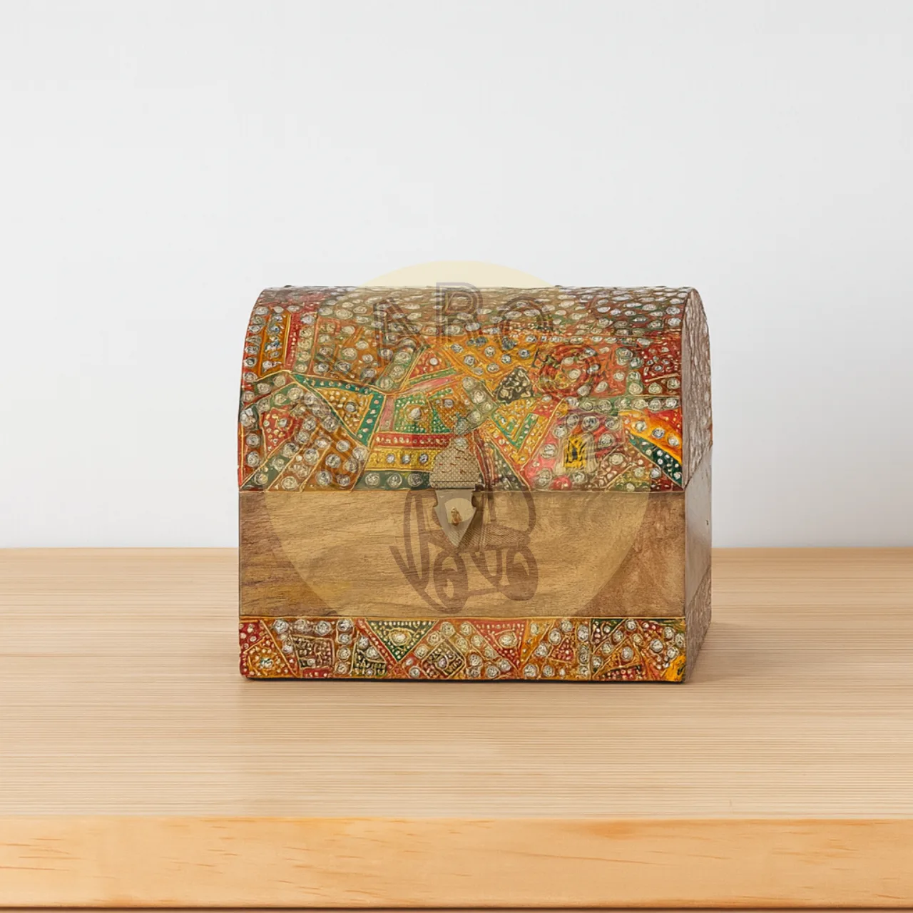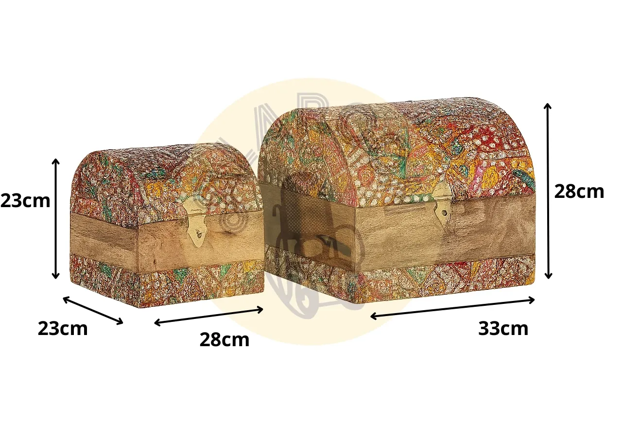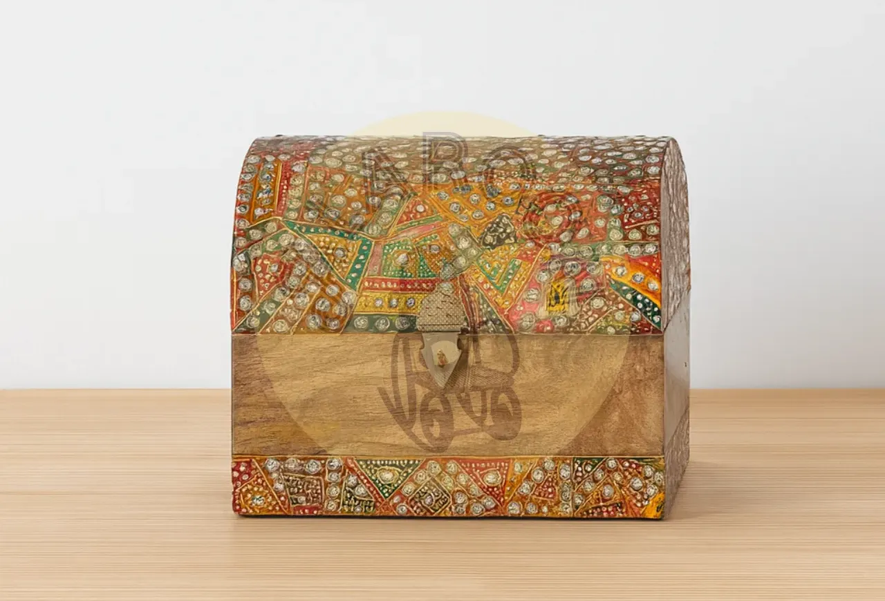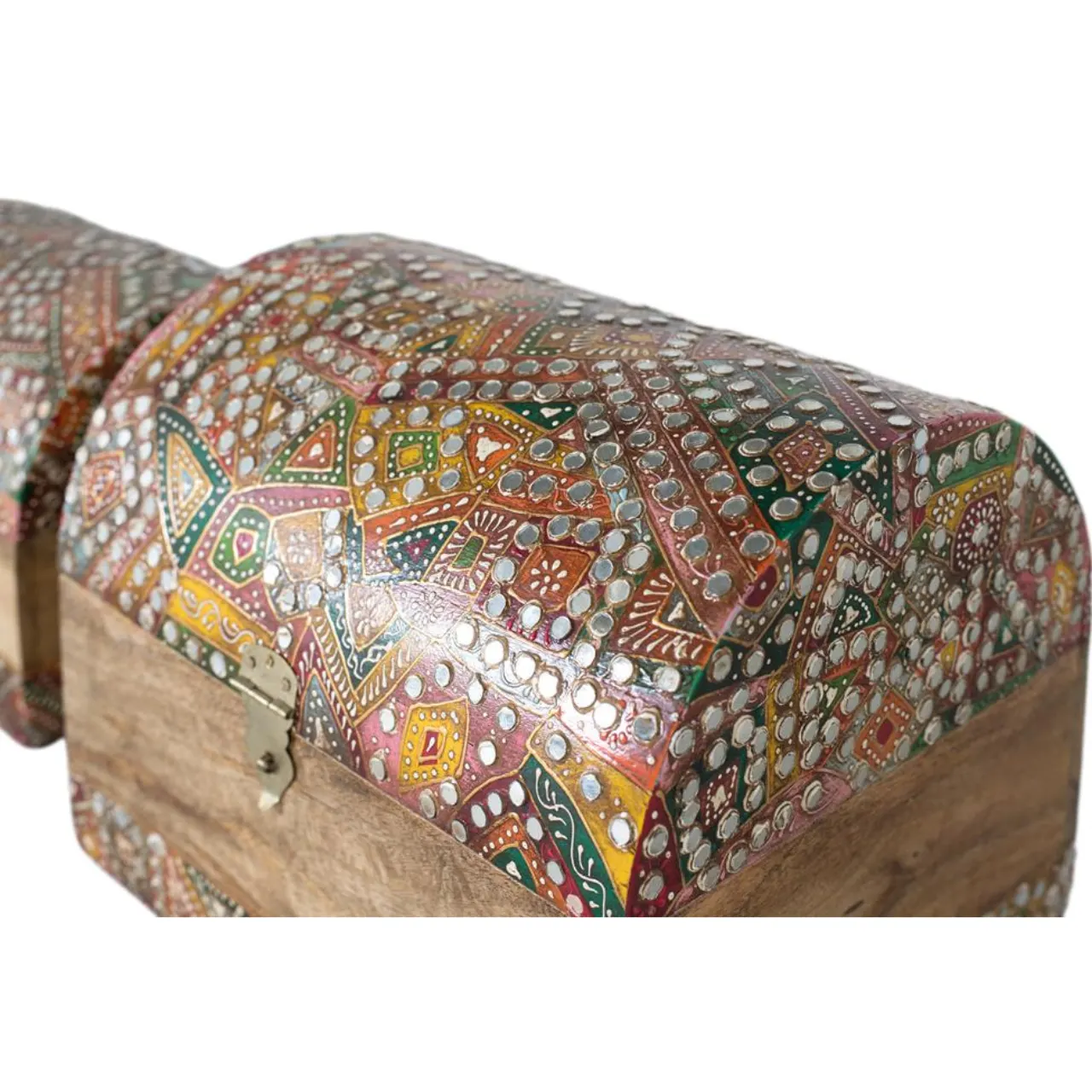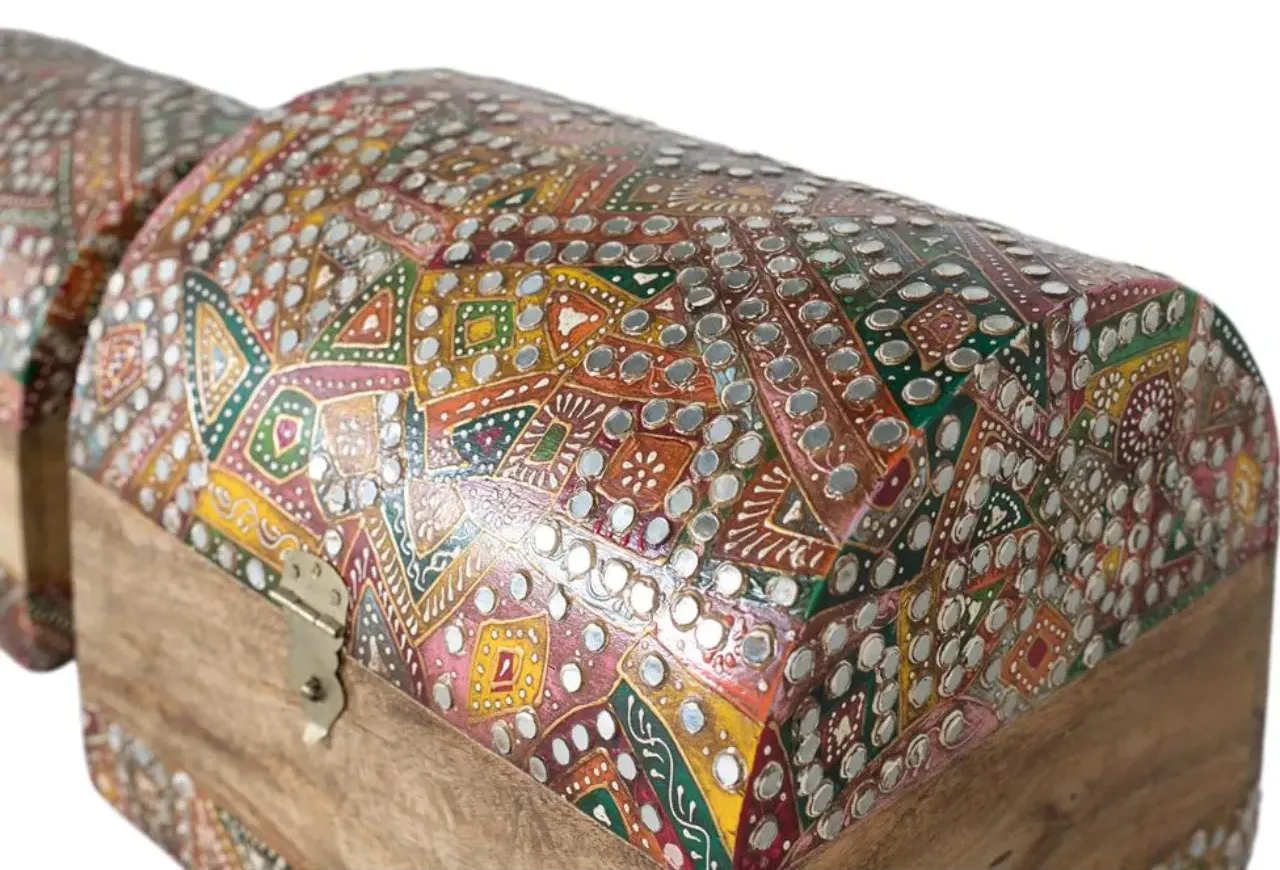 Cada baúl está embellecido con motivos étnicos tradicionales y pequeñas incrustaciones de espejos, aportando luminosidad y un estilo artesanal único. Su superficie pintada a mano convierte a cada pieza en un elemento exclusivo.