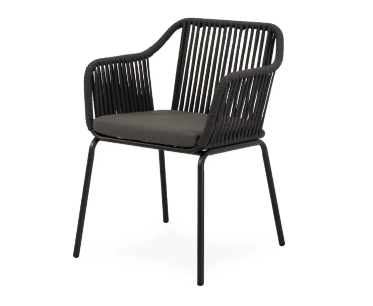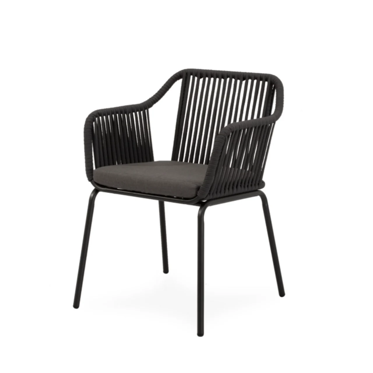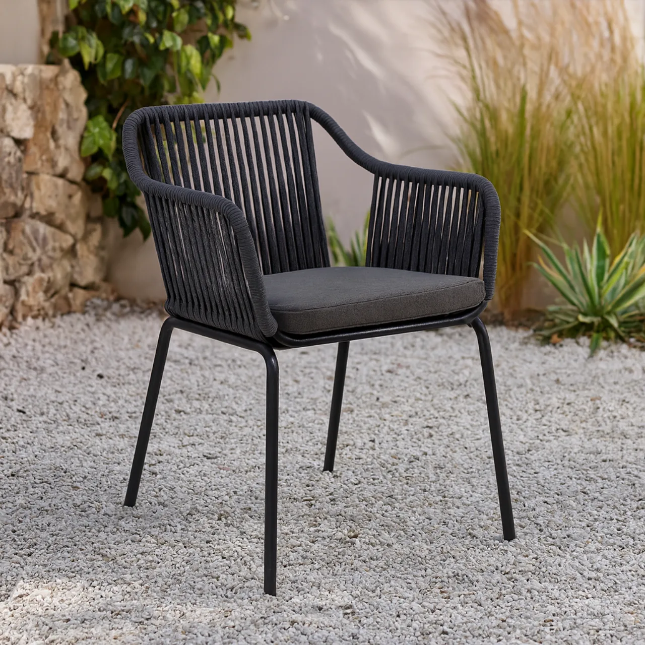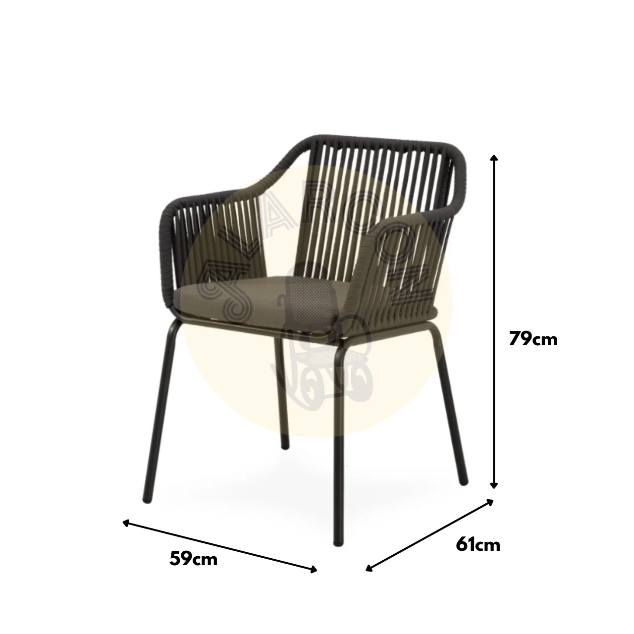 Con unas patas de acero galvanizado tratadas para resistir la intemperie, la silla garantiza estabilidad y durabilidad, creando un elegante contraste con el tejido de cuerda en color Habana/Gris Oscuro. Su construcción robusta soporta hasta 120 kg, perfecta para uso exterior.