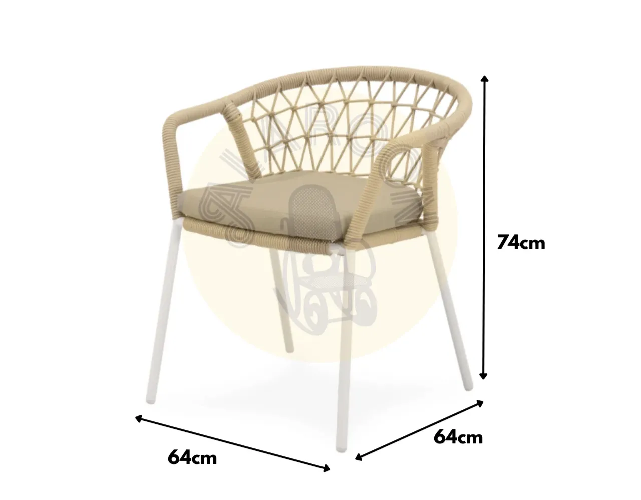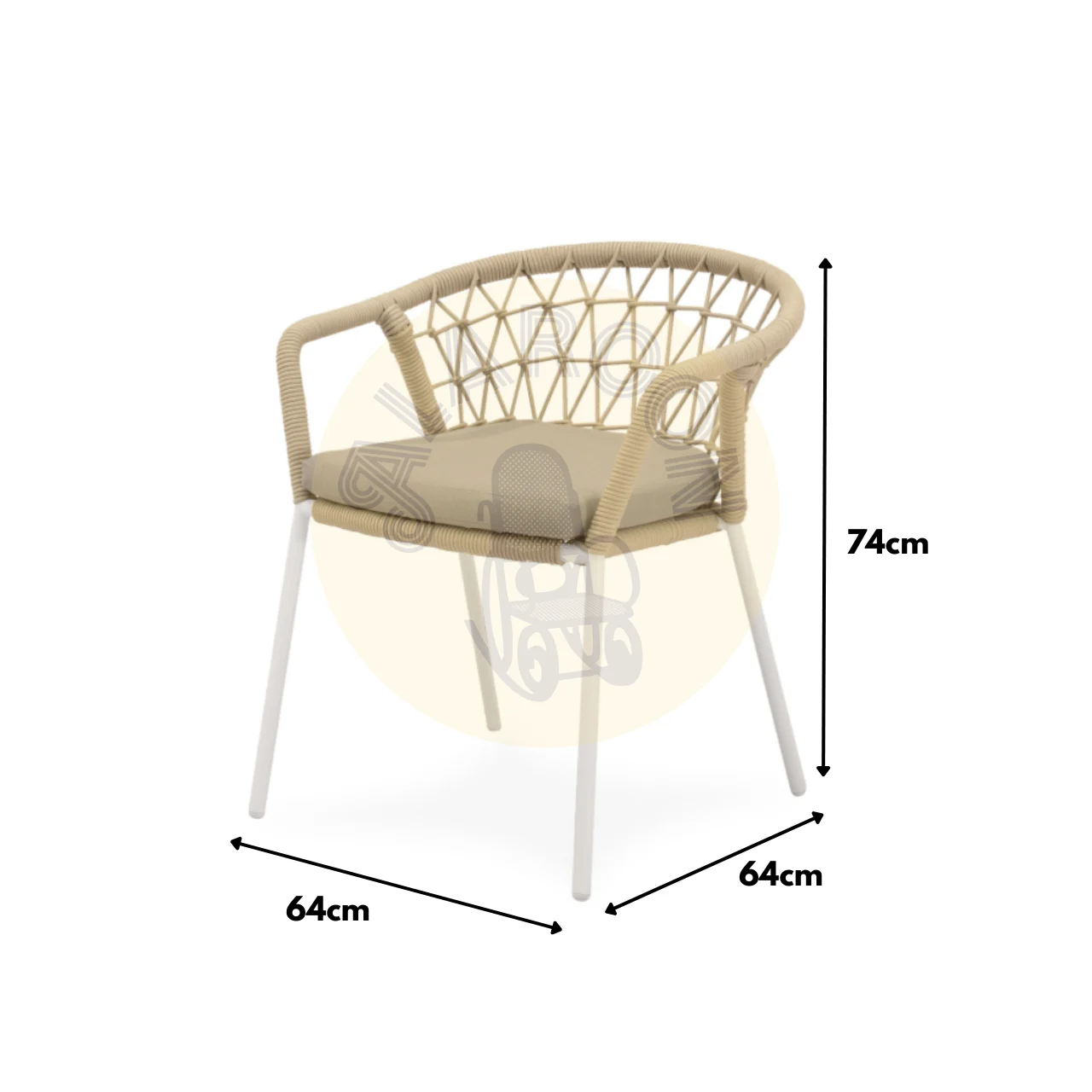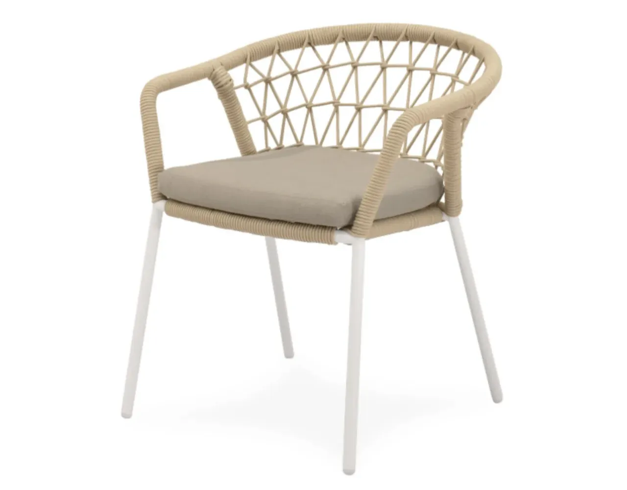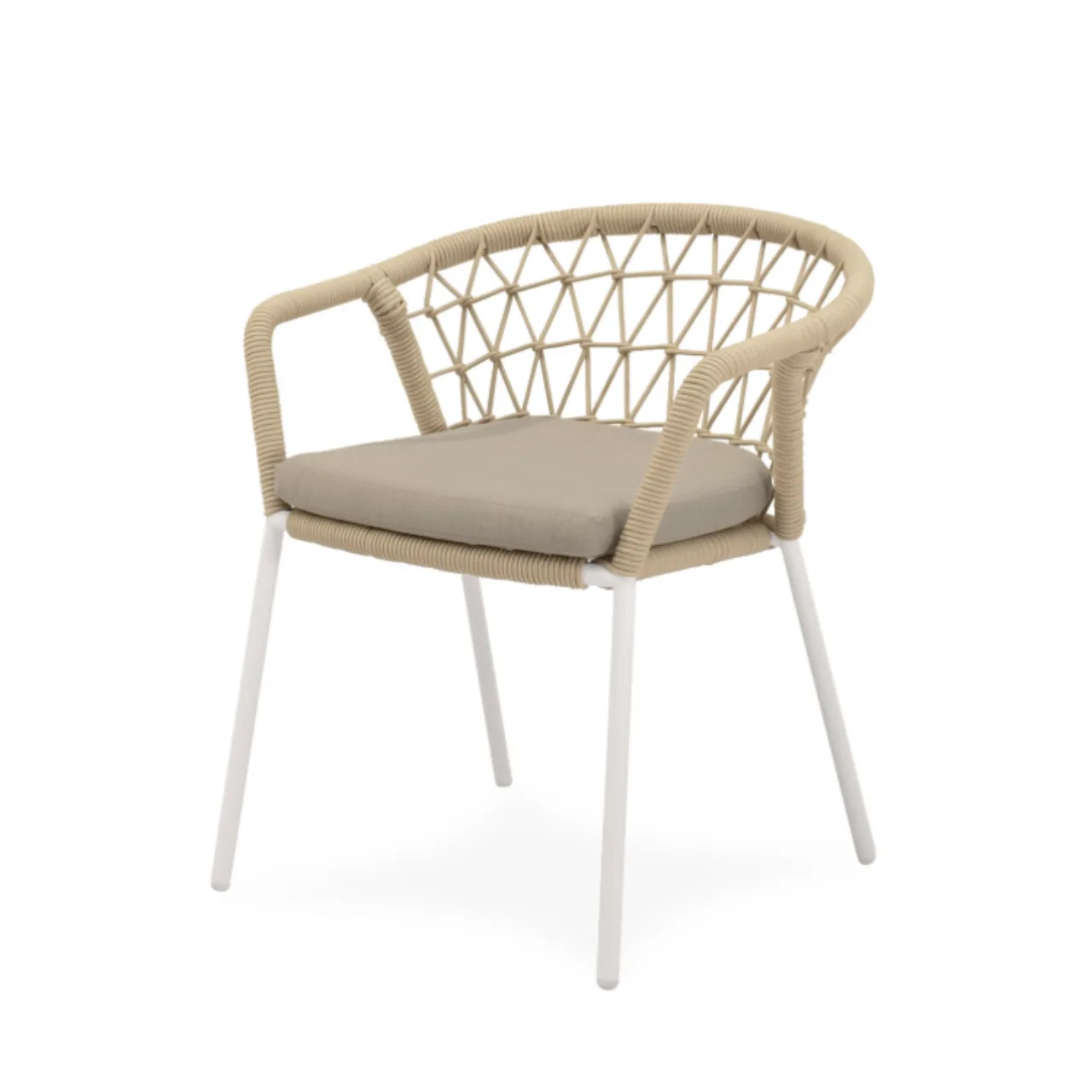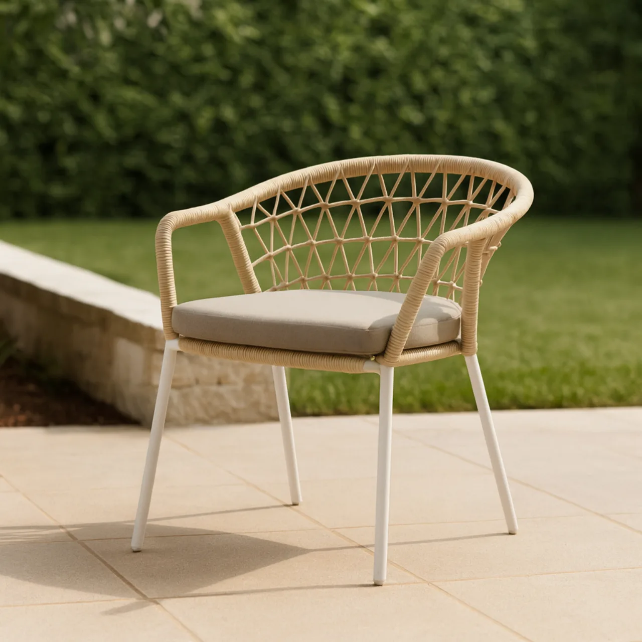 La silla de exterior SOLENE combina un entramado de cuerda resistente con un diseño envolvente que rodea el respaldo y los reposabrazos, ofreciendo soporte ergonómico y un efecto visual atractivo. Disponible en tonos naturales, se integra con elegancia en terrazas, jardines o patios, aportando un ambiente contemporáneo y acogedor.