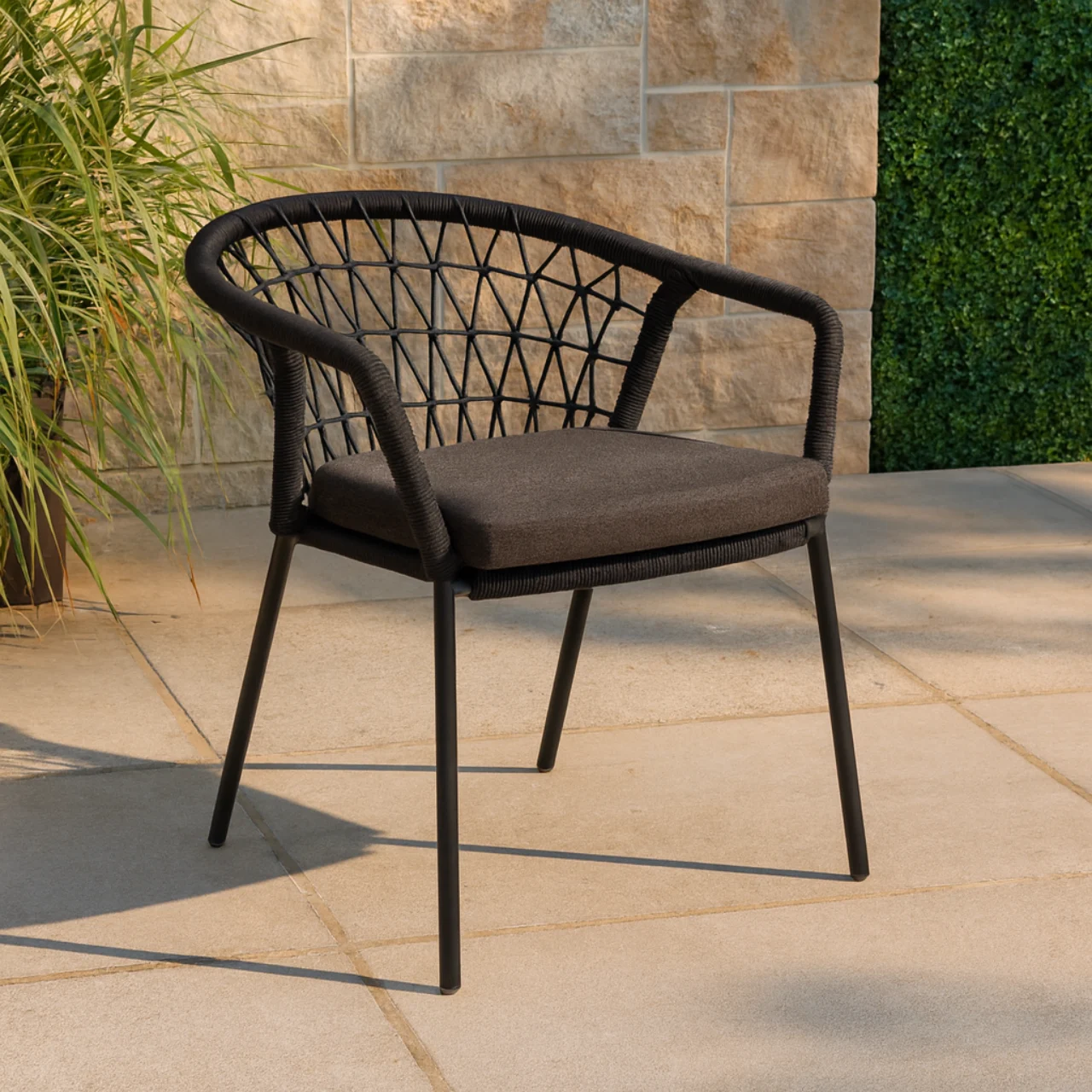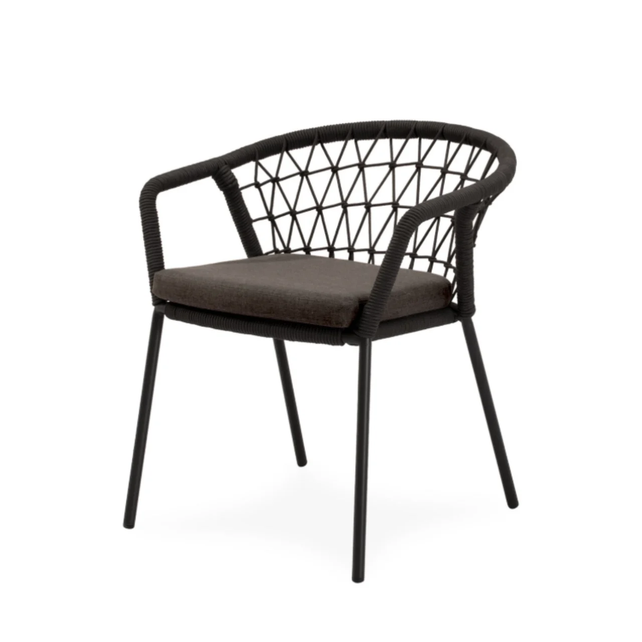 La silla de exterior SOLENE combina un entramado de cuerda resistente con un diseño envolvente que rodea el respaldo y los reposabrazos, ofreciendo soporte ergonómico y un efecto visual atractivo. Disponible en tonos naturales, se integra con elegancia en terrazas, jardines o patios, aportando un ambiente contemporáneo y acogedor.