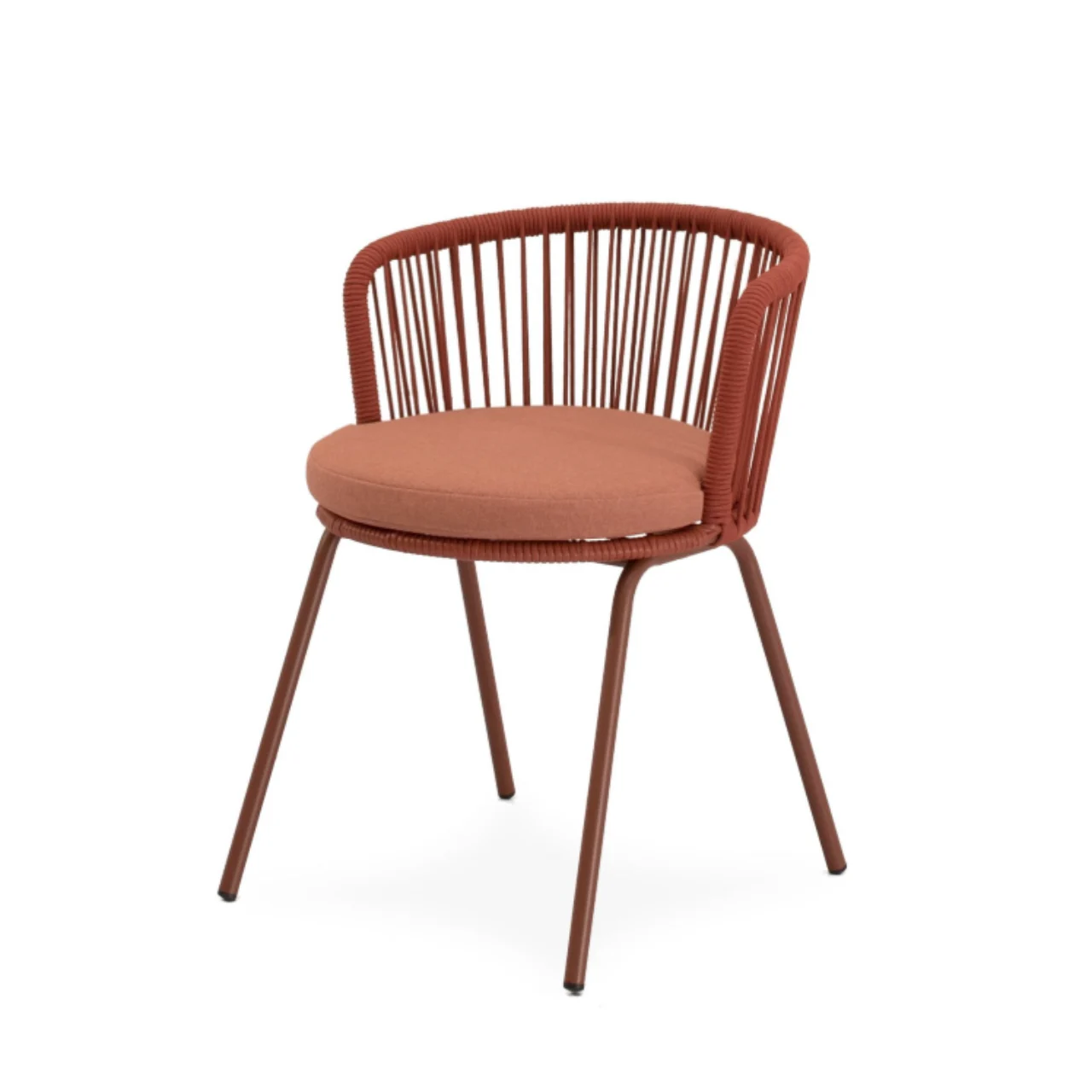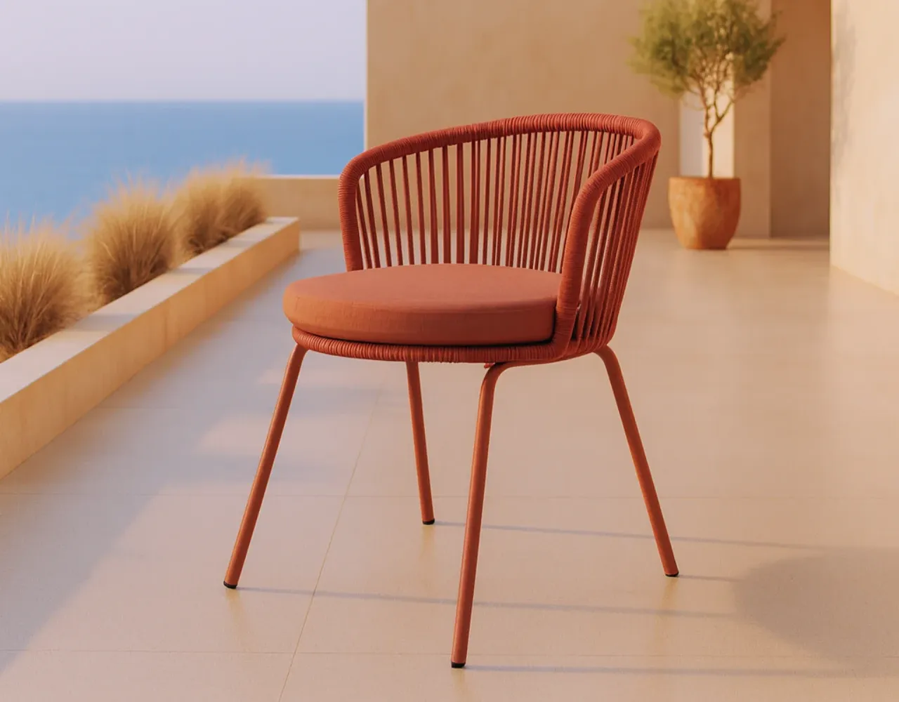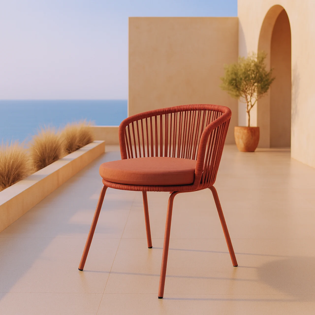 La silla de exterior VILMA combina un asiento y respaldo tejidos en cuerda resistente con líneas suaves y envolventes, ofreciendo comodidad y estilo en terrazas, balcones o jardines. Disponible en beige, gris, verde y terracota, aporta un toque natural que se integra fácilmente en cualquier ambiente exterior.