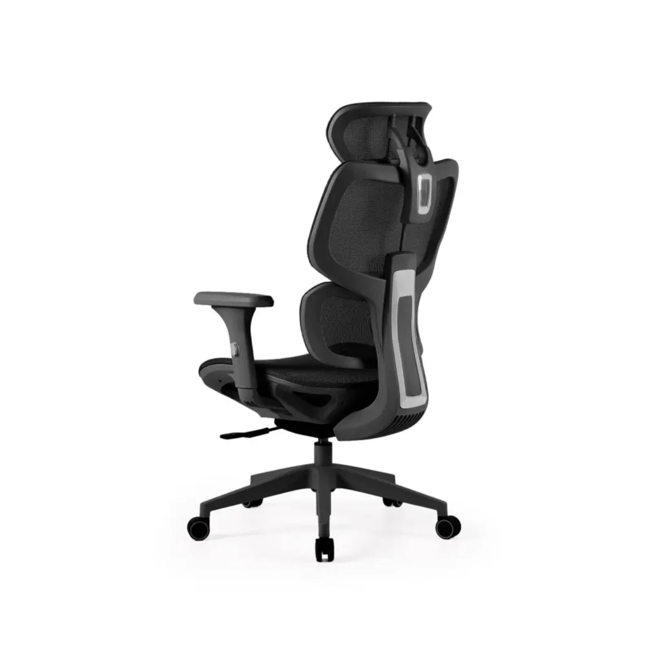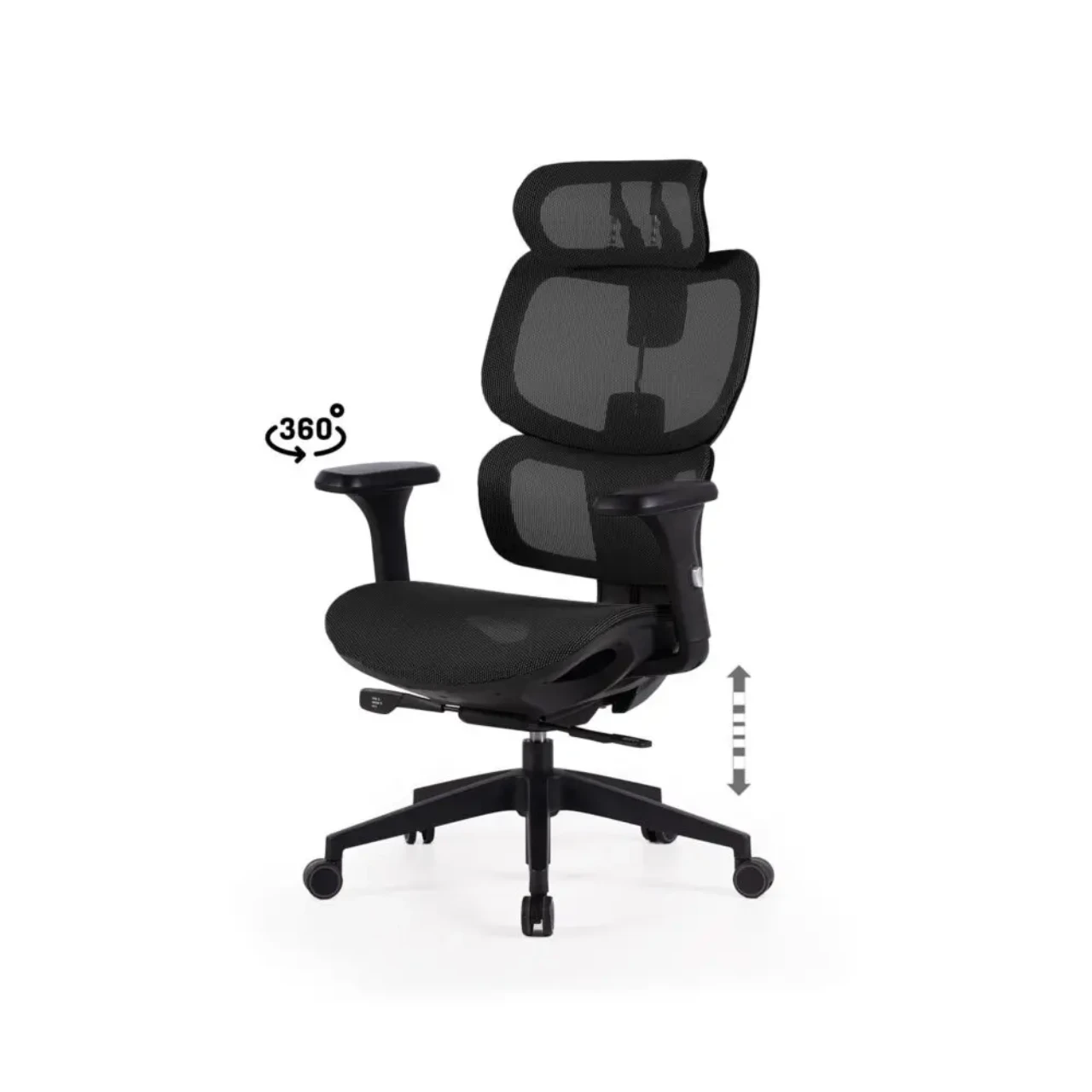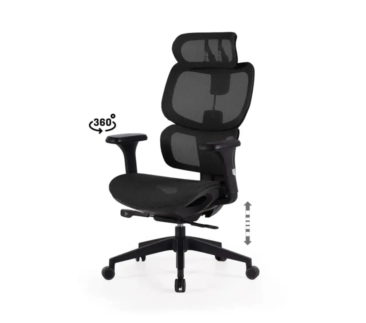 Fabricada en malla transpirable negra, mantiene una ventilación constante que evita la acumulación de calor. Su estructura giratoria 360º y altura regulable permiten una movilidad total, adaptándose fácilmente a diferentes tipos de escritorio.
