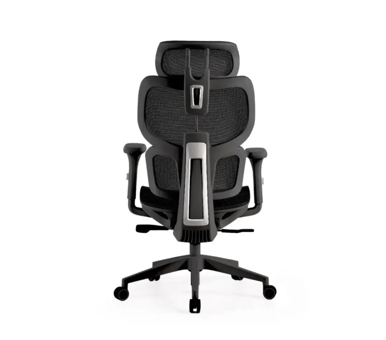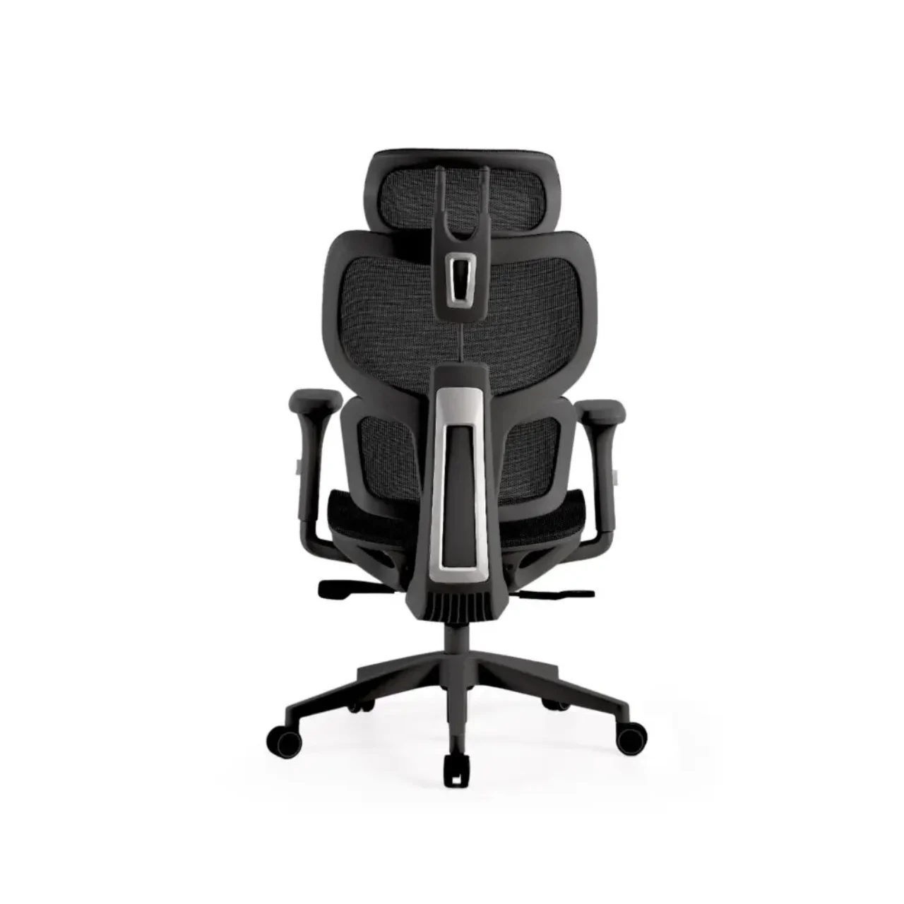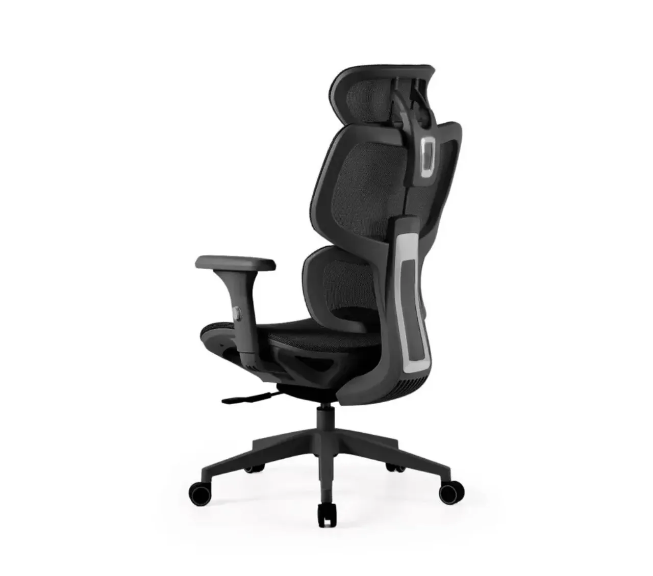 Fabricada en malla transpirable negra, mantiene una ventilación constante que evita la acumulación de calor. Su estructura giratoria 360º y altura regulable permiten una movilidad total, adaptándose fácilmente a diferentes tipos de escritorio.