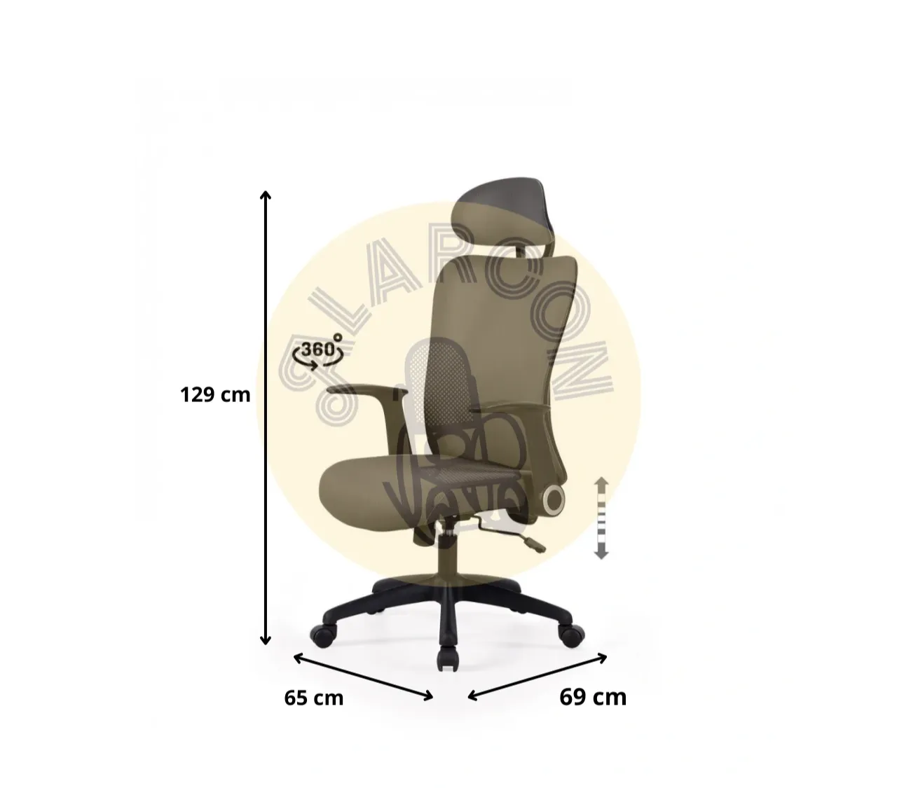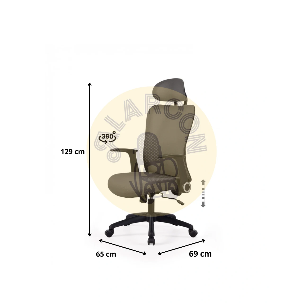 Cuenta con una estructura resistente que soporta hasta 150 kg, además de brazos regulables y una base giratoria de 360º que facilita el movimiento. Las medidas totales son 65 cm de ancho, 69 cm de fondo y una altura ajustable entre 115 y 129 cm, adaptándose a cada usuario.