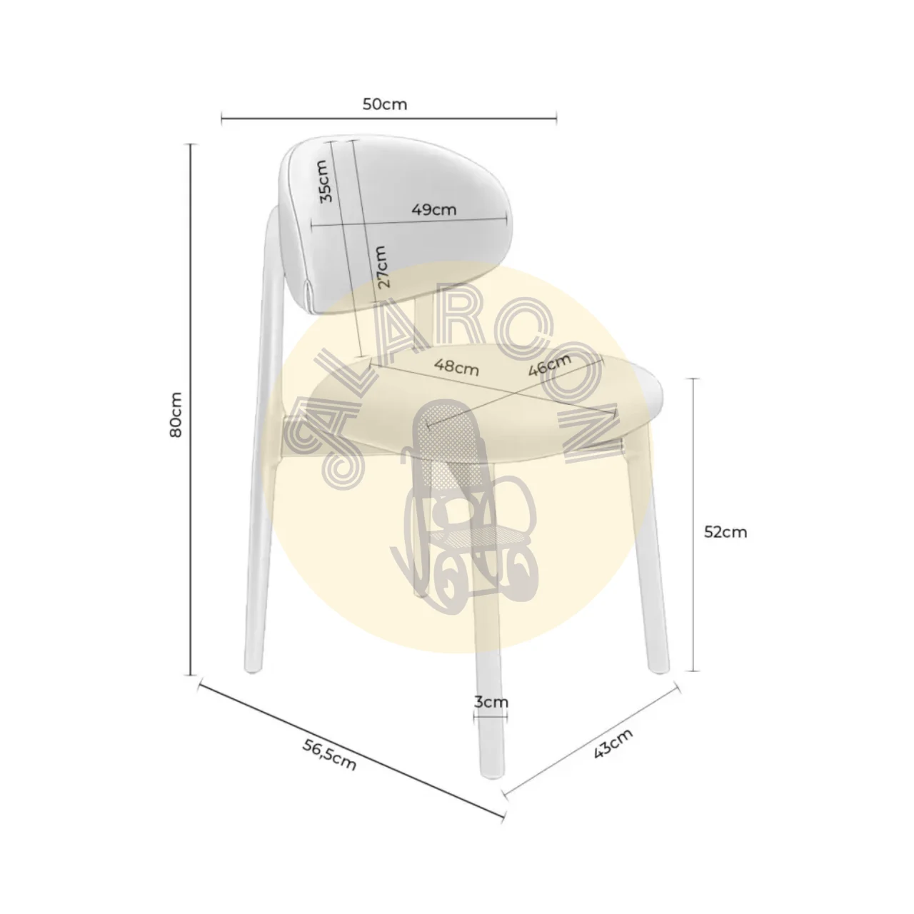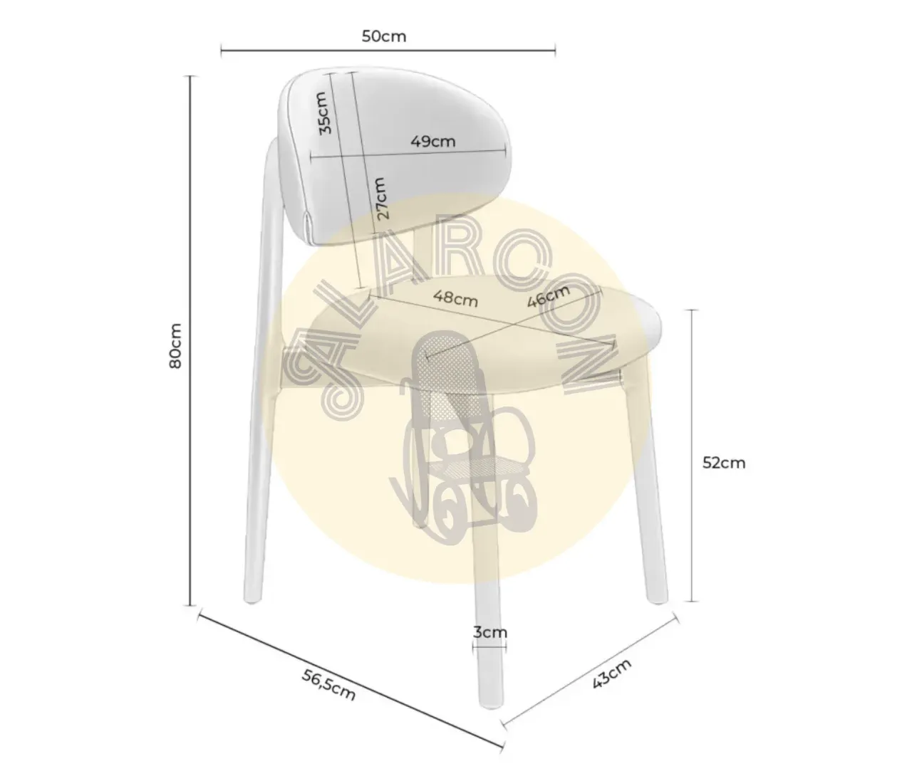 Gracias a sus medidas de 50 cm de ancho y 56,5 cm de fondo, esta silla ofrece comodidad para un uso prolongado. La altura del asiento, con 52 cm desde el suelo, es ideal para diferentes tipos de mesas, mientras que el respaldo de 27 cm proporciona el soporte necesario para un descanso adecuado.