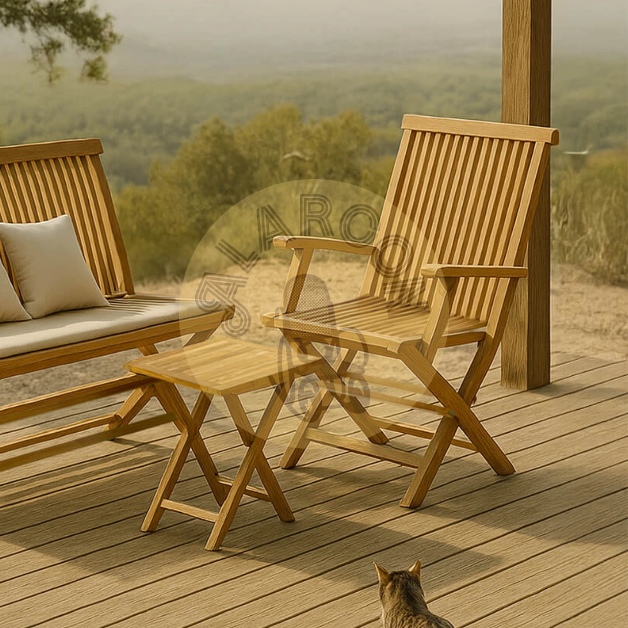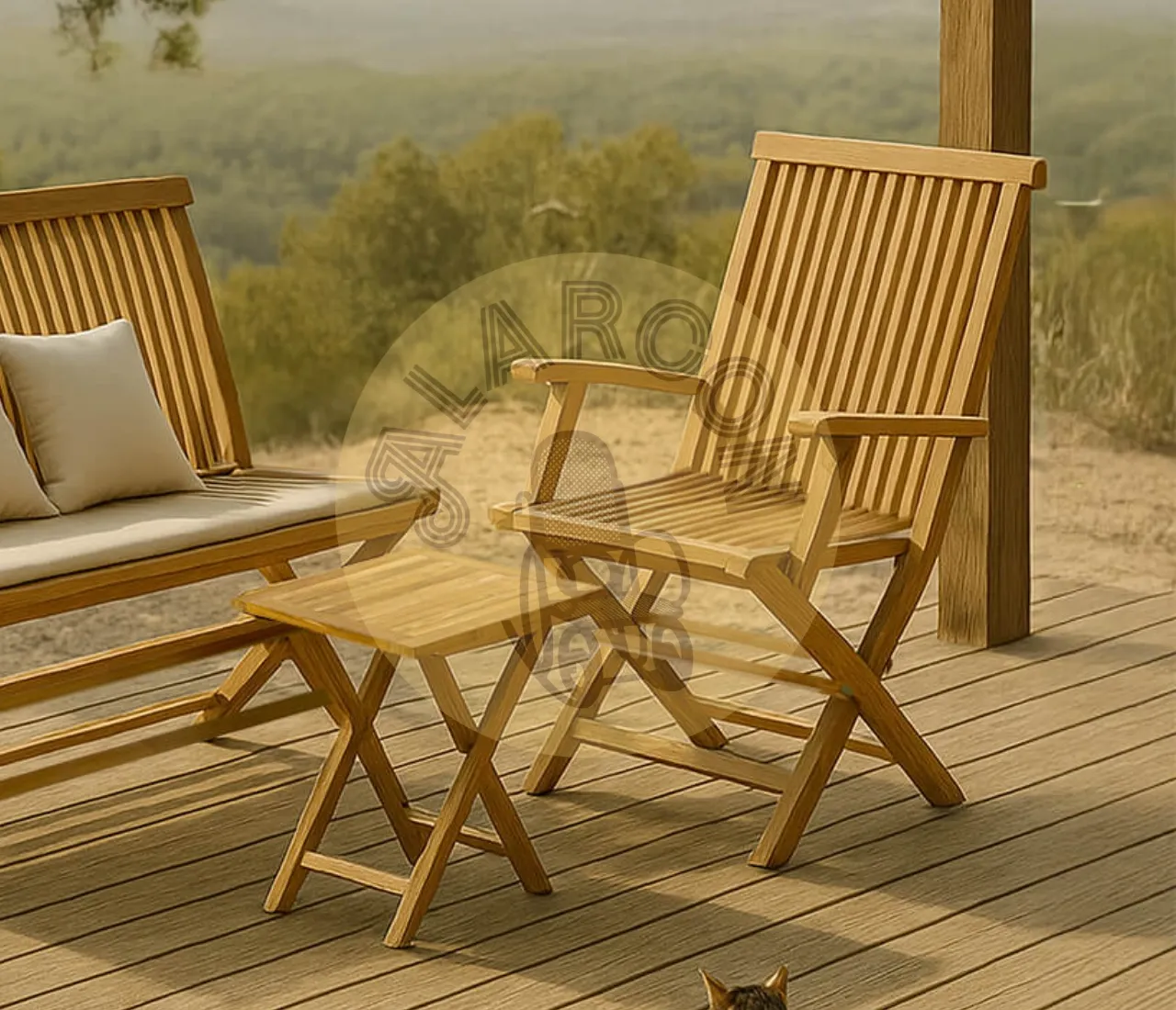 Madera de teca maciza: material resistente y adecuado para uso en exterior, ideal para jardines, terrazas y patios.