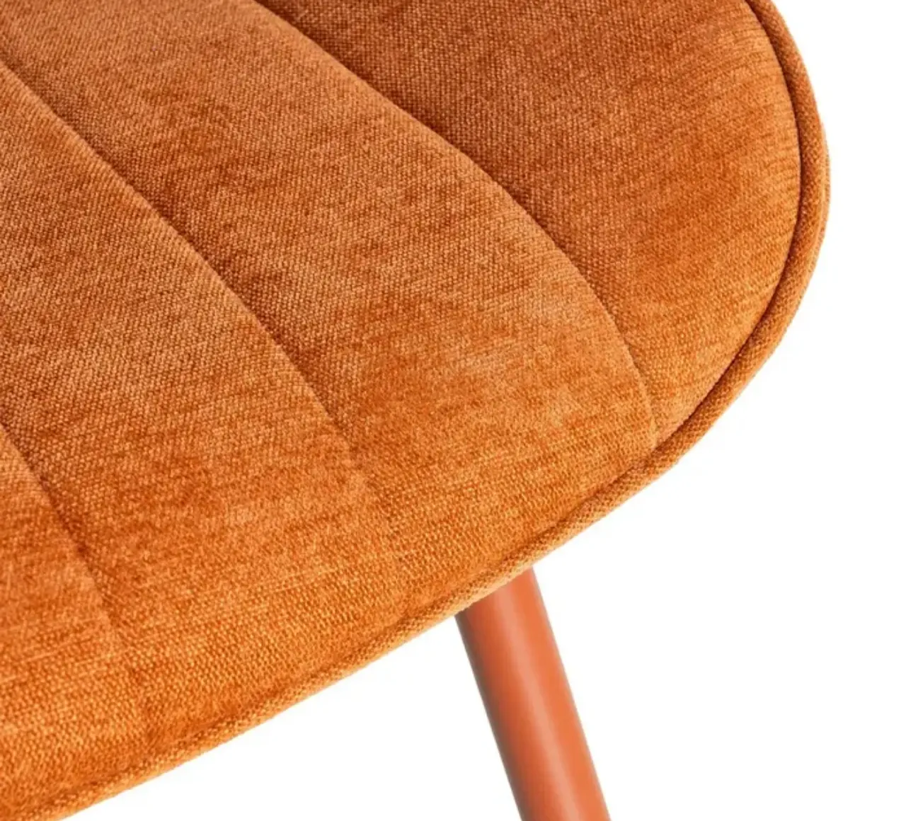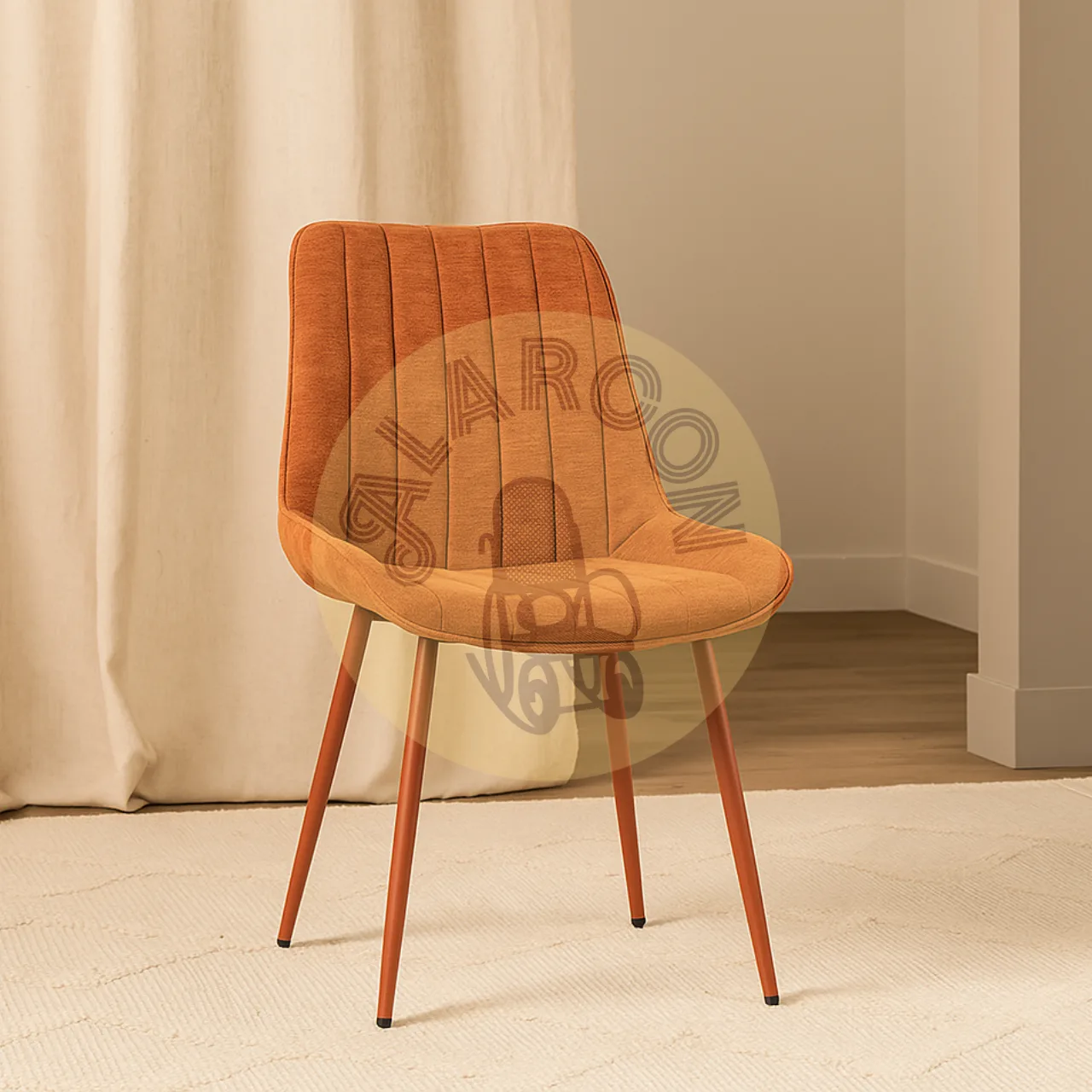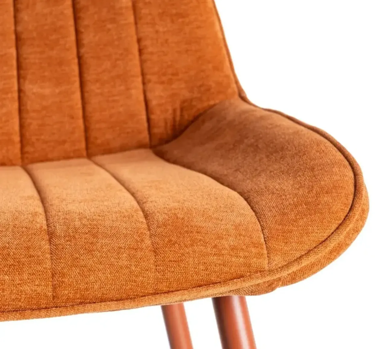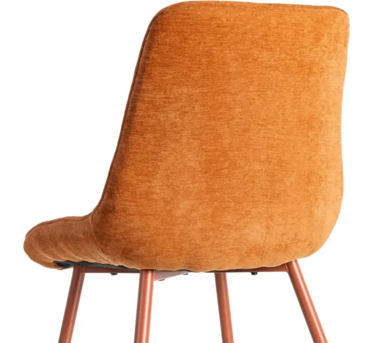 El diseño moderno de esta silla tapizada color teja aporta un toque cálido y contemporáneo a cualquier espacio. Su estructura combina tejido 100% poliéster con patas de hierro, creando un equilibrio entre comodidad y resistencia ideal para el uso diario.