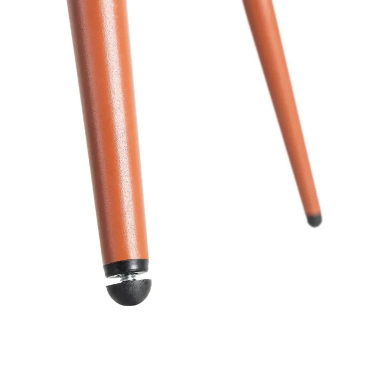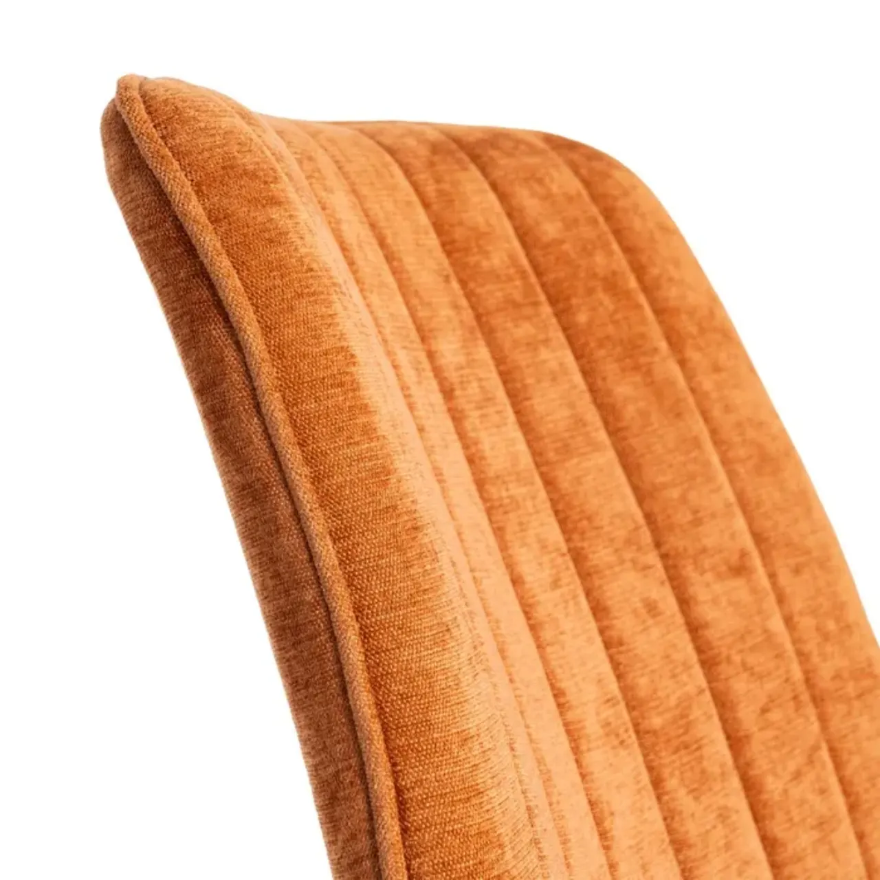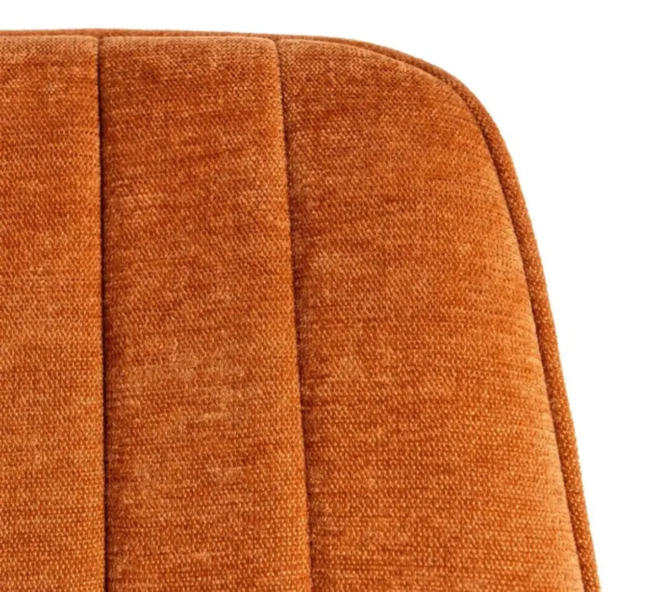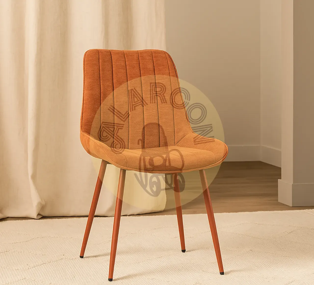 El diseño moderno de esta silla tapizada color teja aporta un toque cálido y contemporáneo a cualquier espacio. Su estructura combina tejido 100% poliéster con patas de hierro, creando un equilibrio entre comodidad y resistencia ideal para el uso diario.