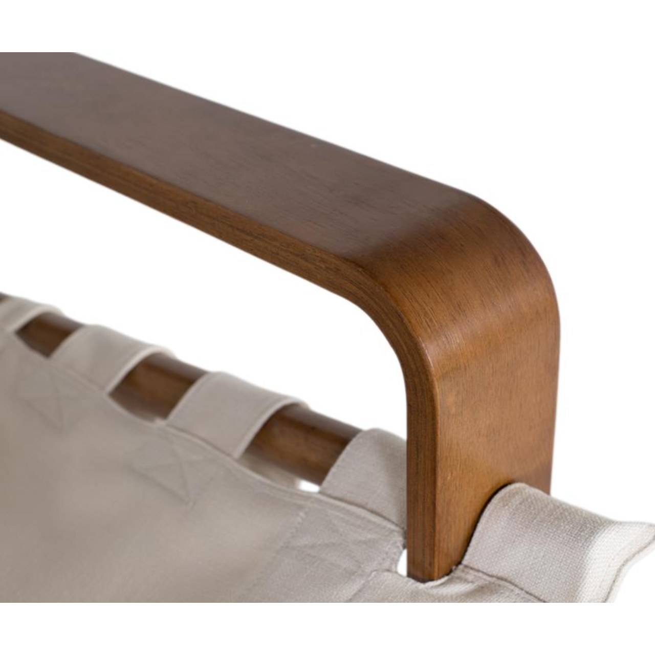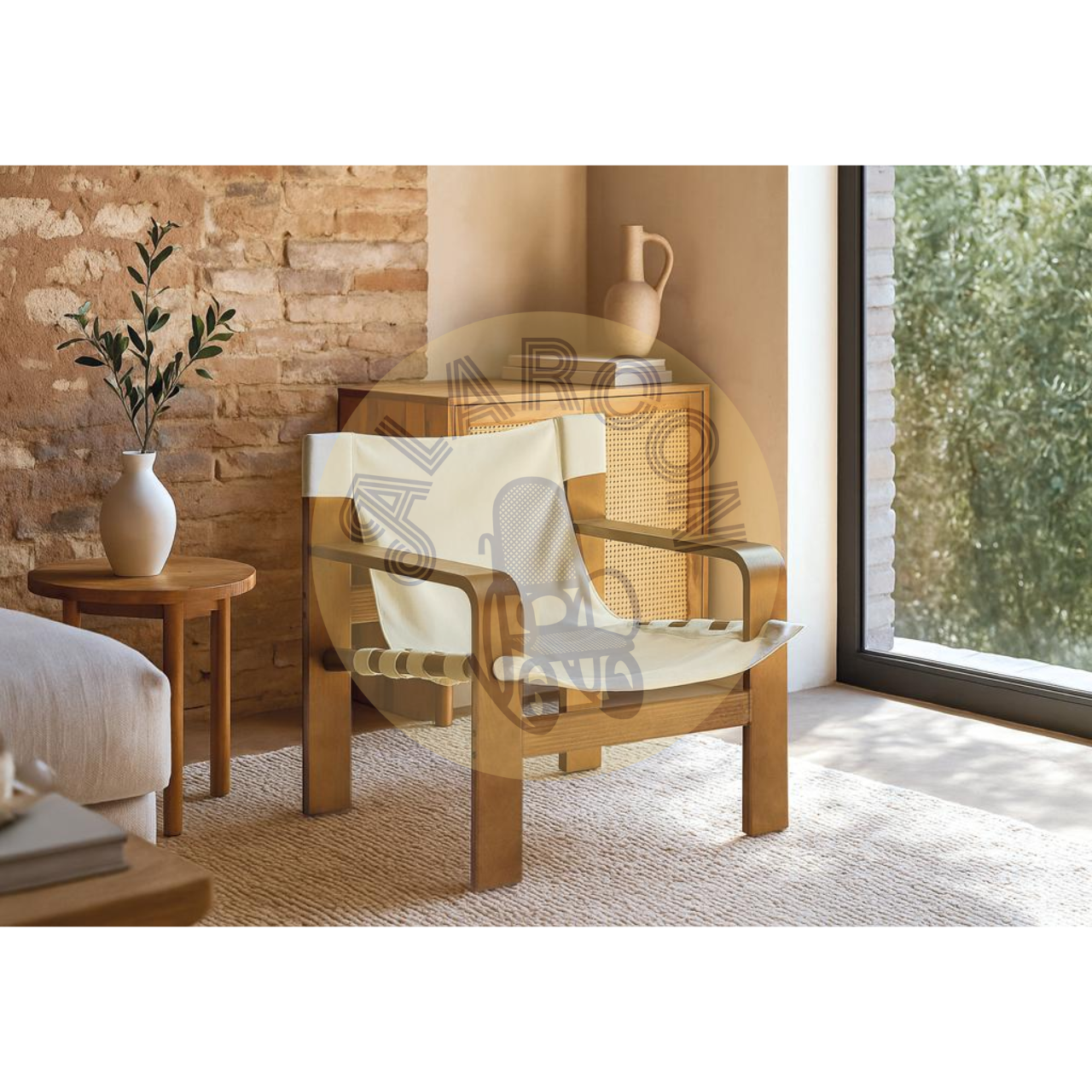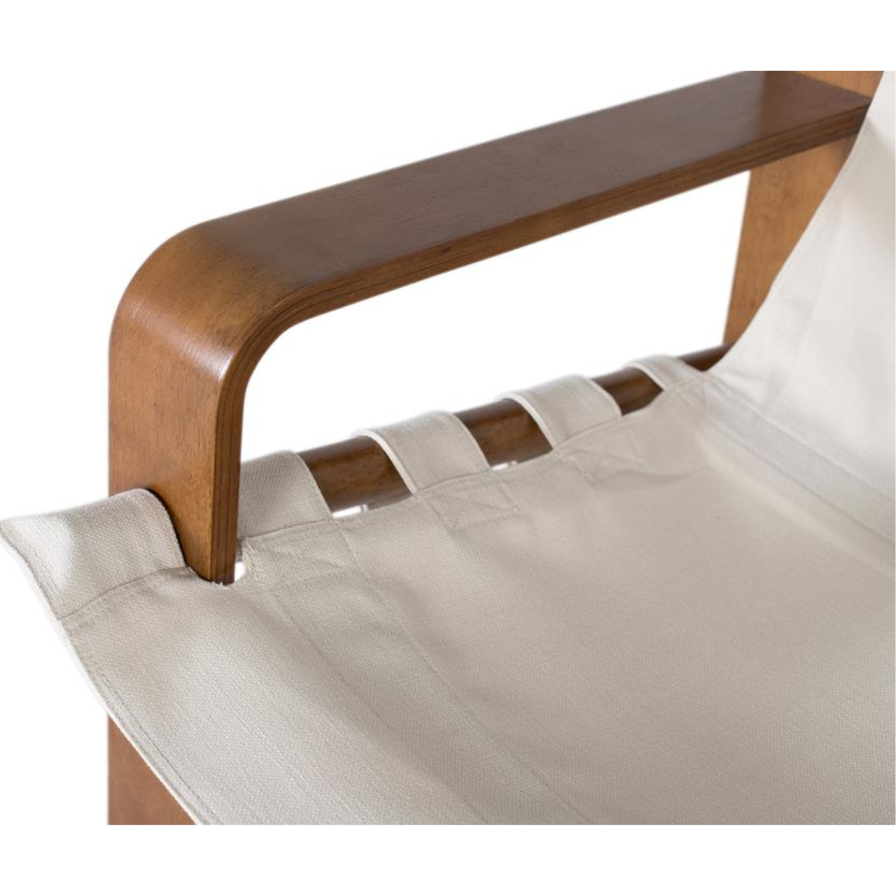 El asiento y respaldo en lona beige crean una superficie flexible que se ajusta al cuerpo al sentarse, ofreciendo una comodidad envolvente sin necesidad de acolchado. Su textura suave aporta un aspecto relajado y natural, ideal para un ambiente acogedor.