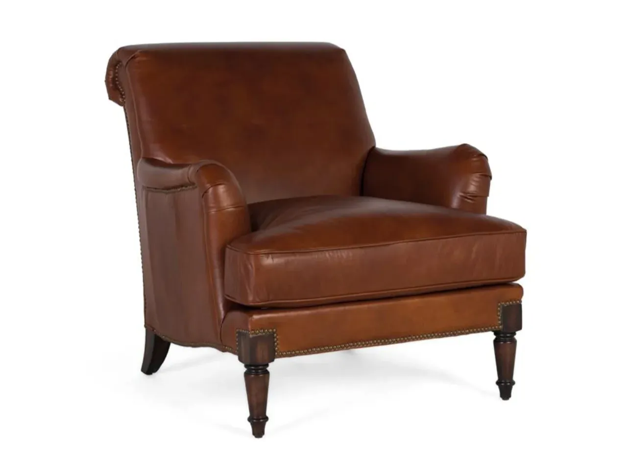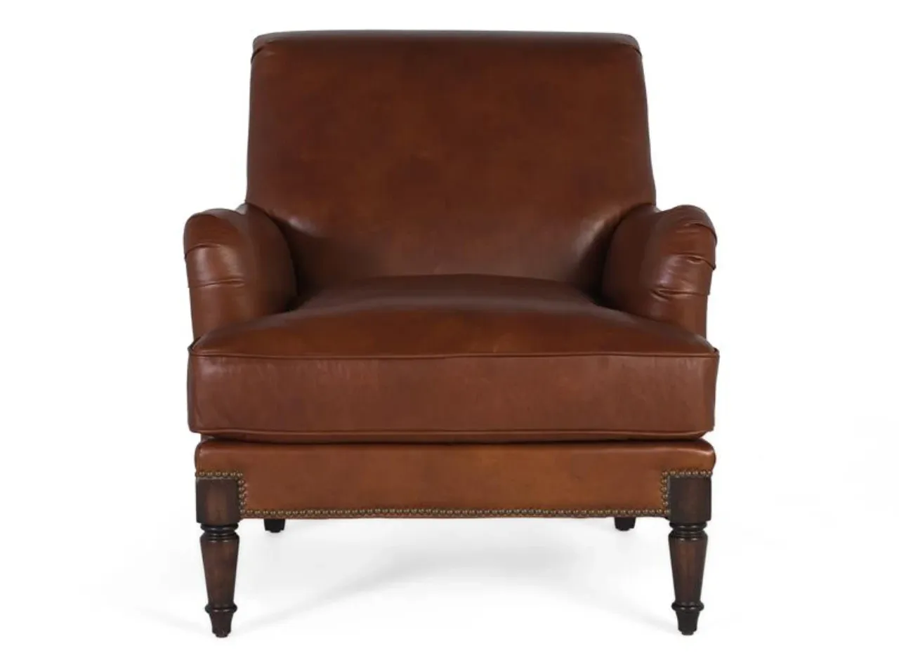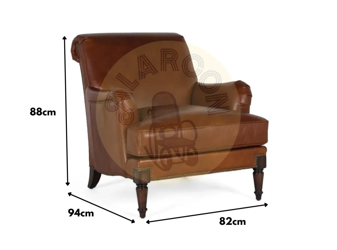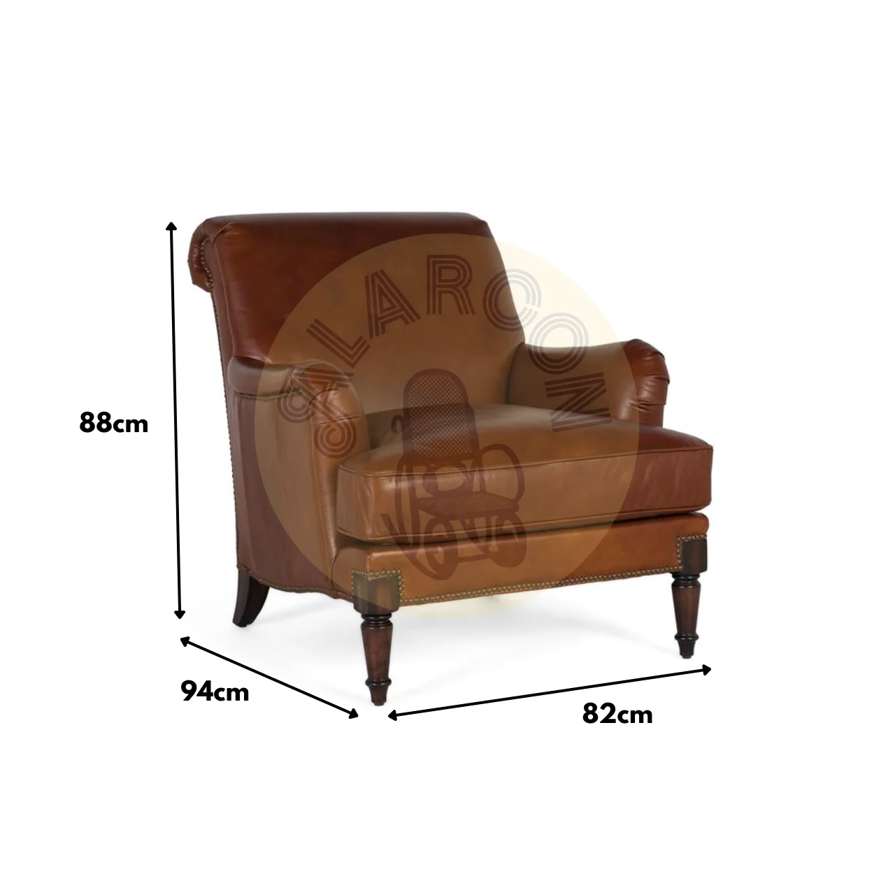 El sillón de piel marrón destaca por su acabado cálido y resistente, tapizado en cuero 100% de alta calidad que aporta suavidad y durabilidad. Su diseño combina comodidad con un aire clásico y elegante.