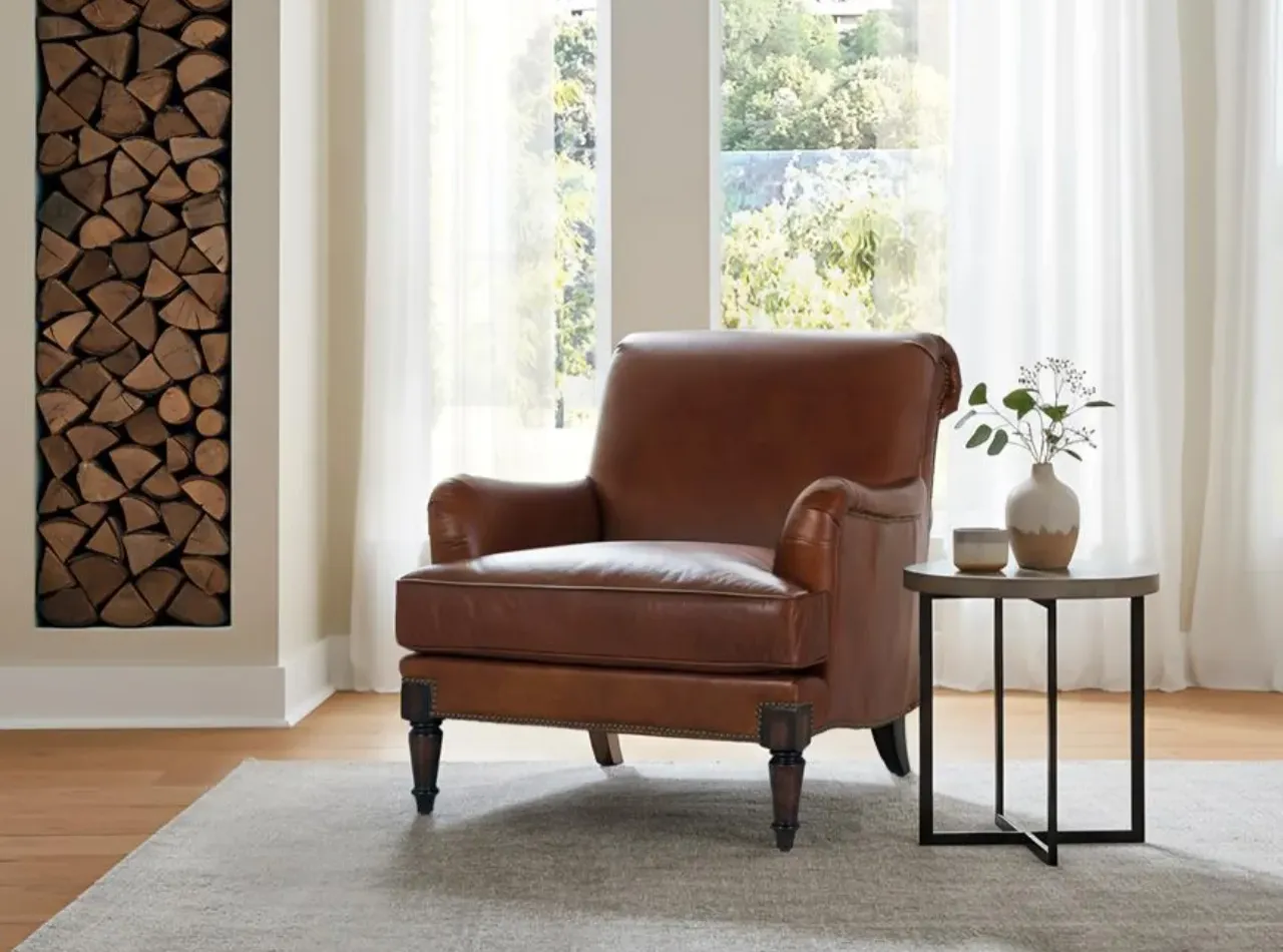 Acabado cálido y resistente: sillón de piel marrón con aire elegante y atemporal.