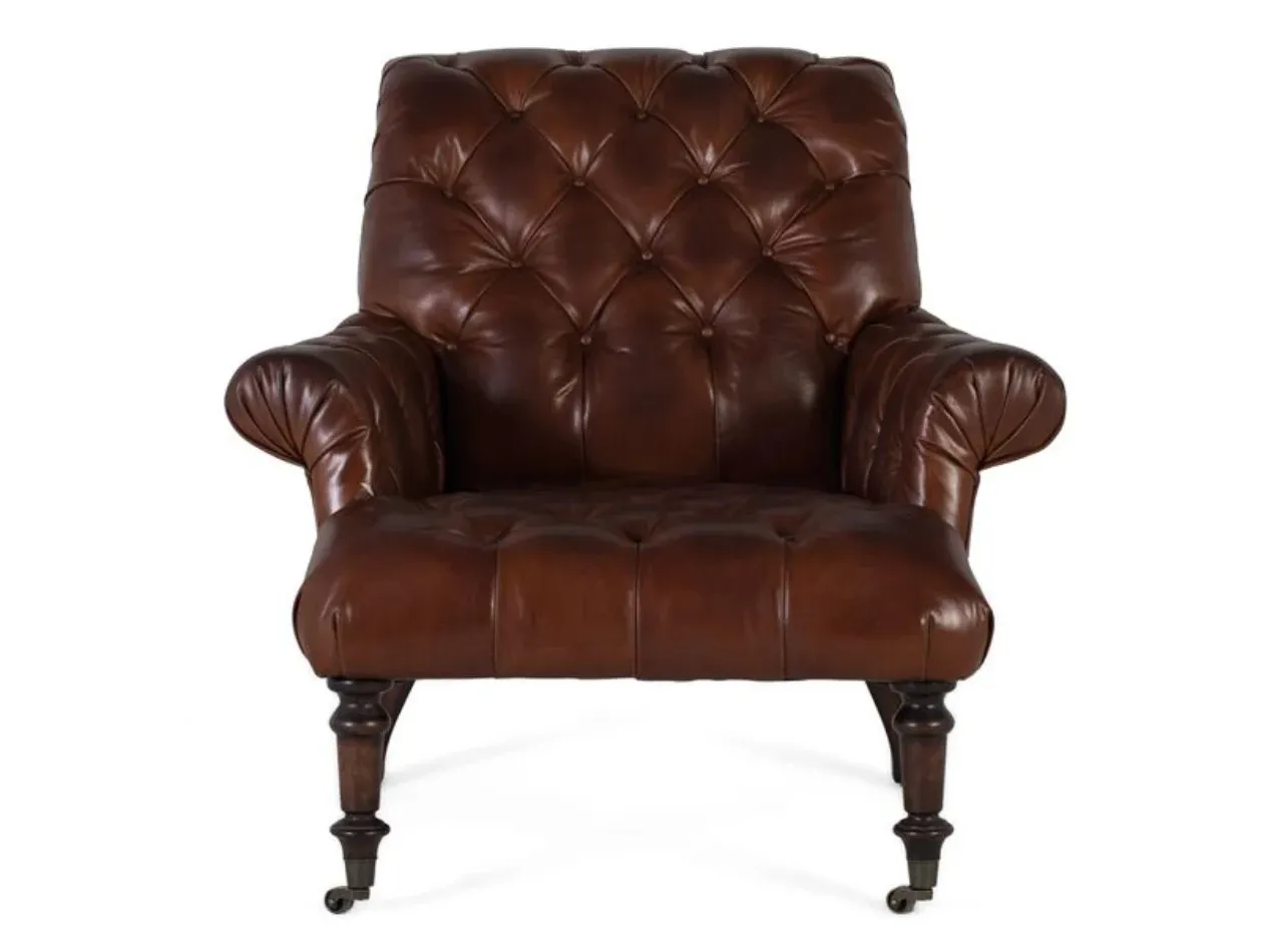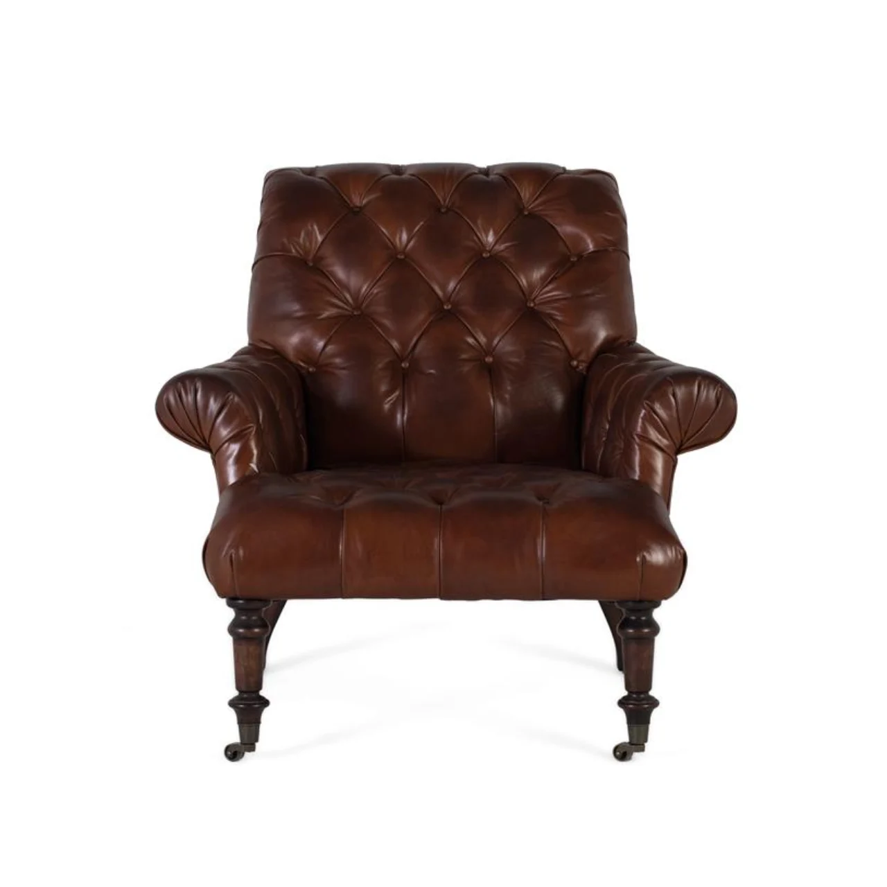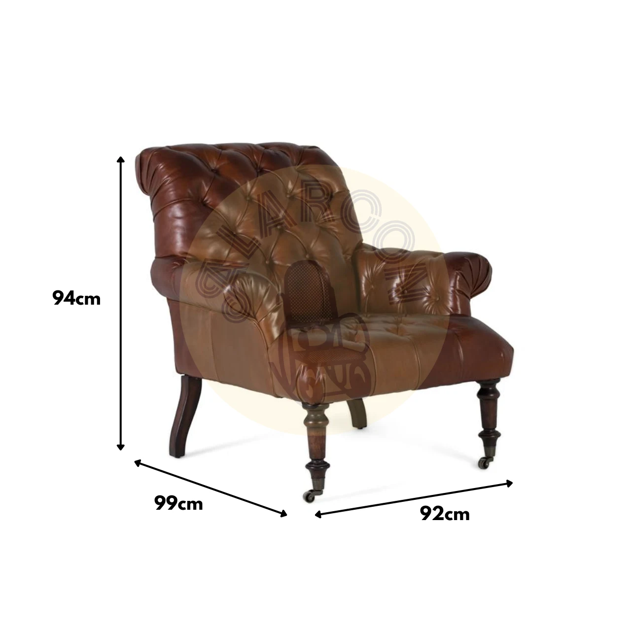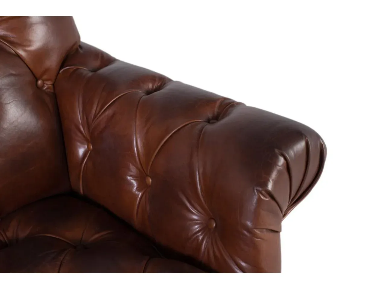 El sillón de piel en tono marrón oscuro se distingue por su acabado en capitoné, que aporta un estilo clásico atemporal y un carácter elegante al salón. Su respaldo alto y los brazos amplios aseguran una experiencia cómoda y sofisticada.