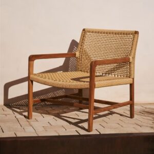 Este sillón destaca por su durabilidad gracias a la resistencia de los materiales utilizados. La madera de teca es conocida por su capacidad para resistir las inclemencias del tiempo, mientras que el mimbre sintético aporta un toque moderno y resistente.